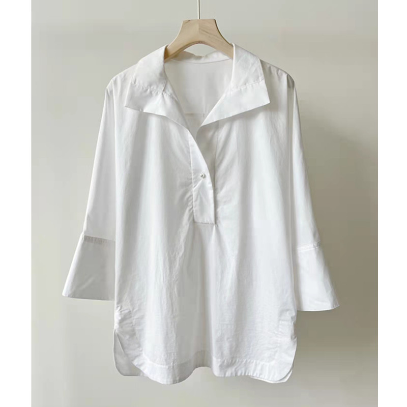 봄 여름 신상품, 같은 스타일, 루즈하고 캐주얼하며 활용도가 높은 스탠드 칼라 5부 소매 셔츠, 슬릿 탑, 여성 패셔너블하고 다용도