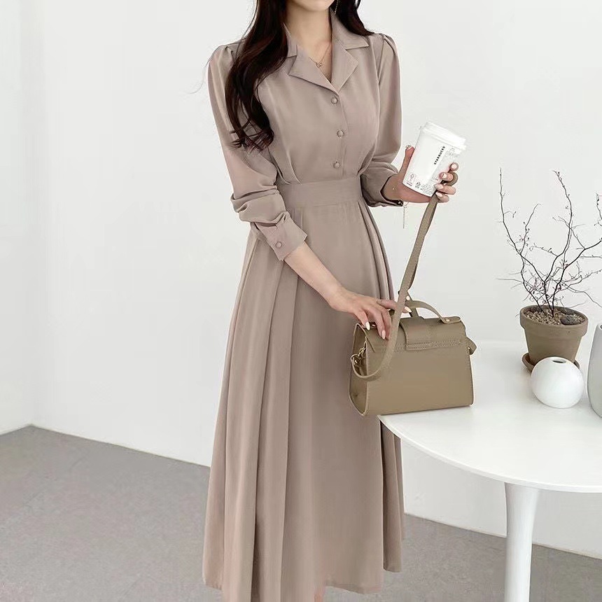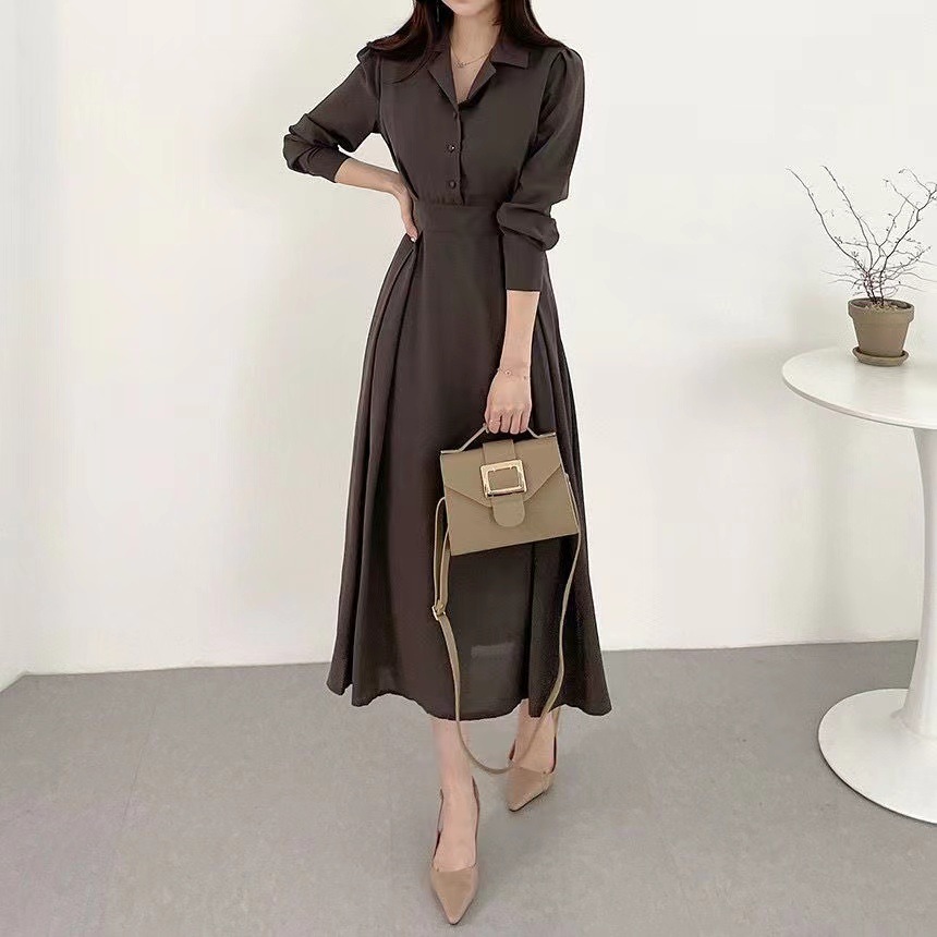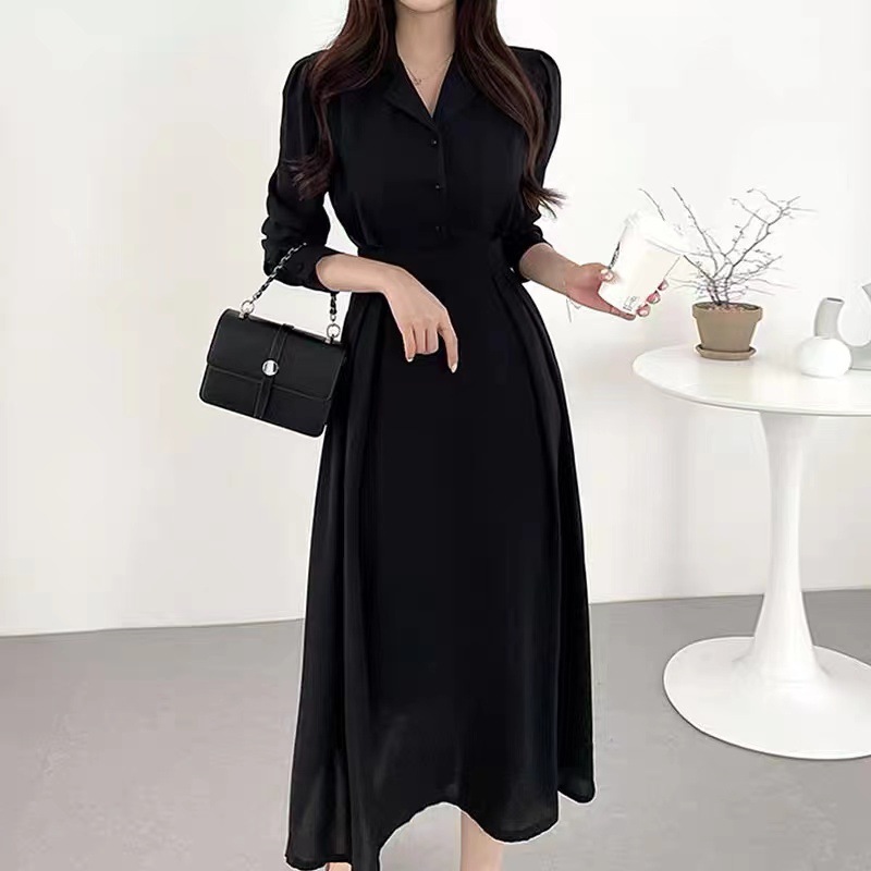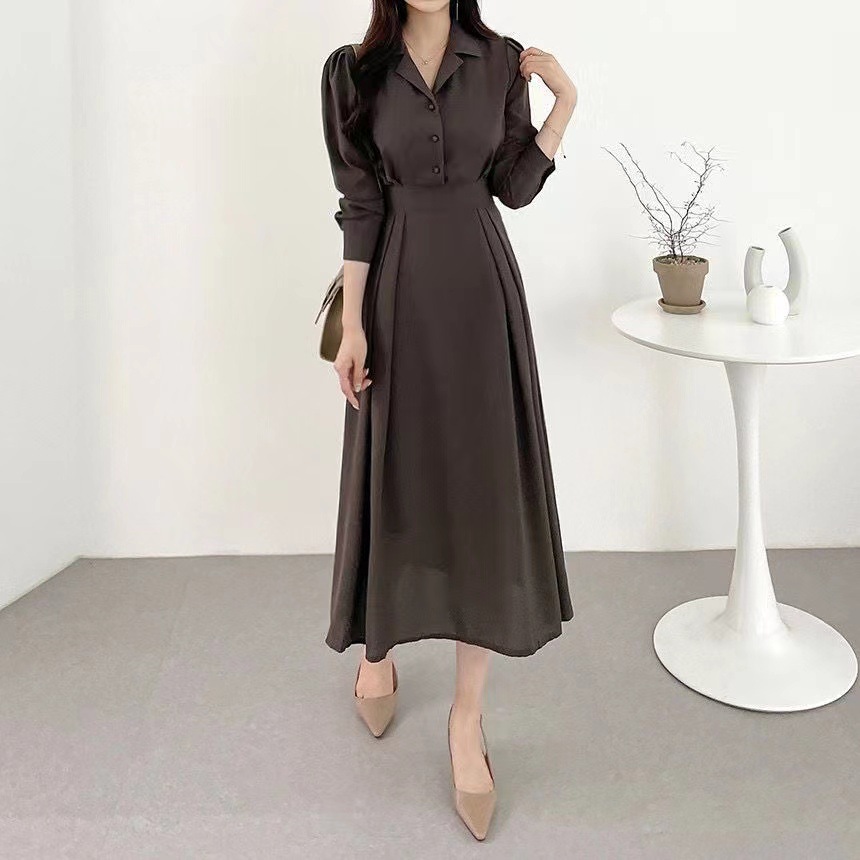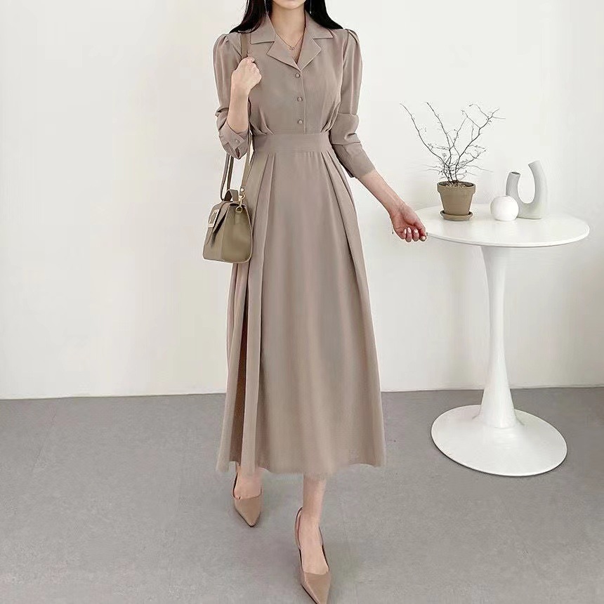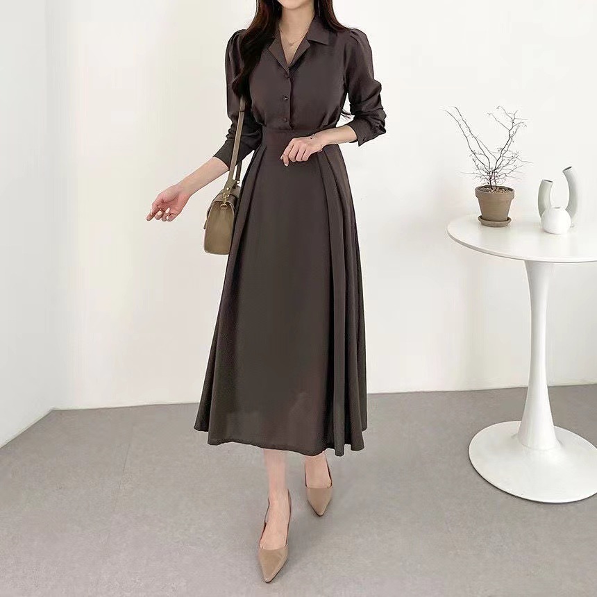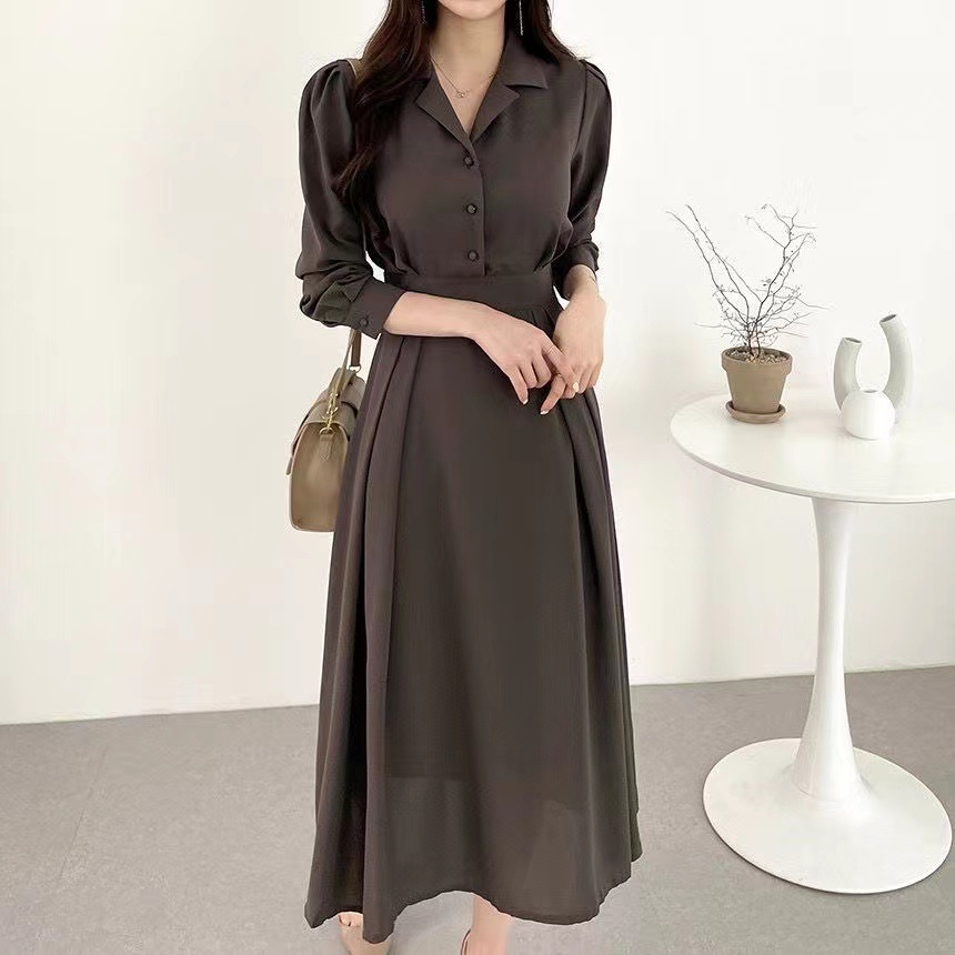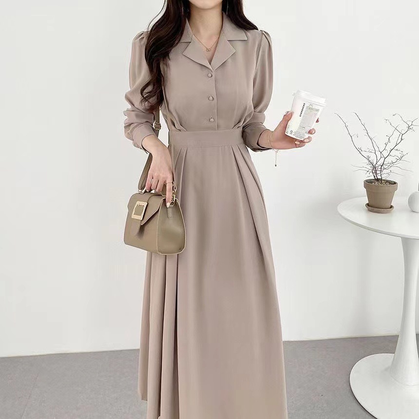 2025 한국 세련된 봄 새로운 스타일 가벼운 성숙한 허리 폴로 칼라 드레스 퍼프 슬리브 슬림 셔츠 a 라인 스커트스토어 가기