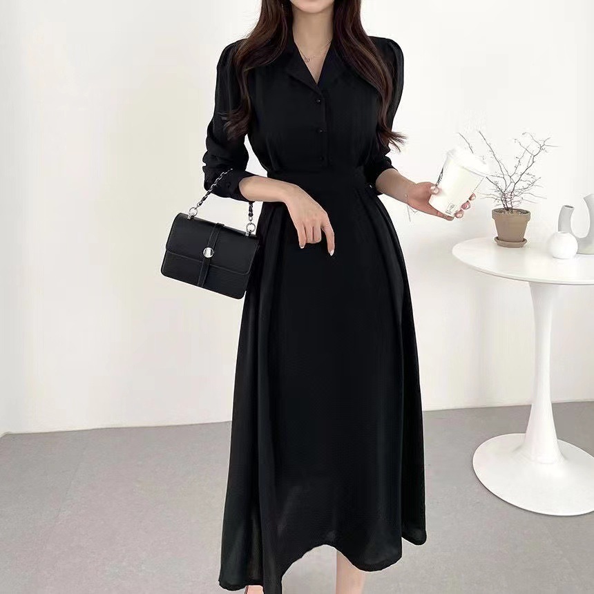 2025 한국 세련된 봄 새로운 스타일 가벼운 성숙한 허리 폴로 칼라 드레스 퍼프 슬리브 슬림 셔츠 a 라인 스커트