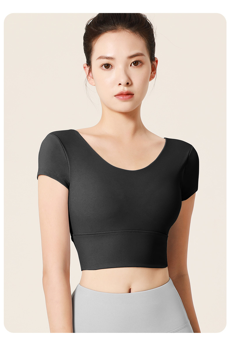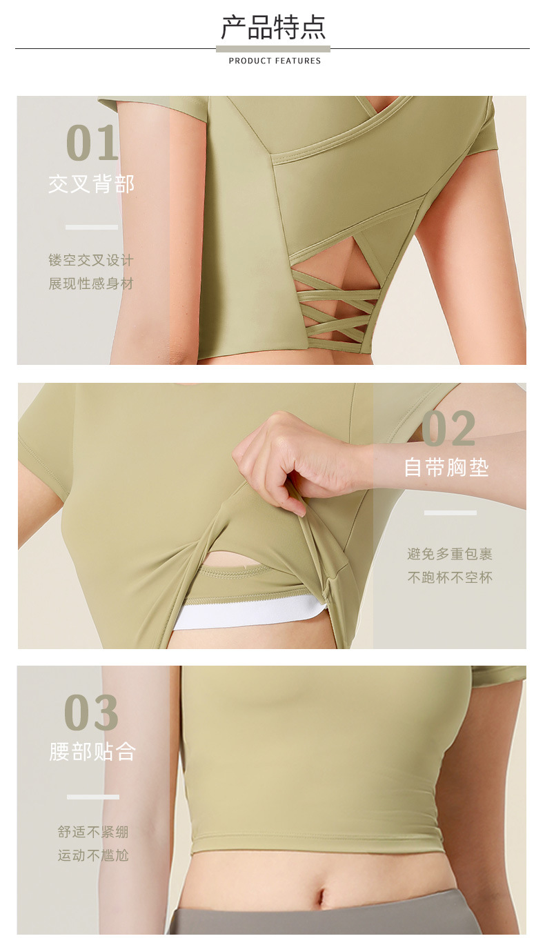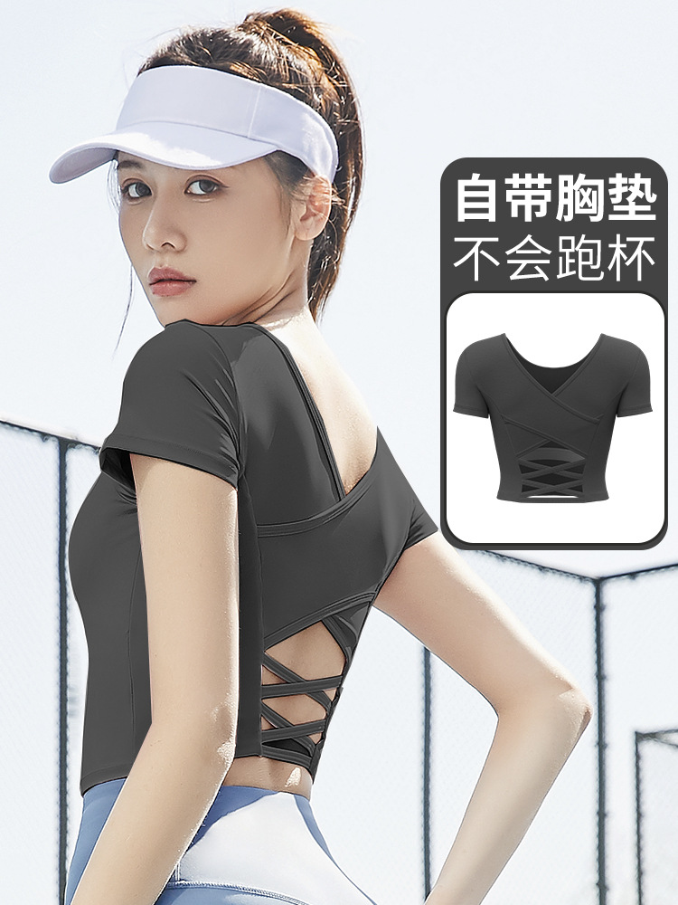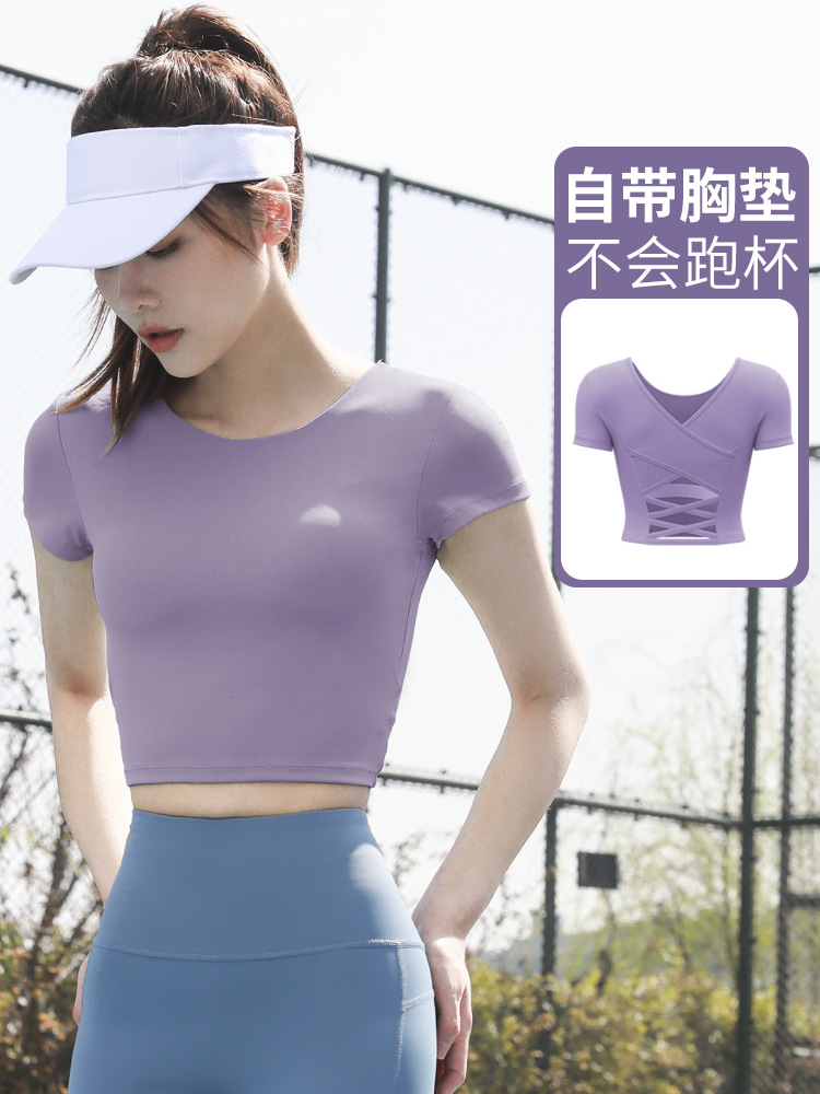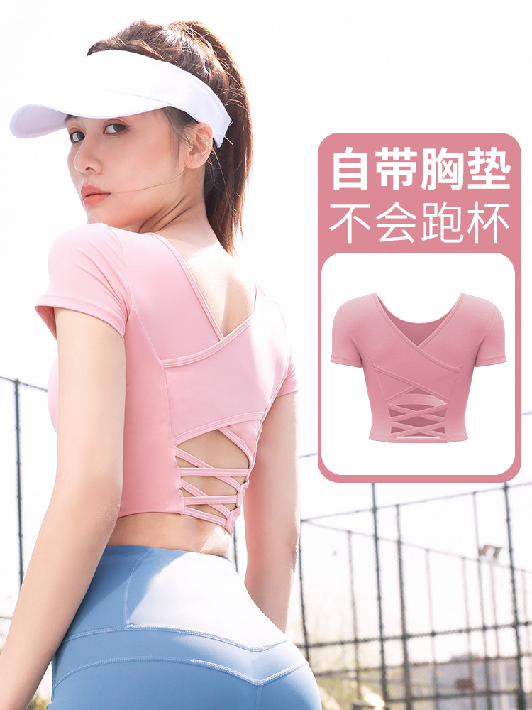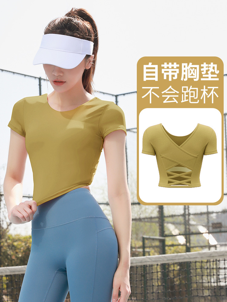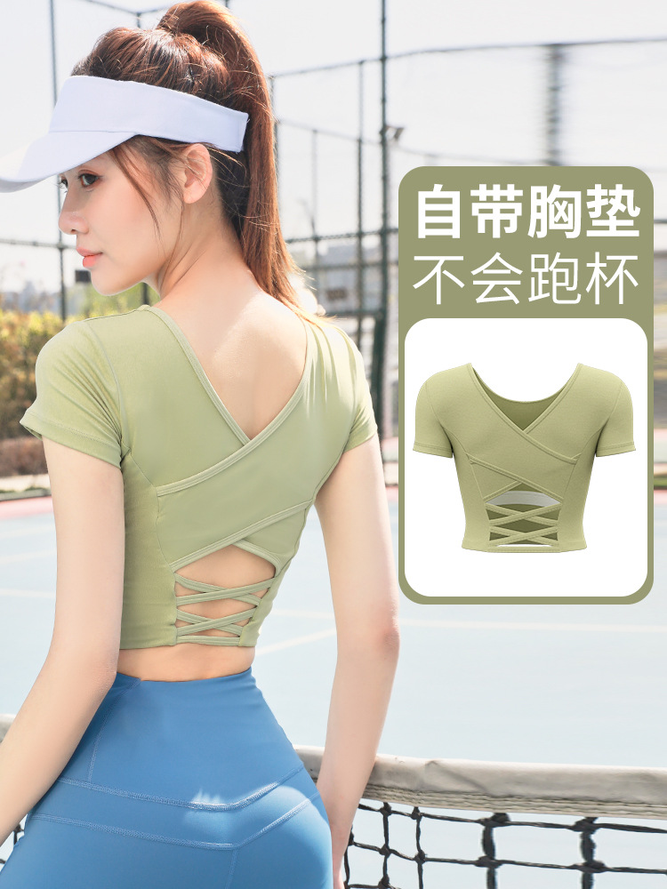 누드톤 크로스백 요가탑, 가슴 패드 내장 탄력있는 숏핏 운동복 반팔