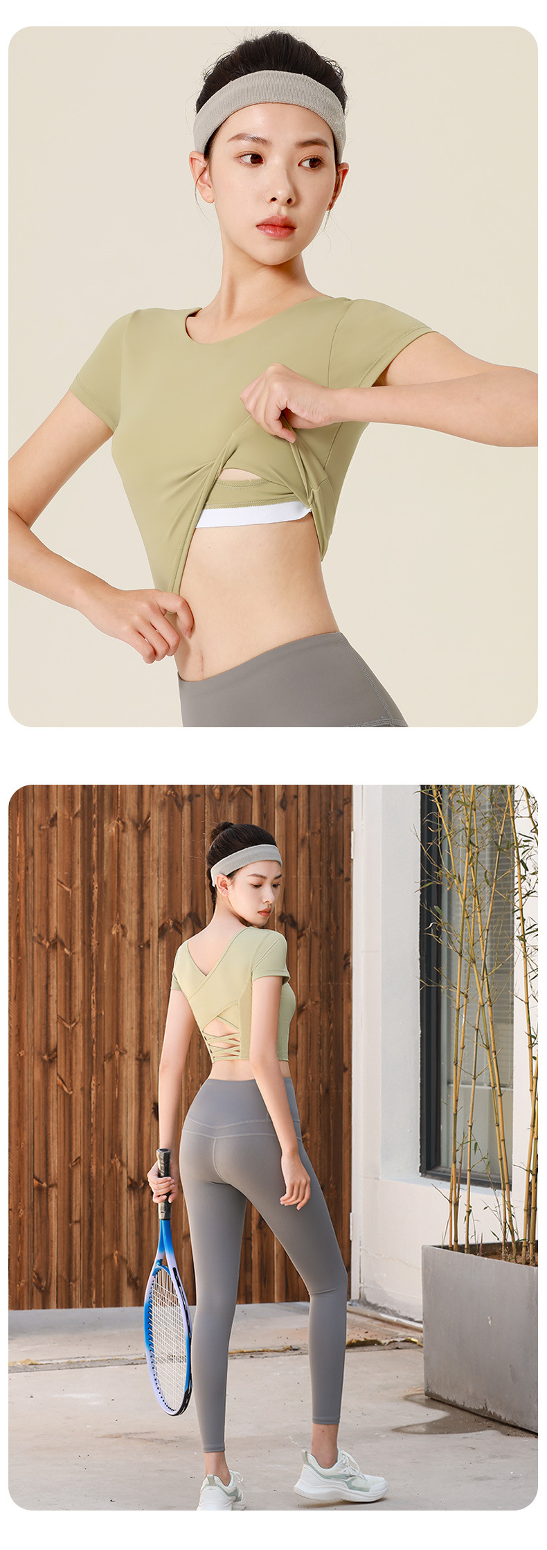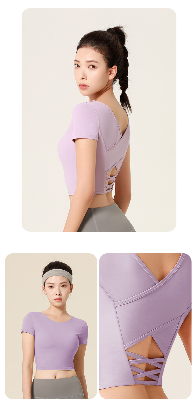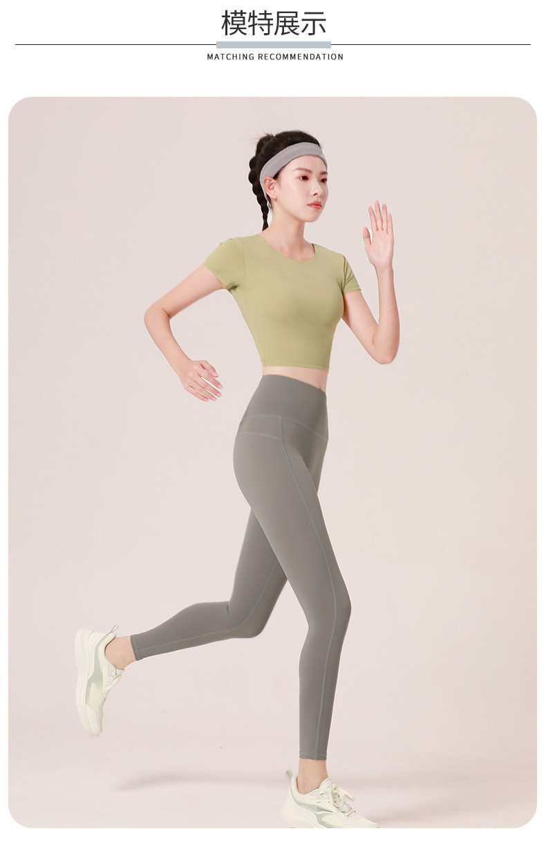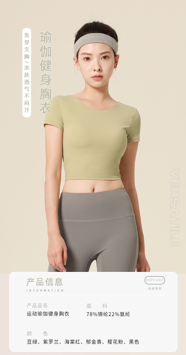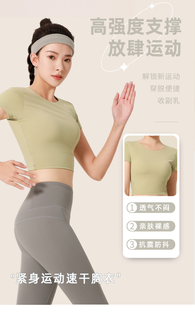 누드톤 크로스백 요가탑, 가슴 패드 내장 탄력있는 숏핏 운동복 반팔
