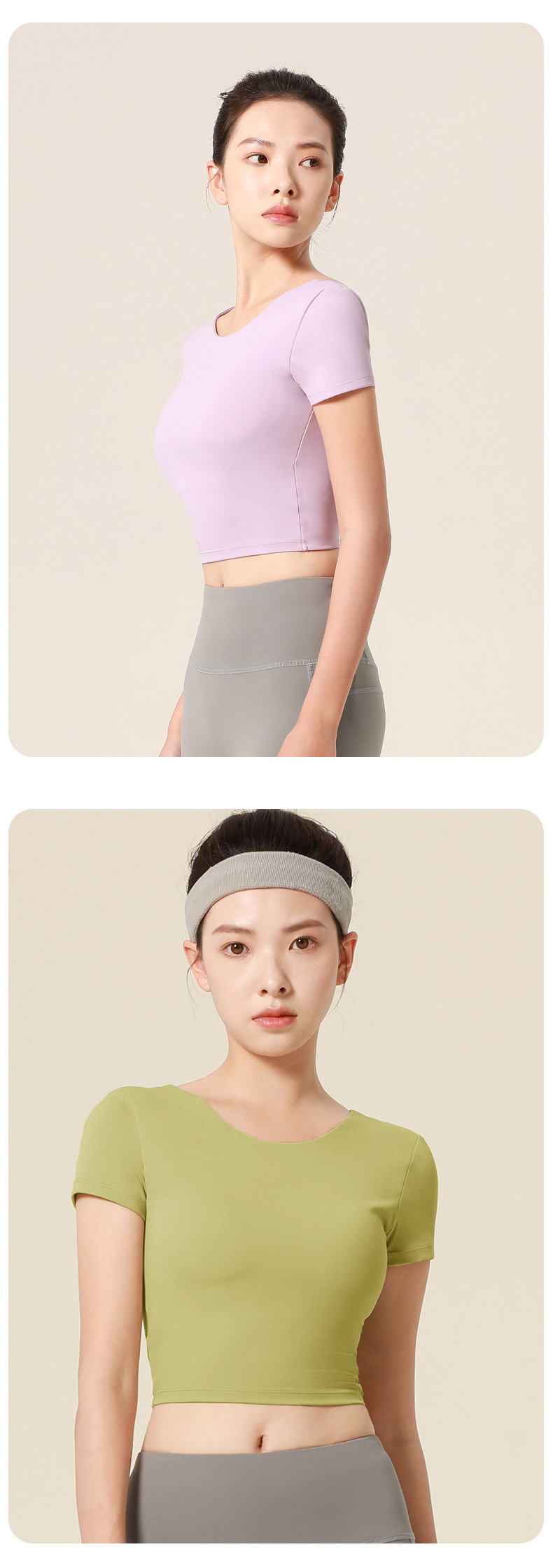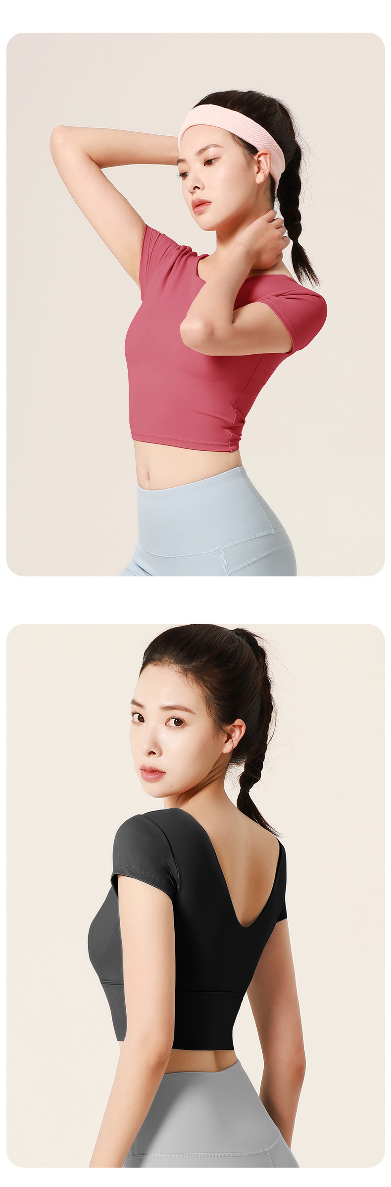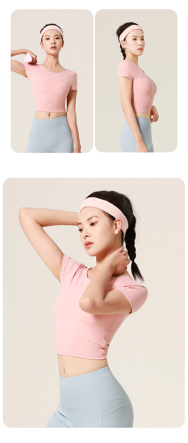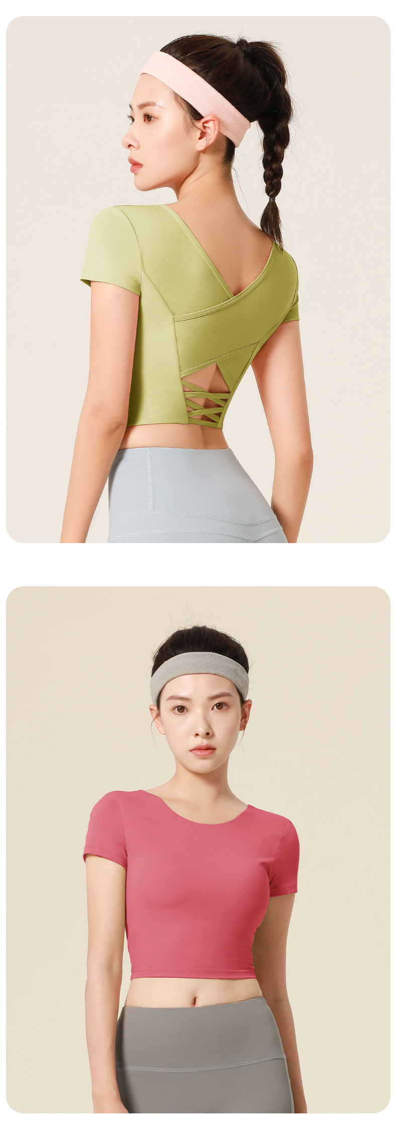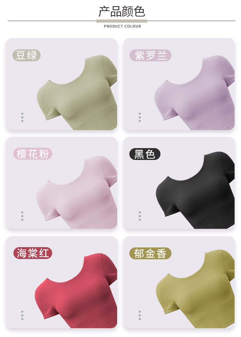 누드톤 크로스백 요가탑, 가슴 패드 내장 탄력있는 숏핏 운동복 반팔