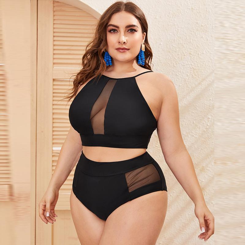 2025 유럽 및 미국 크로스보더 플러스 사이즈 순색 메쉬 분리형 하이웨이스트 비키니 대형 수영복 패셔너블하고 섹시함