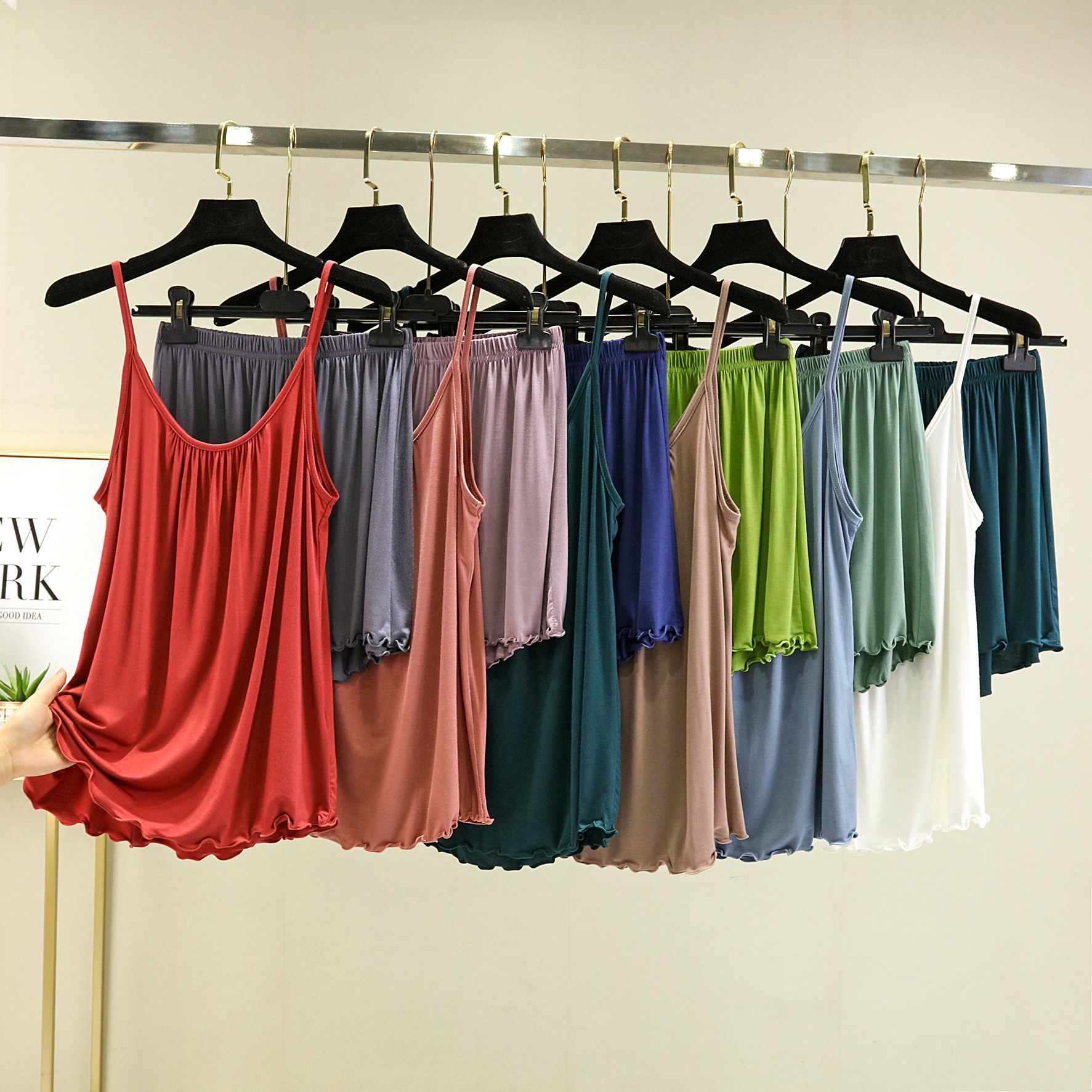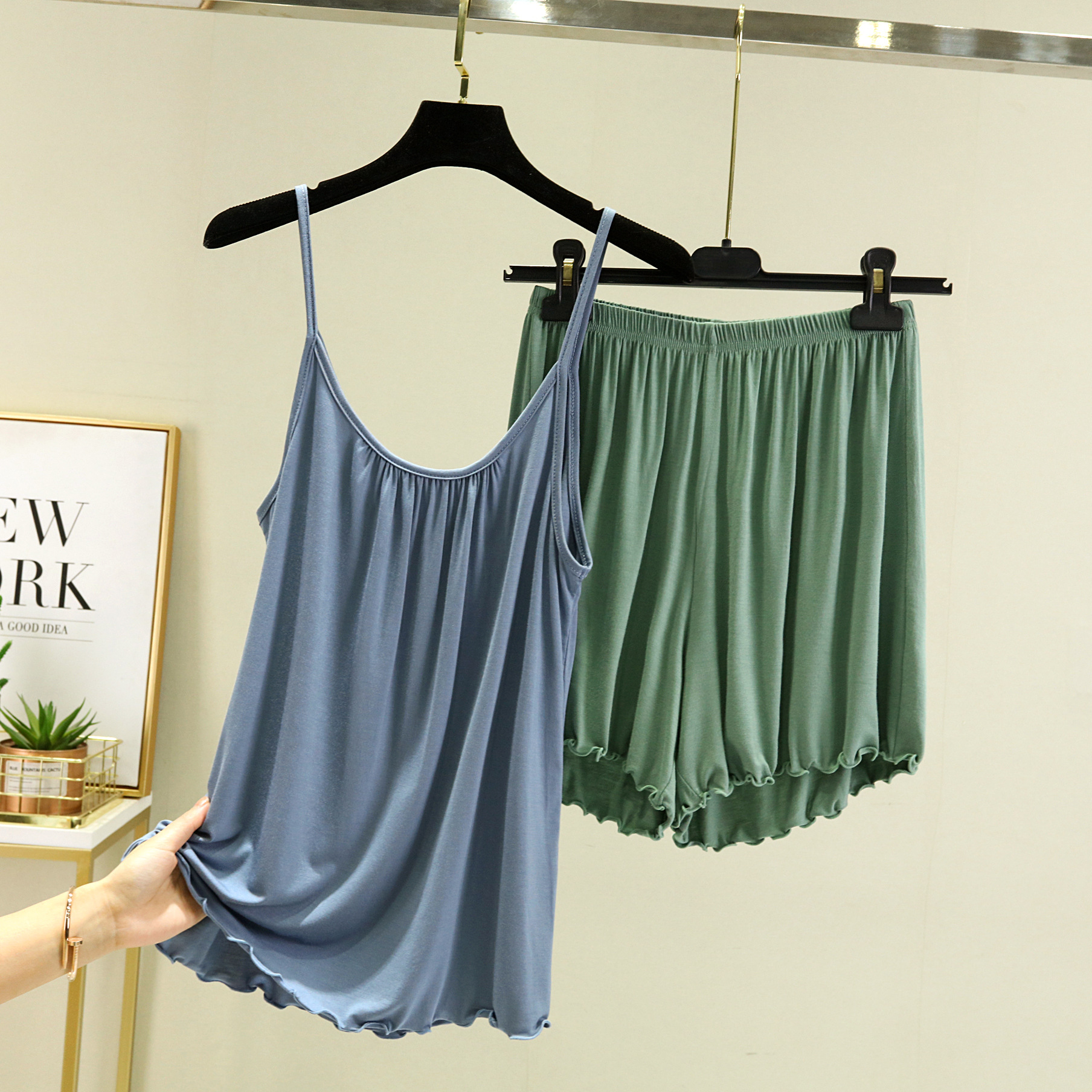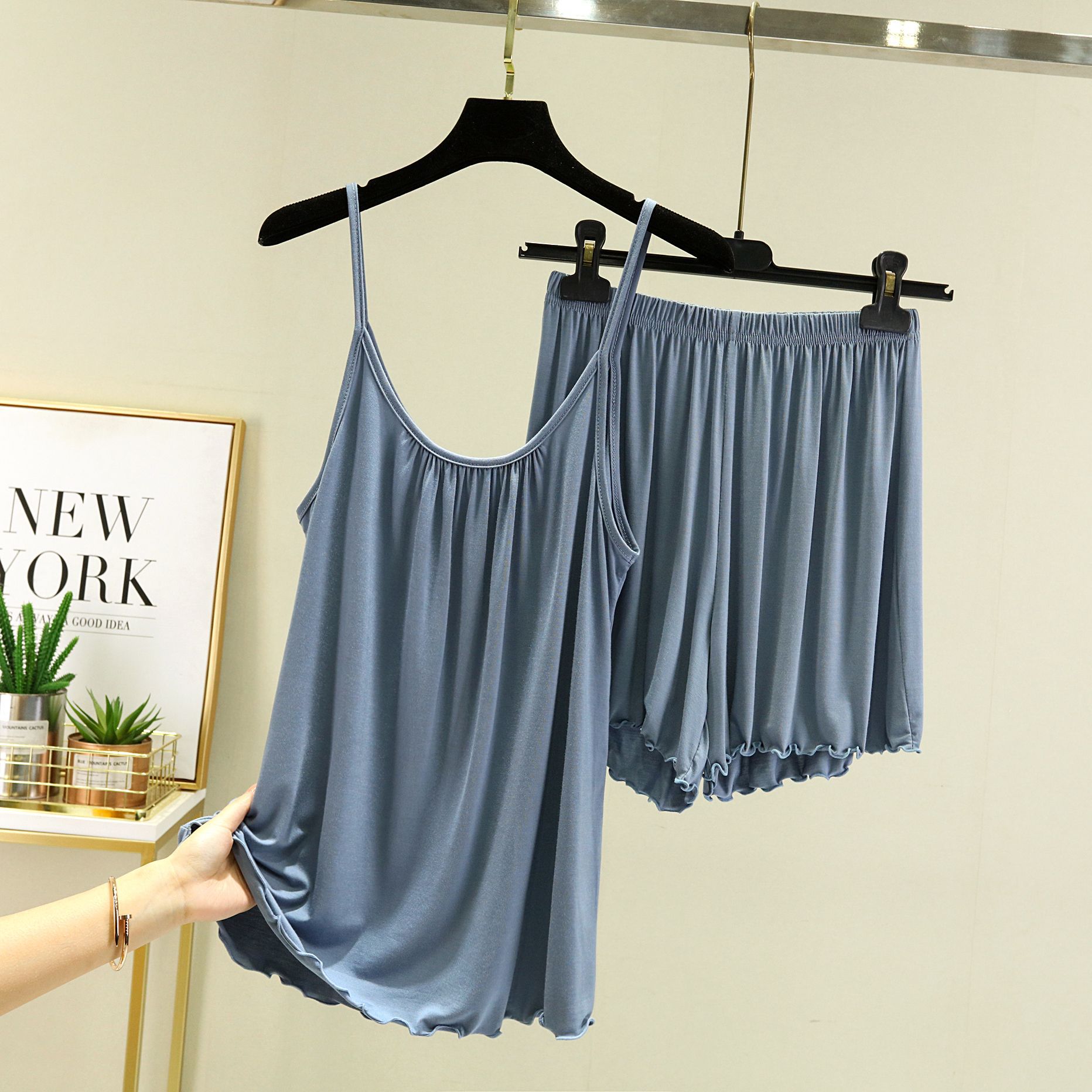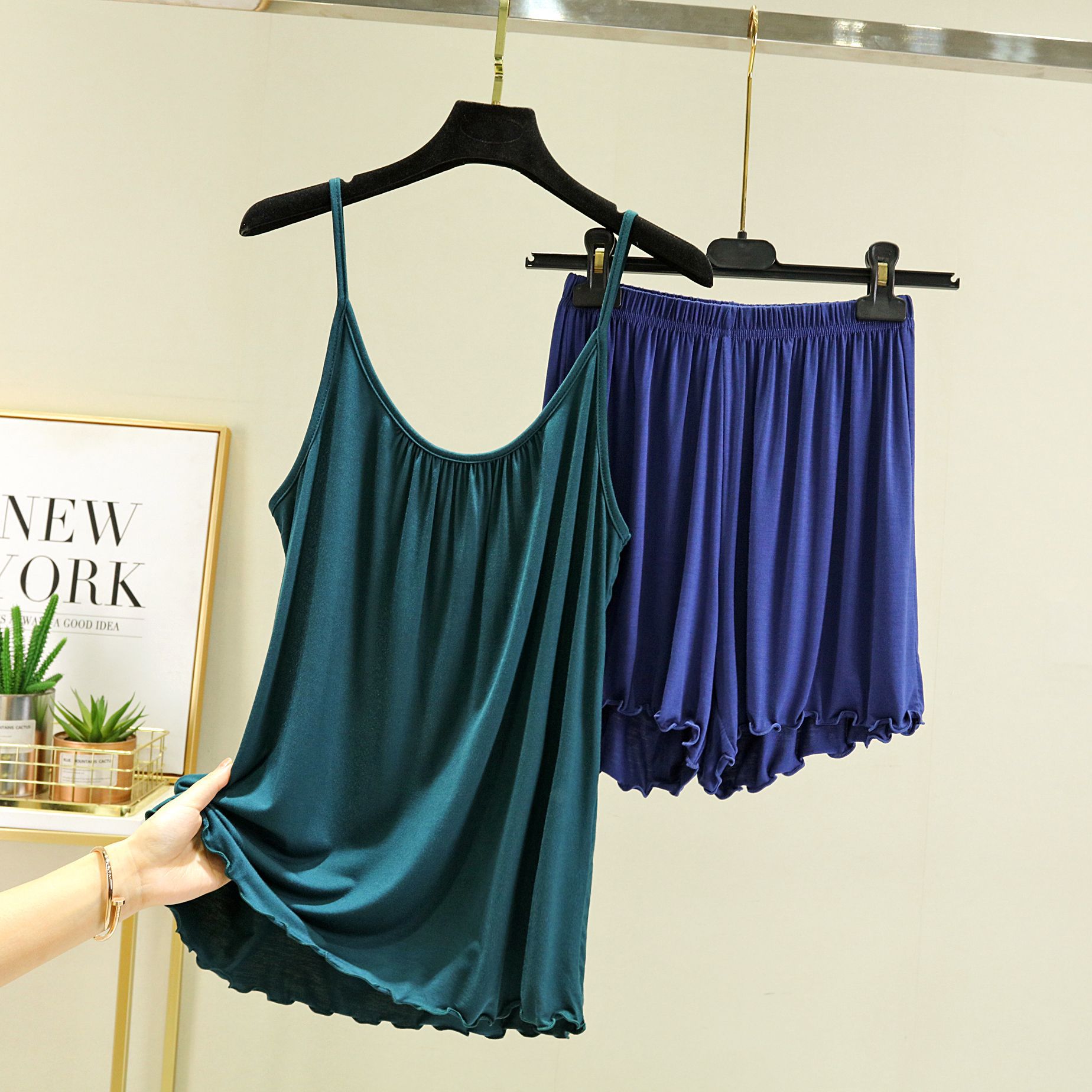 모달 크루넥 핀치 플리츠 슬립 탑 플래시사이드 반바지 홈웨어 여름 얇은 캐주얼 플러스 사이즈 투피스 세트스토어 가기