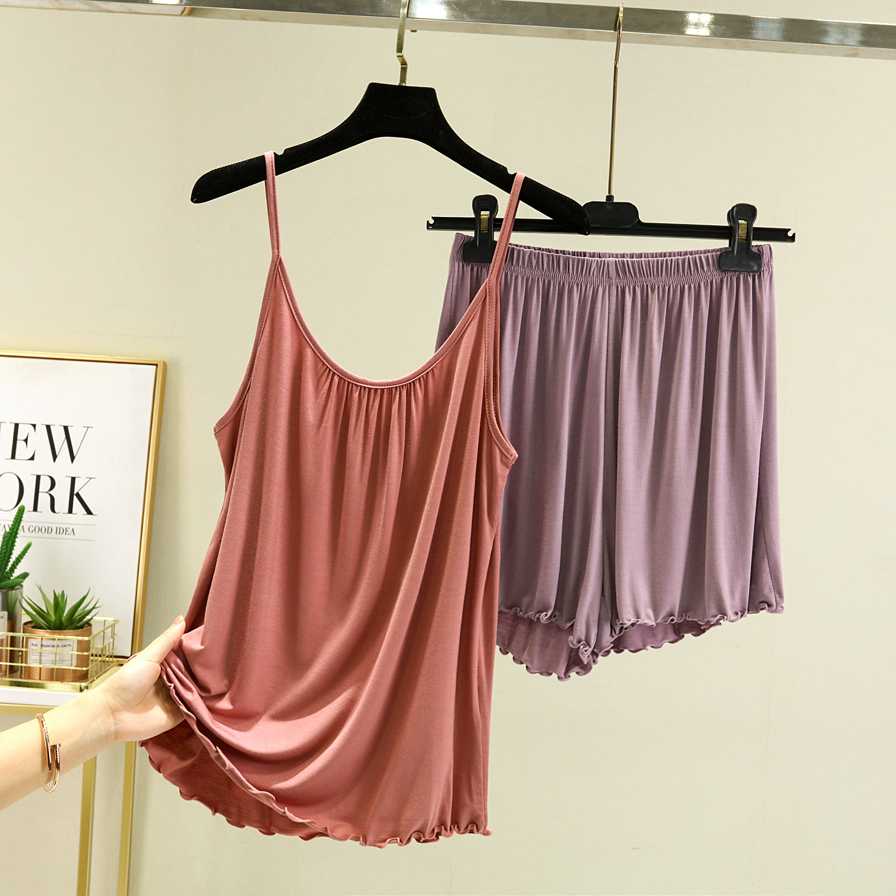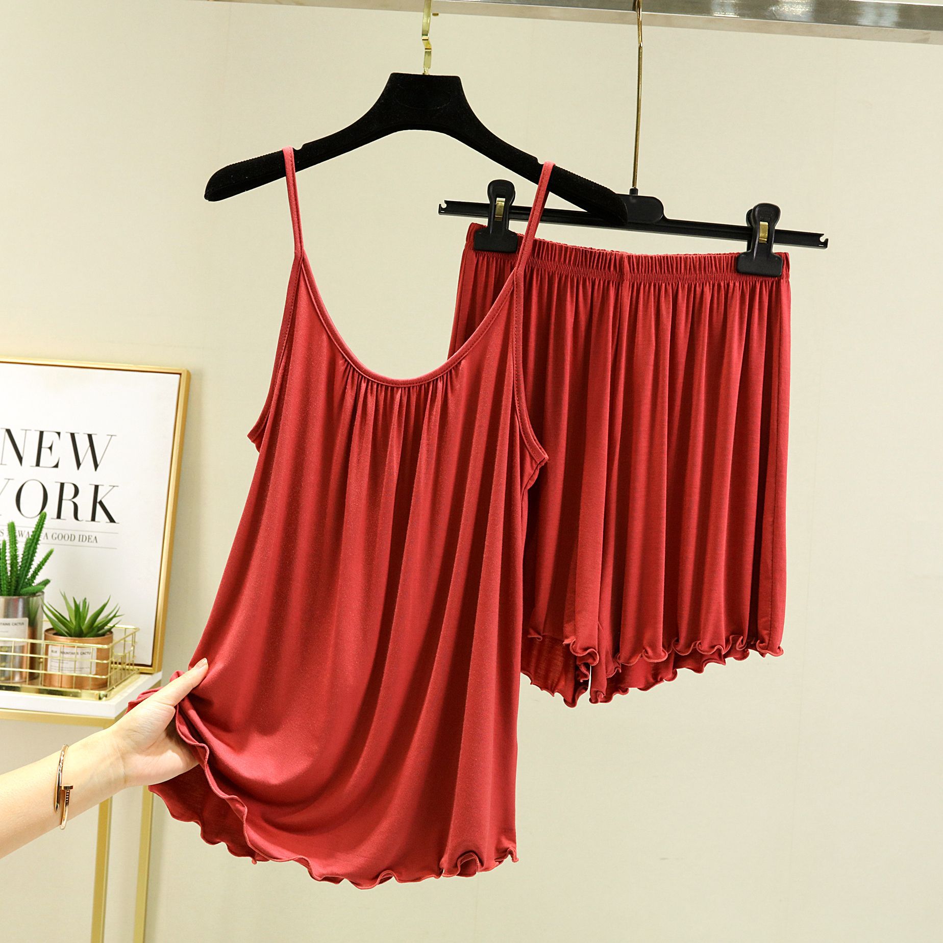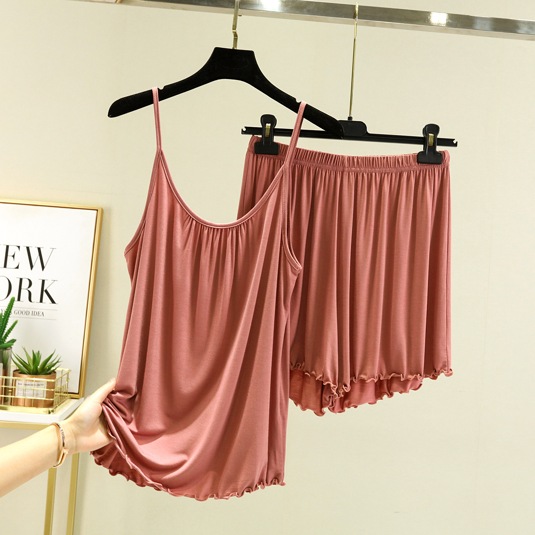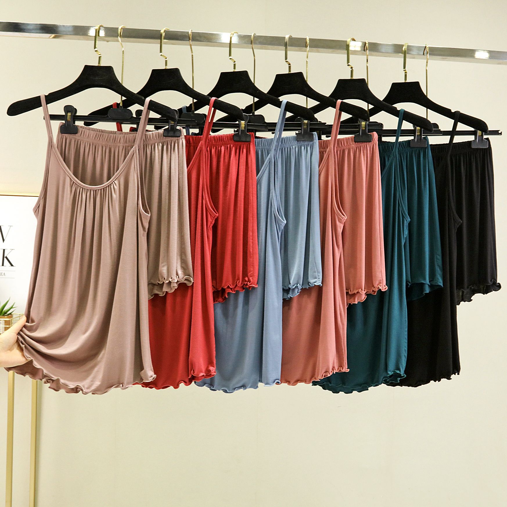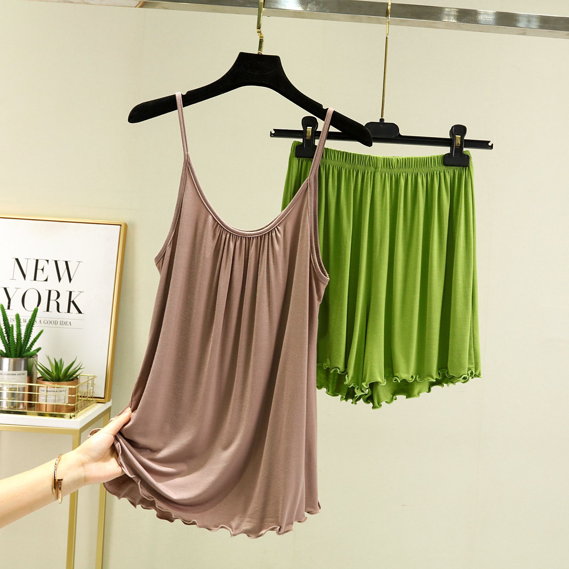 모달 크루넥 핀치 플리츠 슬립 탑 플래시사이드 반바지 홈웨어 여름 얇은 캐주얼 플러스 사이즈 투피스 세트스토어 가기