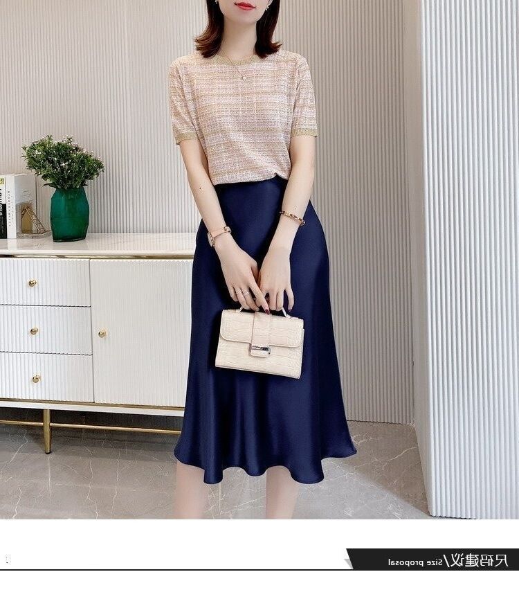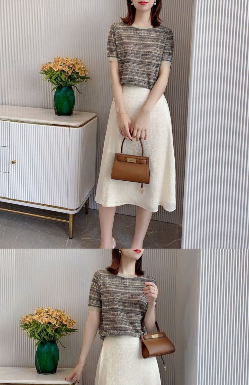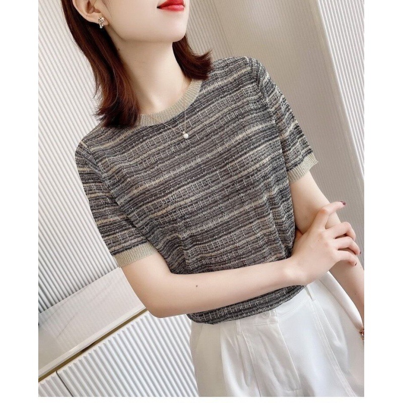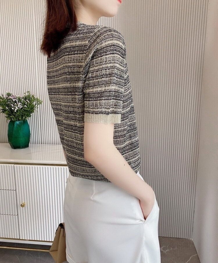 여성용 니트 반팔 티셔츠 2026년 여름 신상 반팔 티셔츠 스트라이프 배색 루즈핏 라운드넥 디자인 탑스토어 가기