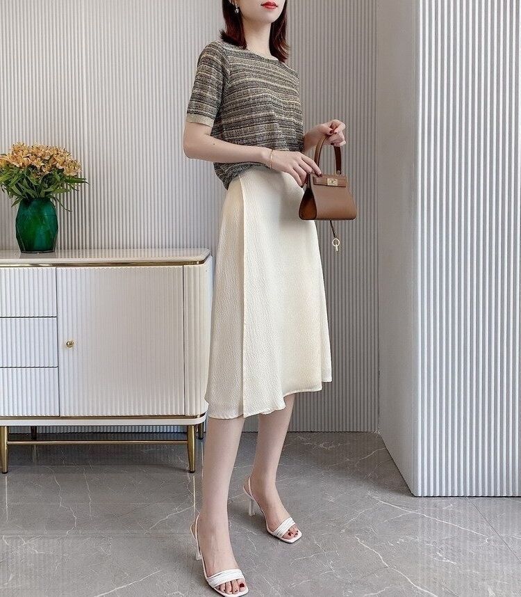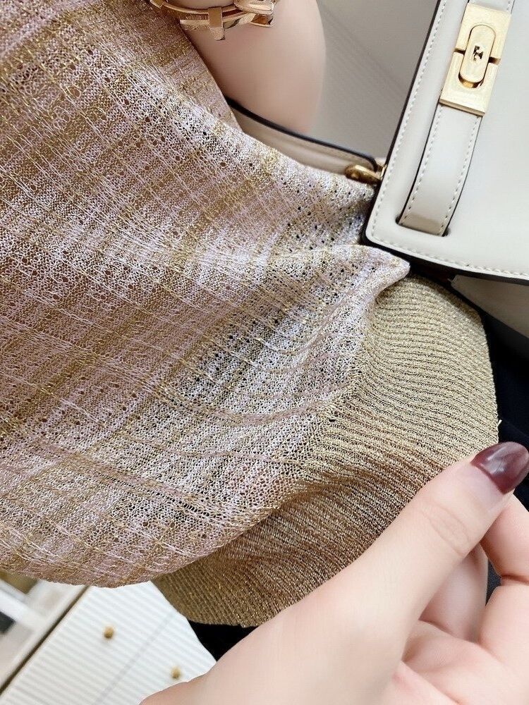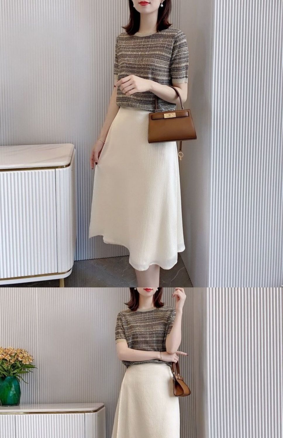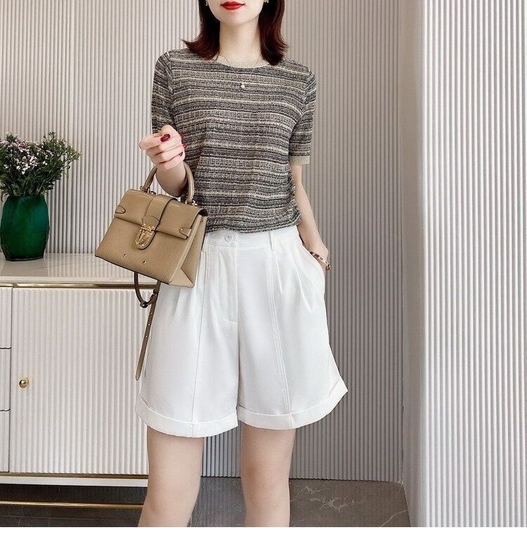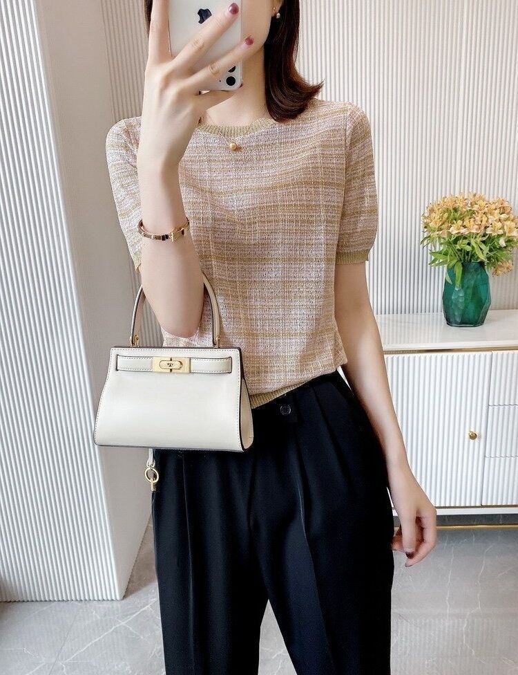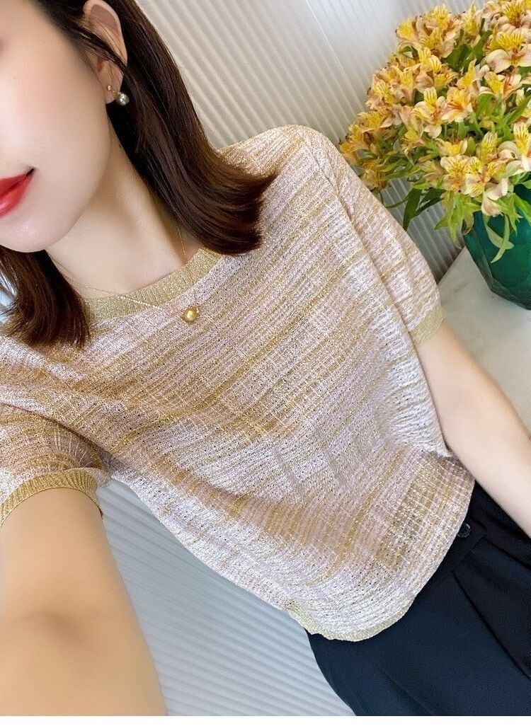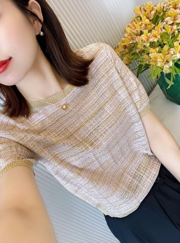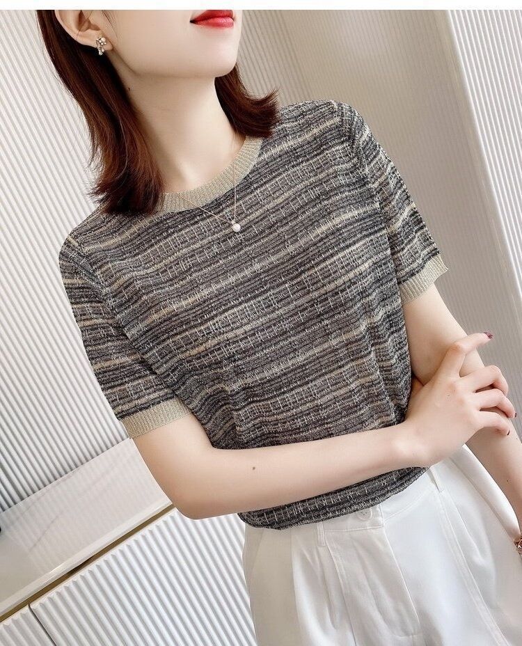 여성용 니트 반팔 티셔츠 2026년 여름 신상 반팔 티셔츠 스트라이프 배색 루즈핏 라운드넥 디자인 탑