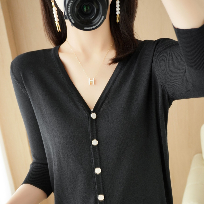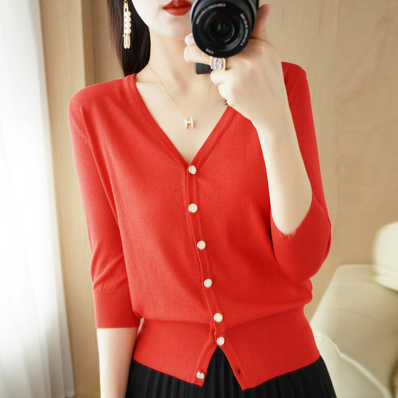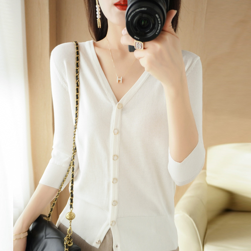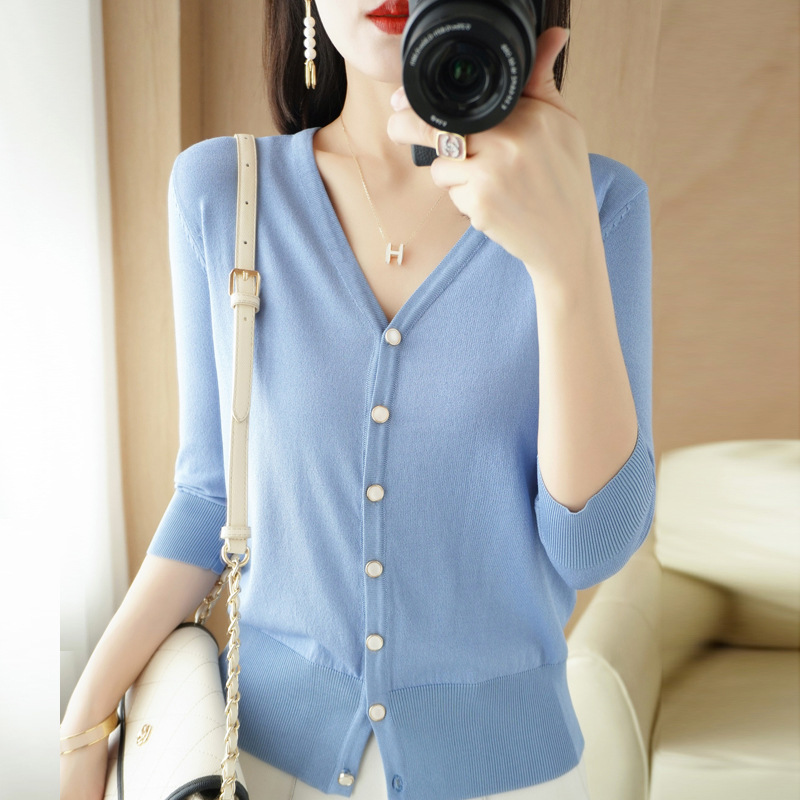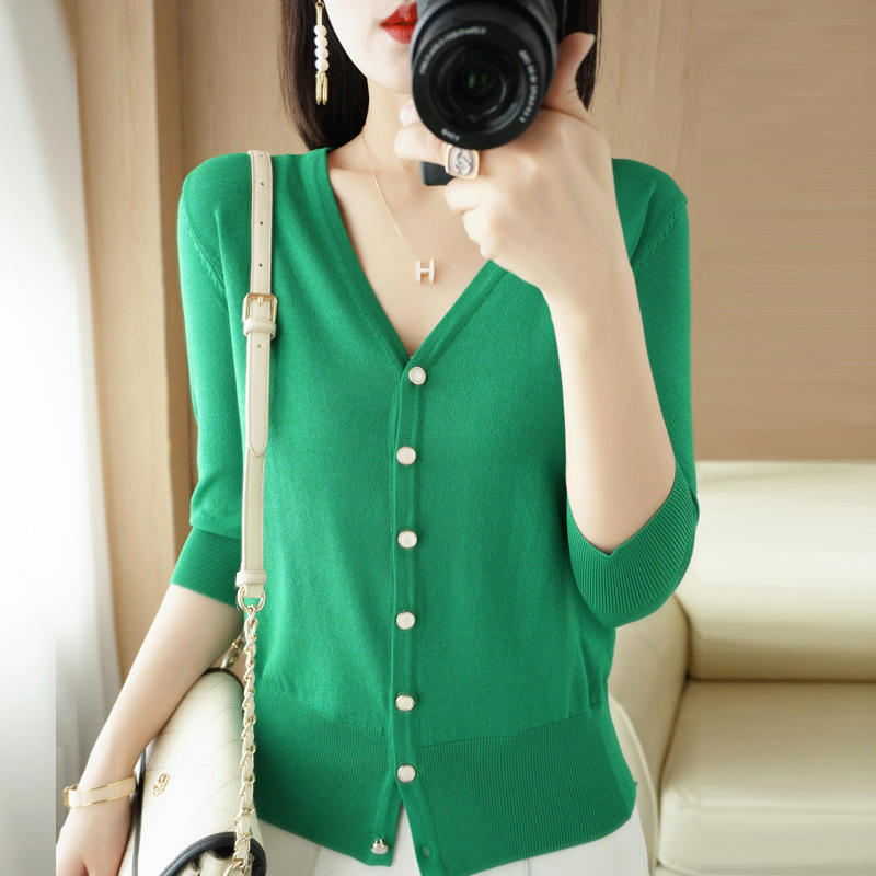 V-넥 하프 슬리브 니트 아이스 실크 가디건 여성용 2022 여름 새로운 한국 스타일 중간 소매 외부 싱글 브레스트 얇은 탑