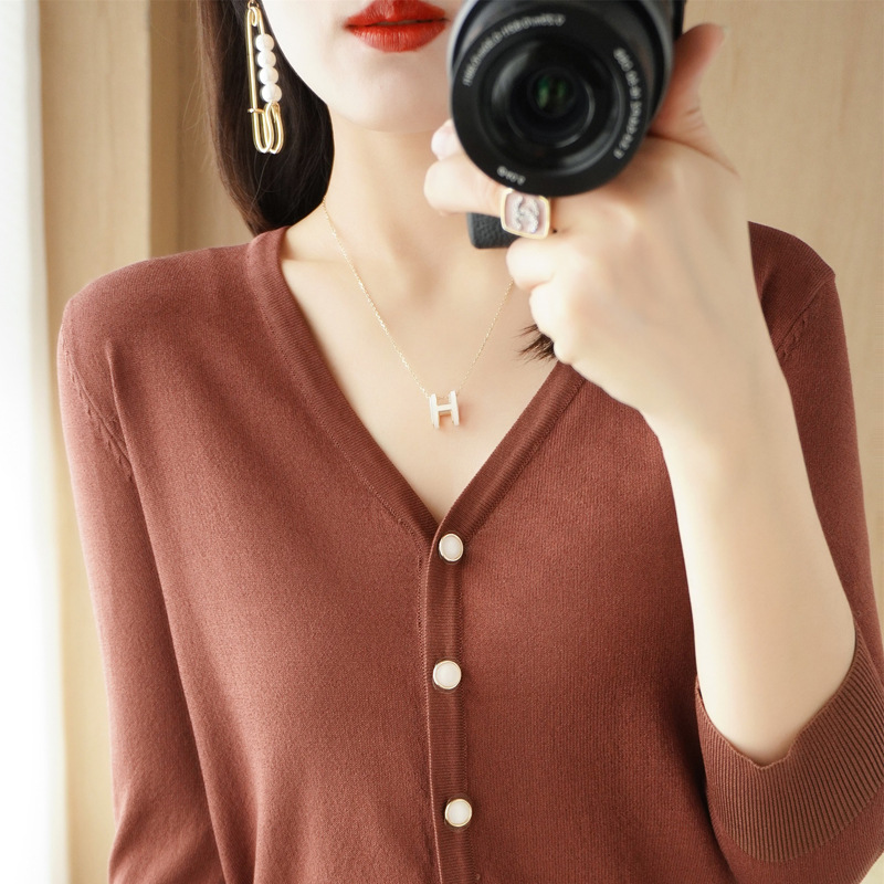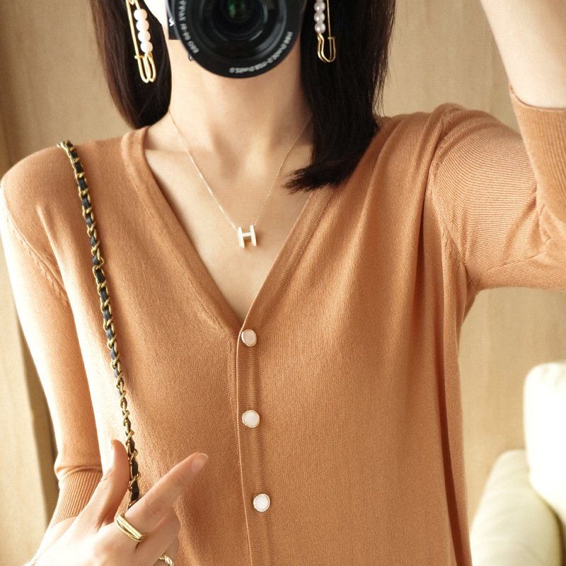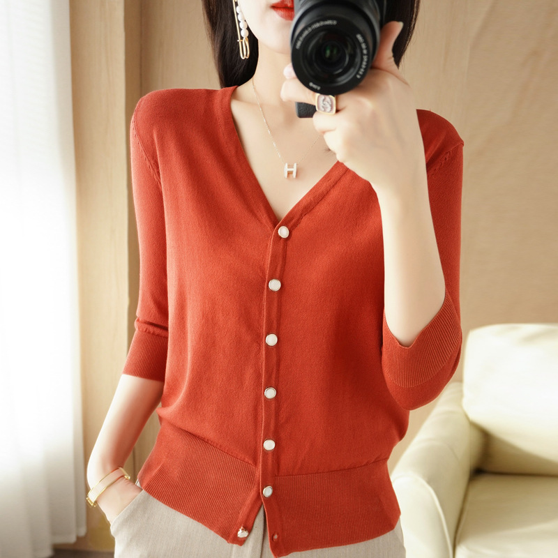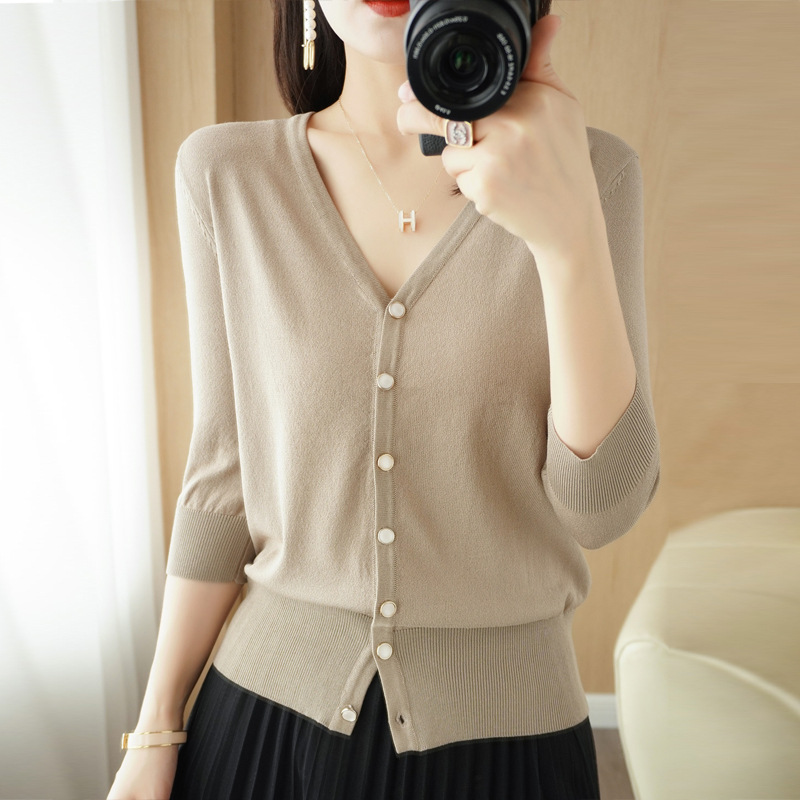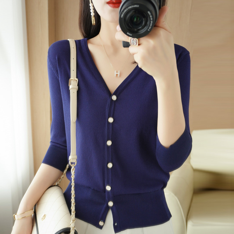 V-넥 하프 슬리브 니트 아이스 실크 가디건 여성용 2022 여름 새로운 한국 스타일 중간 소매 외부 싱글 브레스트 얇은 탑