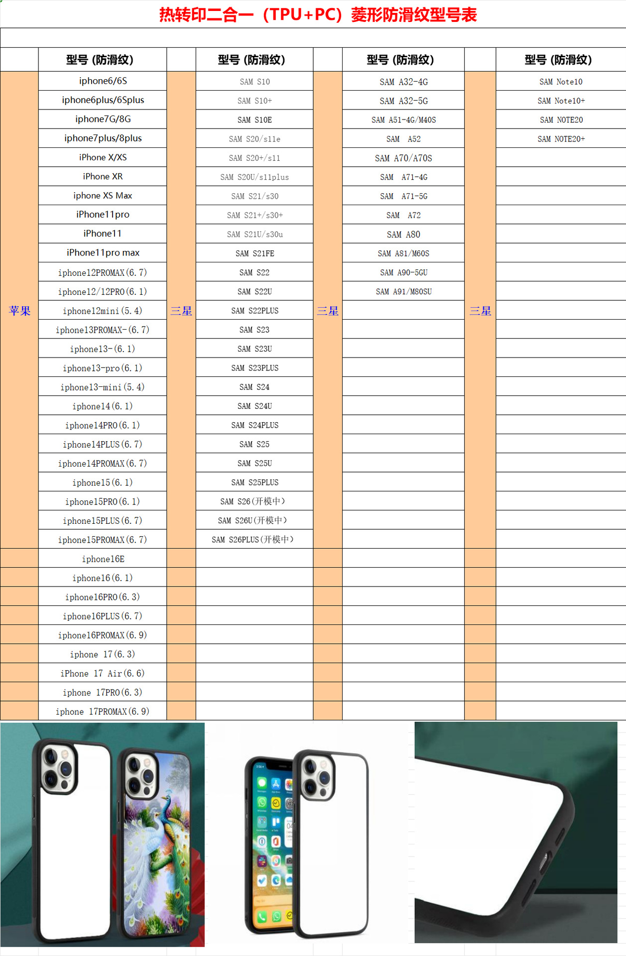 材质:TPU(软壳)+PC二合一 ,配热转印胶片