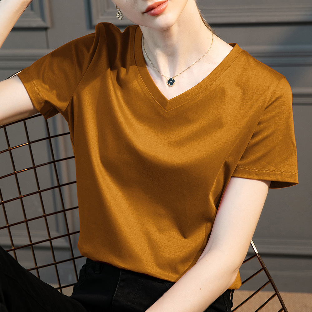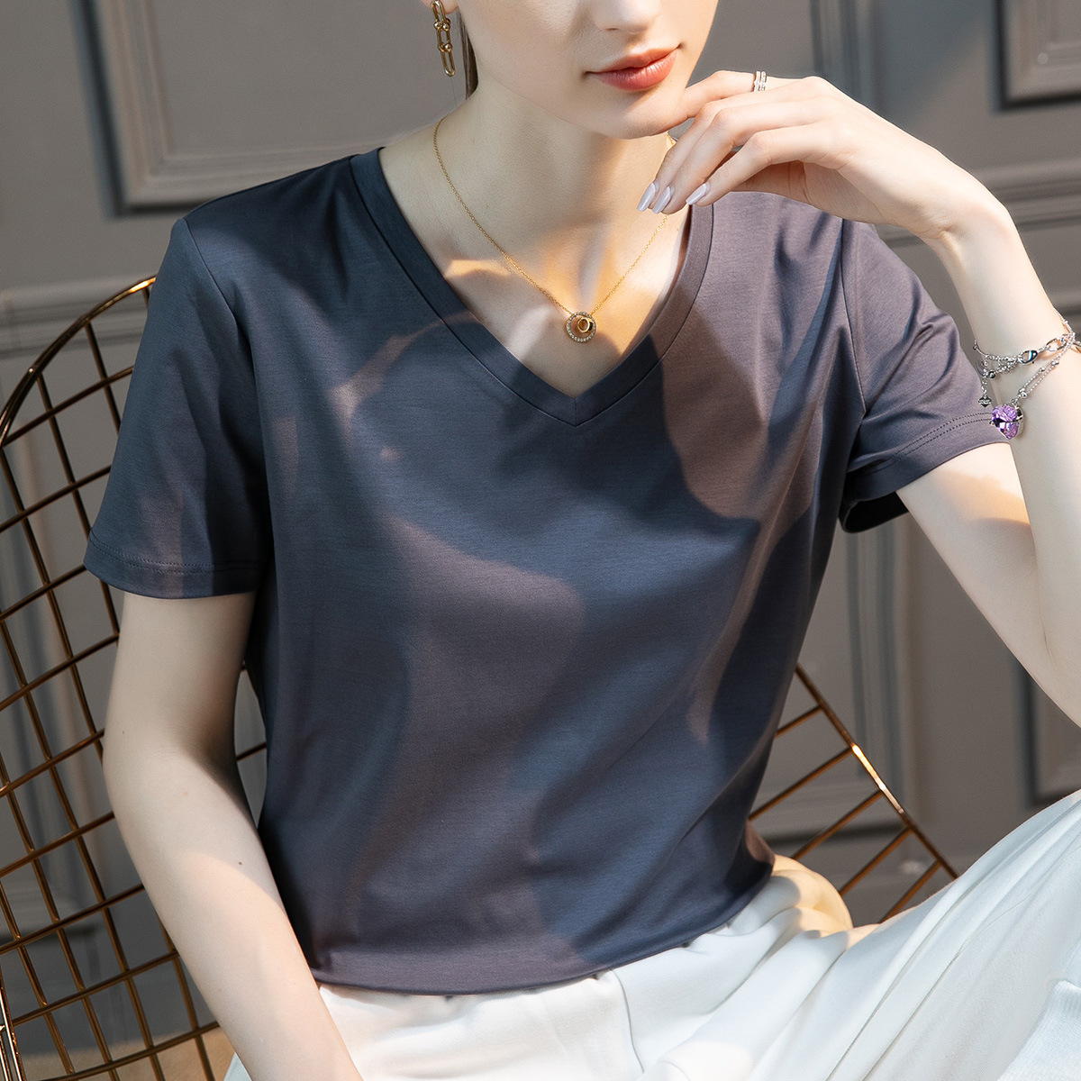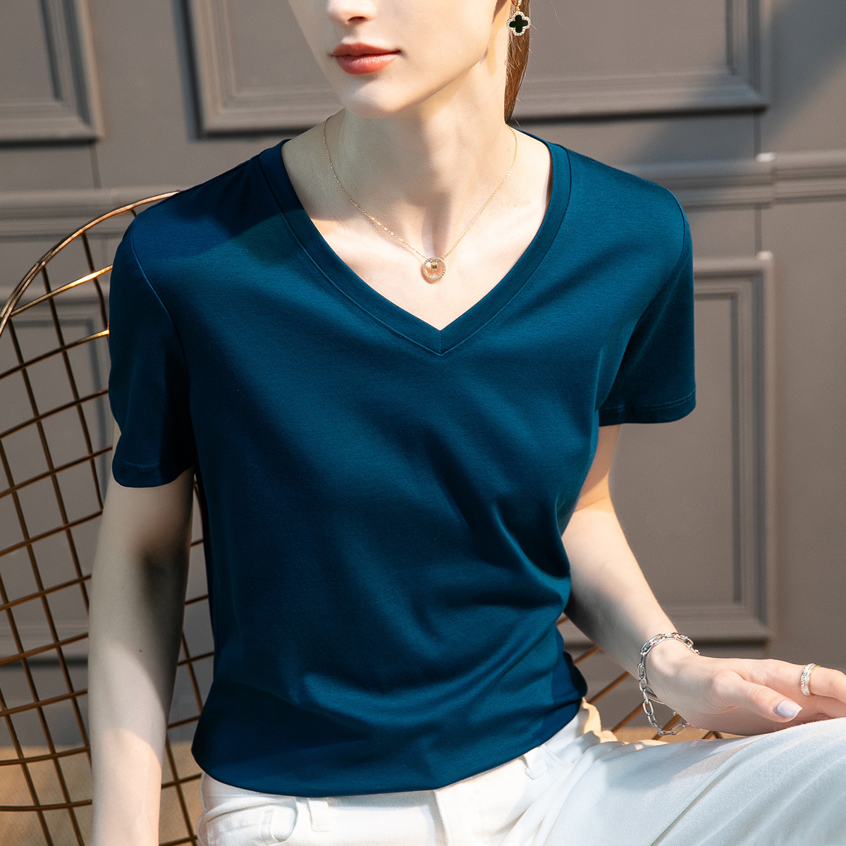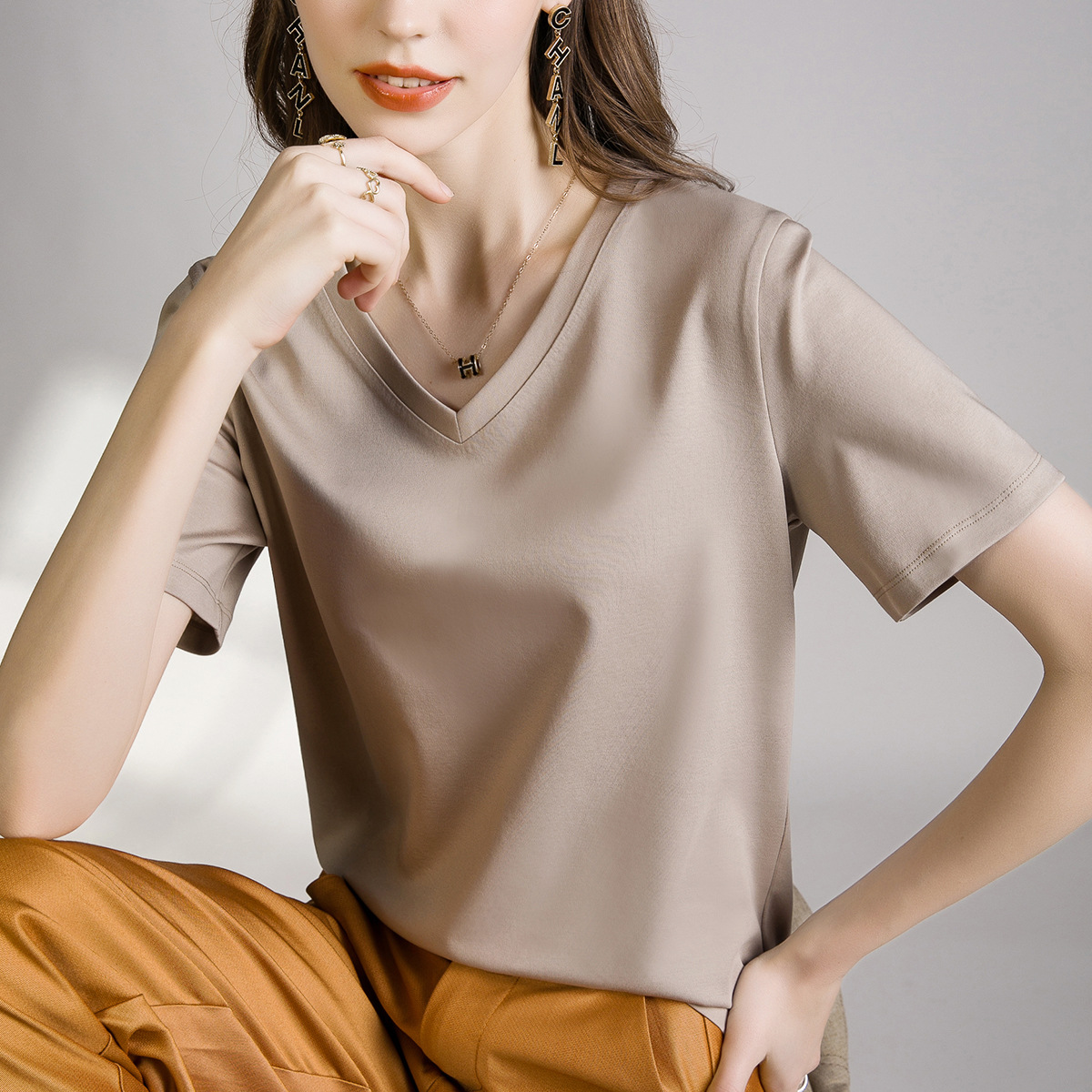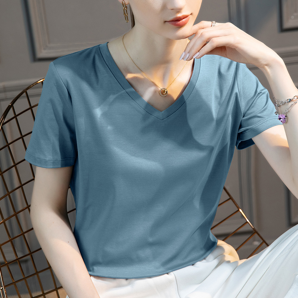 高支桑蚕丝丝光棉t恤女宽松女装圆领修身显瘦短袖V领白色上衣女