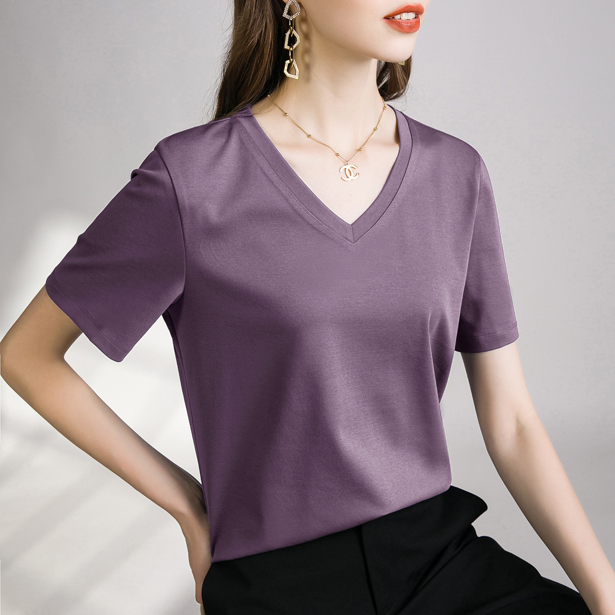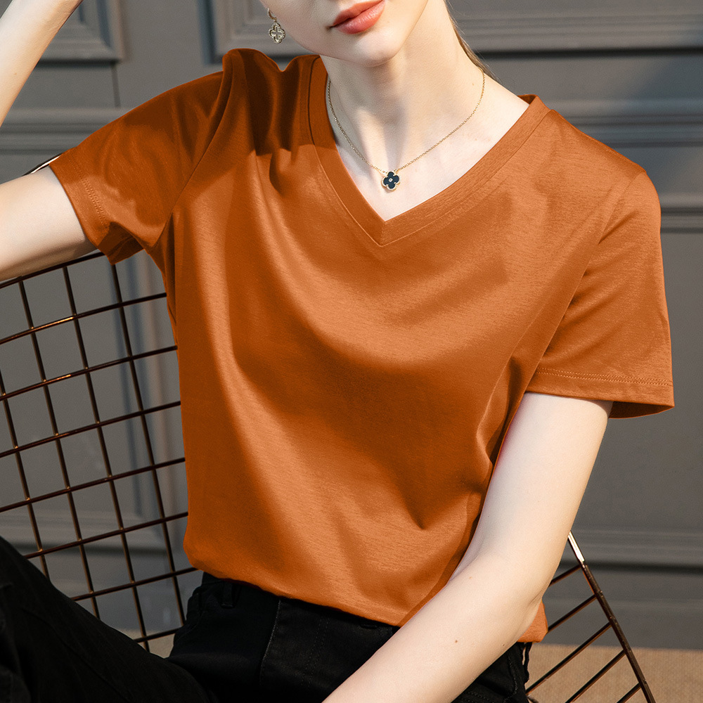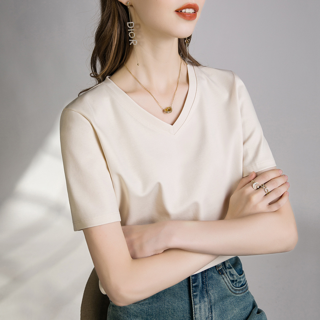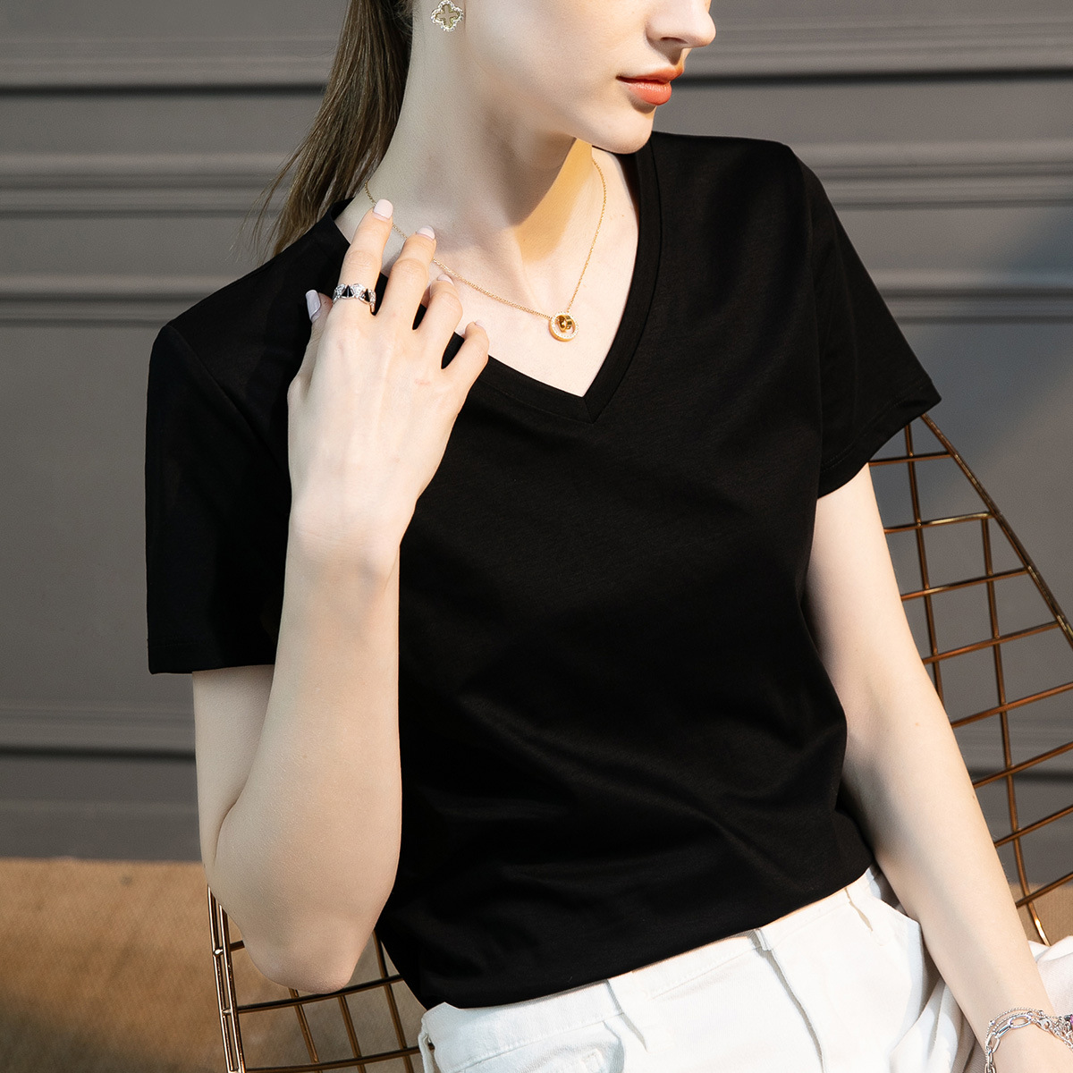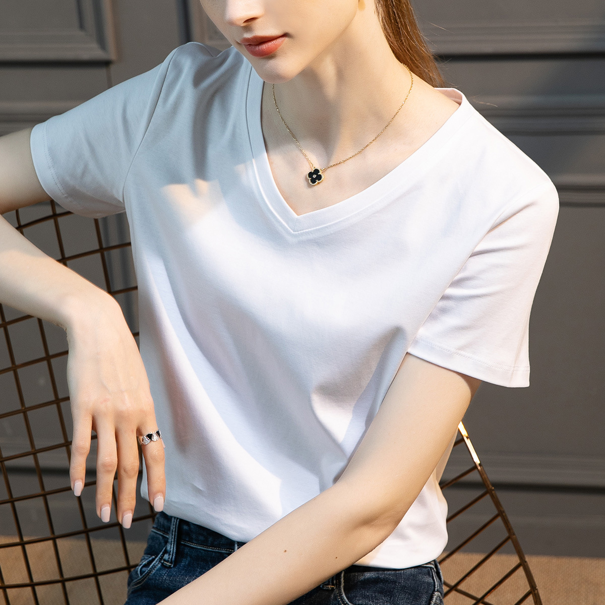 高支桑蚕丝丝光棉t恤女宽松女装圆领修身显瘦短袖V领白色上衣女