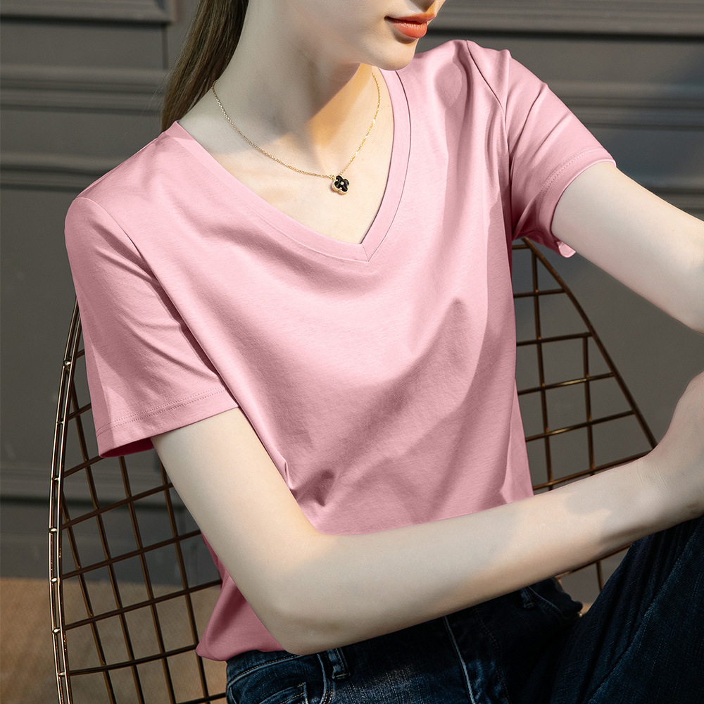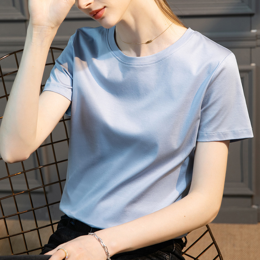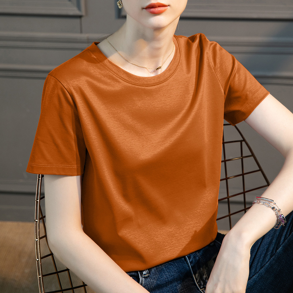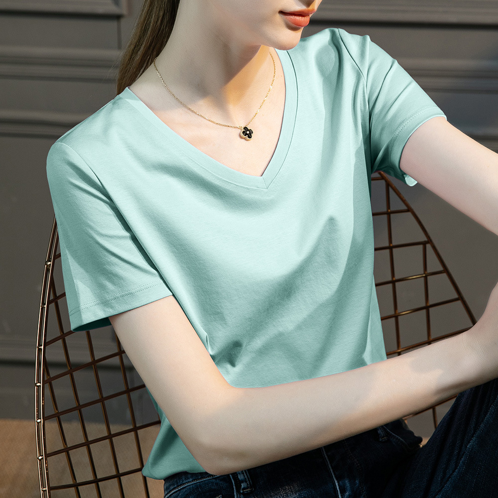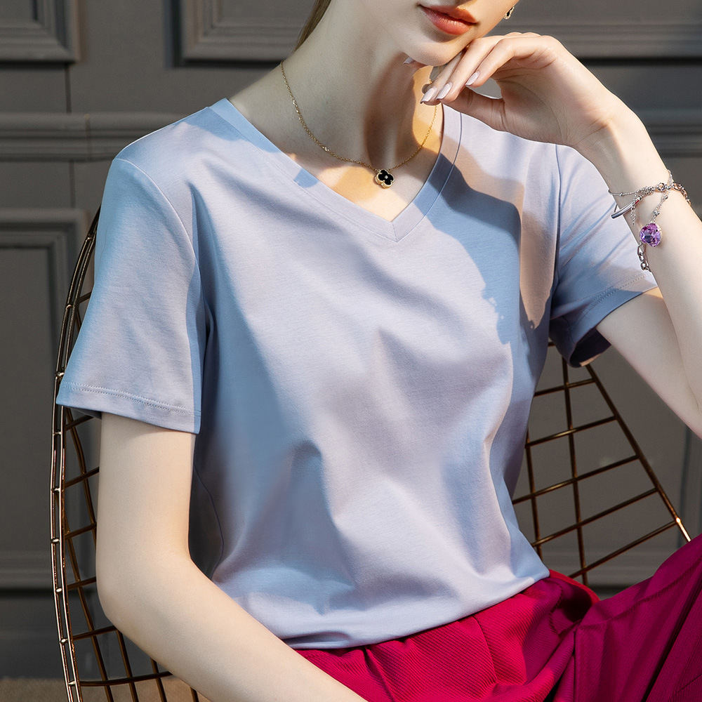 高支桑蚕丝丝光棉t恤女宽松女装圆领修身显瘦短袖V领白色上衣女