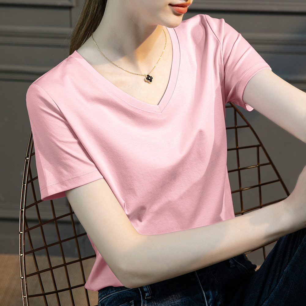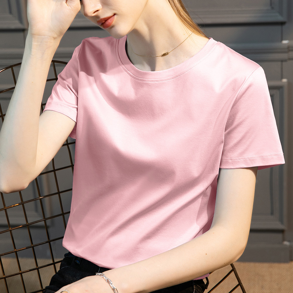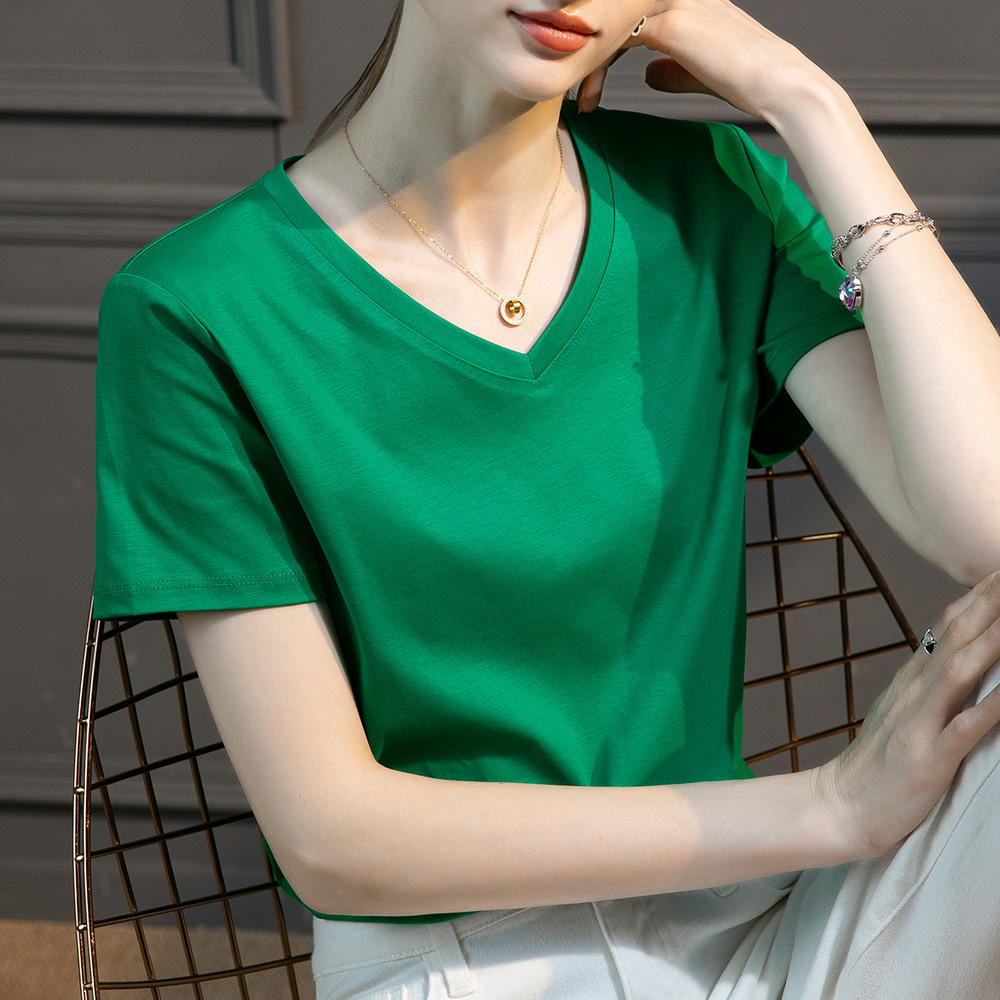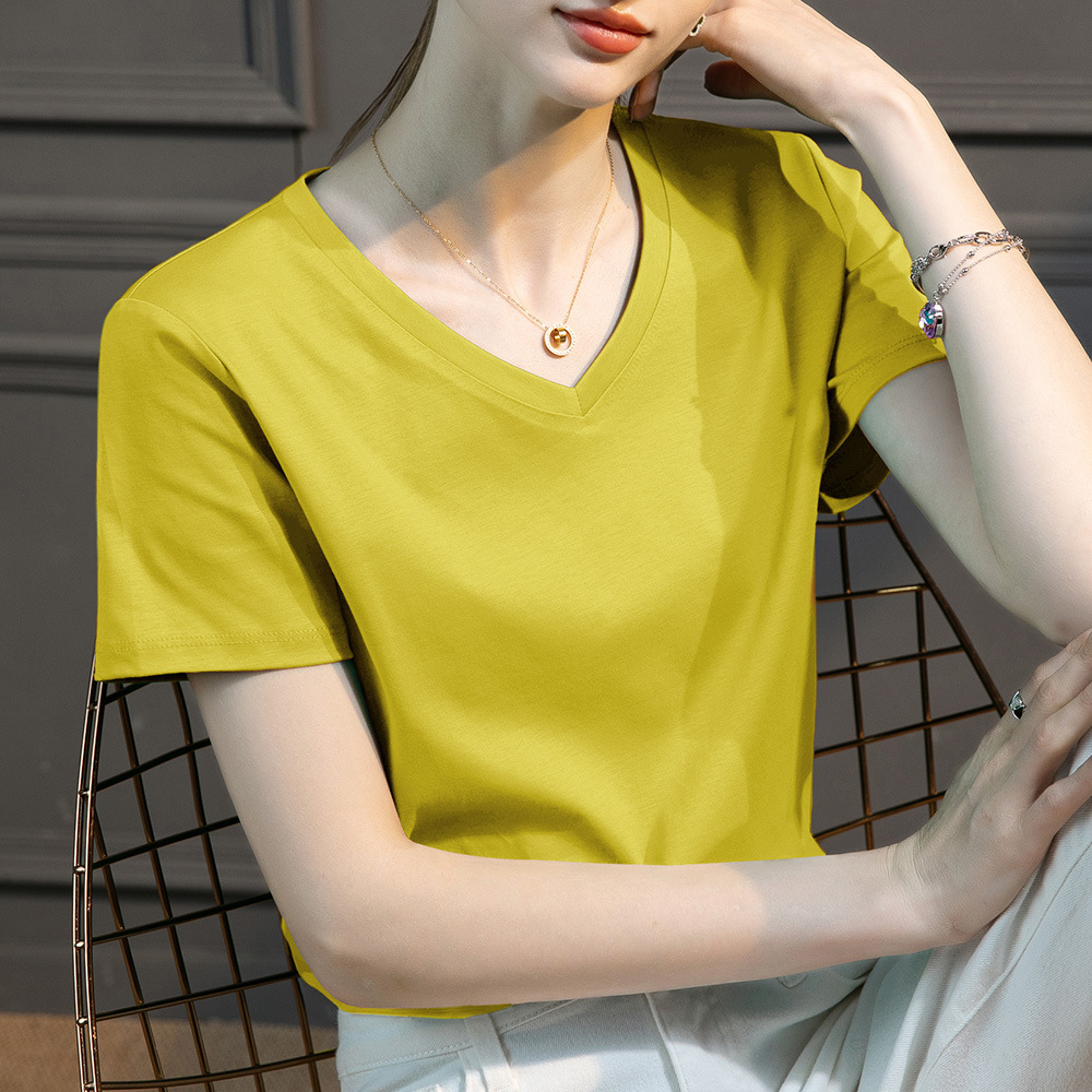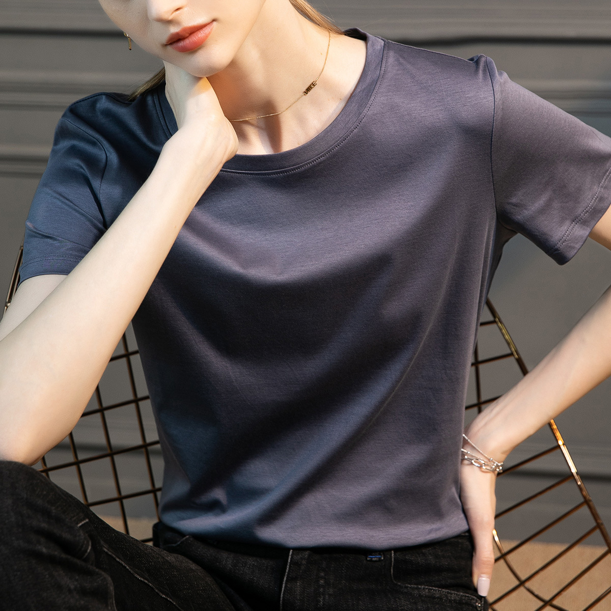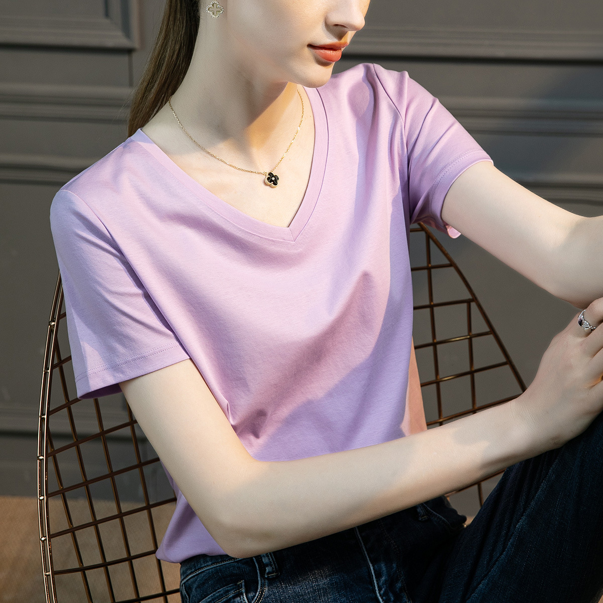 高支桑蚕丝丝光棉t恤女宽松女装圆领修身显瘦短袖V领白色上衣女