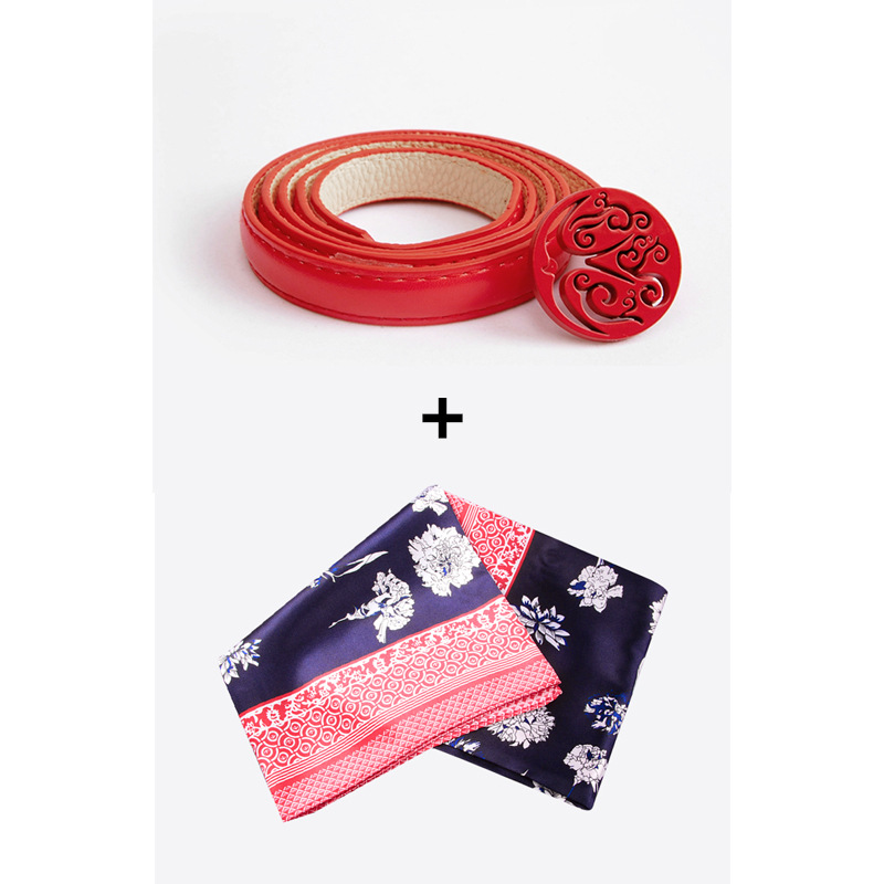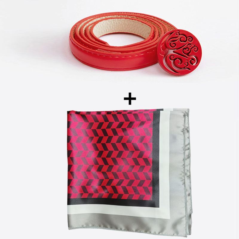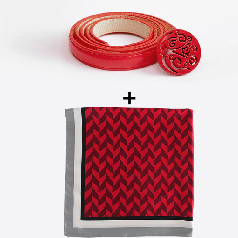 • 작은 둥근 머리 벨트 + 빨간색 가장자리 실크 스카프