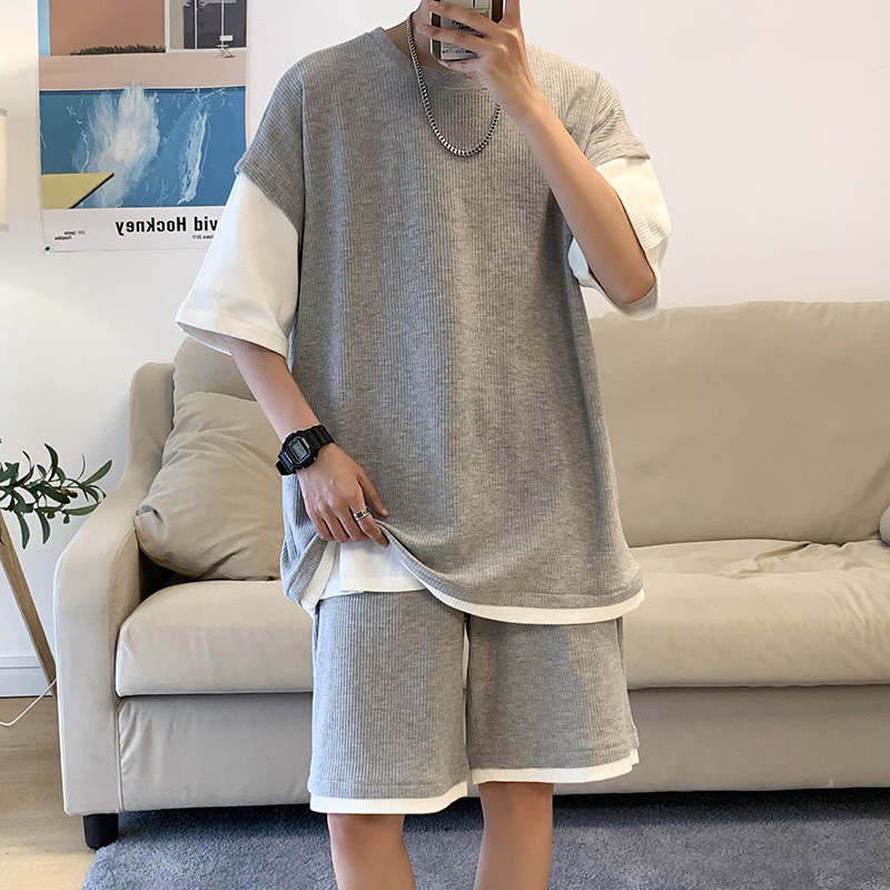 가짜 투피스 세트 남성용 유행 브랜드 유행 스포츠 탑 여름 얇은 와플 반팔 반바지 투피스 세트