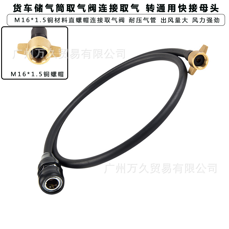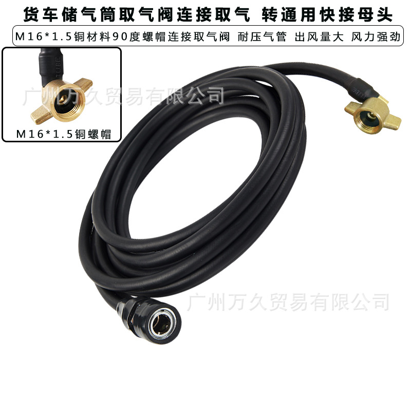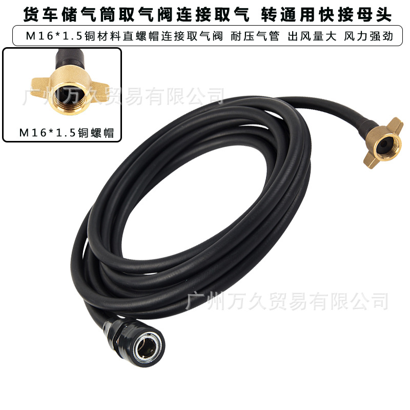 1.采用耐高压橡胶管,三层材料,防冻,不发硬,耐压高达18公斤,同时采用一体成型结构快接SP20通用大接母头,全防护套,耐用度高,一端M16*1.5铜螺帽直接连接货车取气阀。