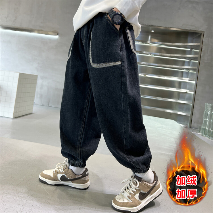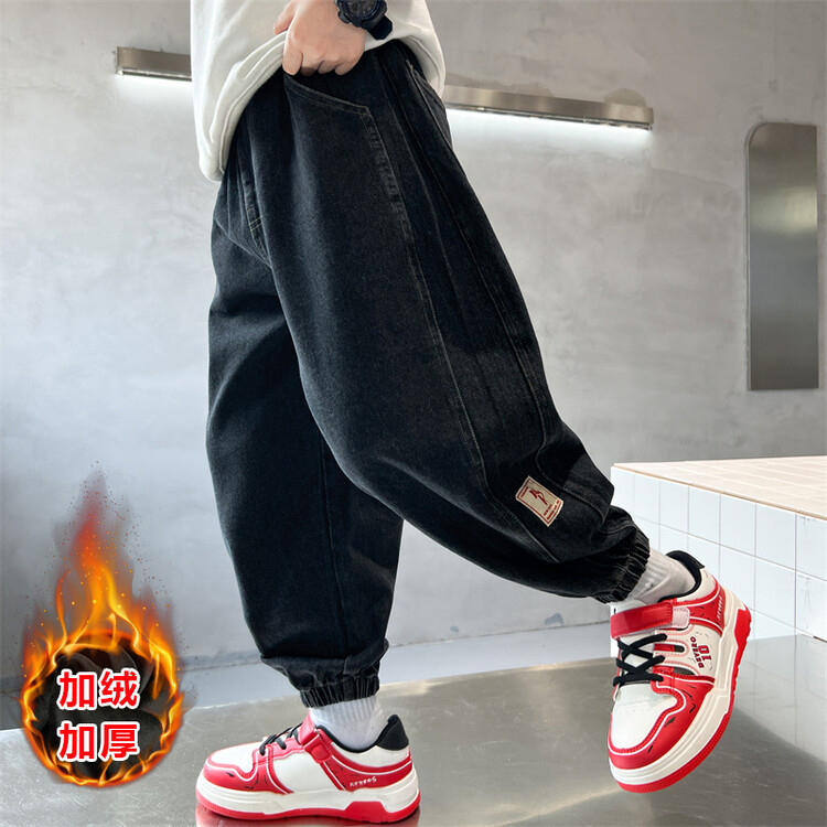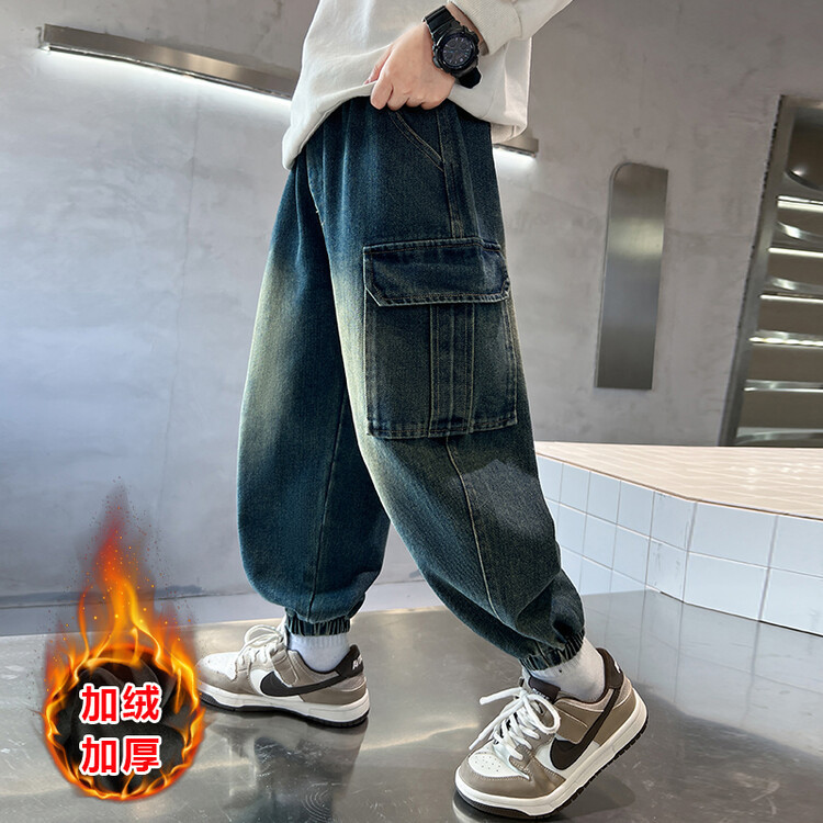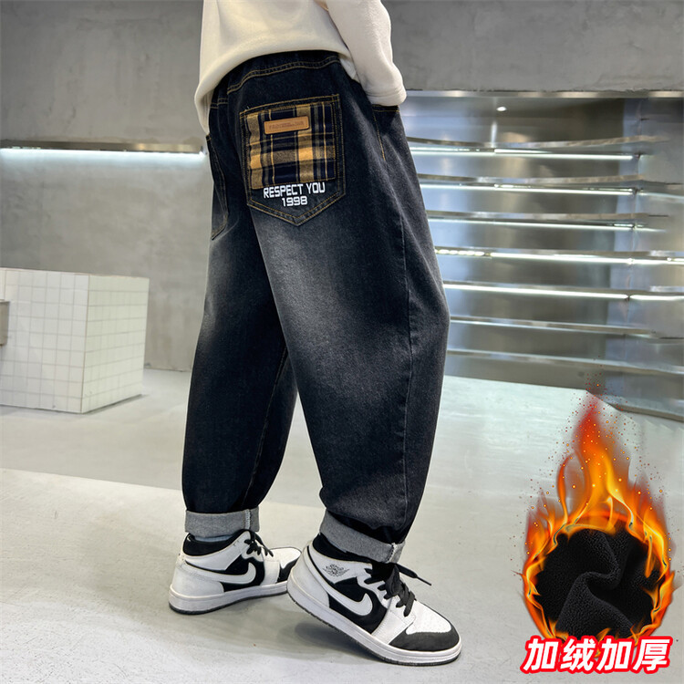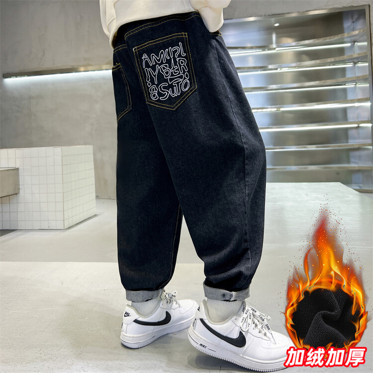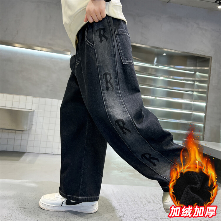 소년의 기모 청바지 2024 새로운 원피스 벨벳 바지 큰 아이들의 두꺼운 따뜻한 바지 느슨한 겨울 트렌디스토어 가기