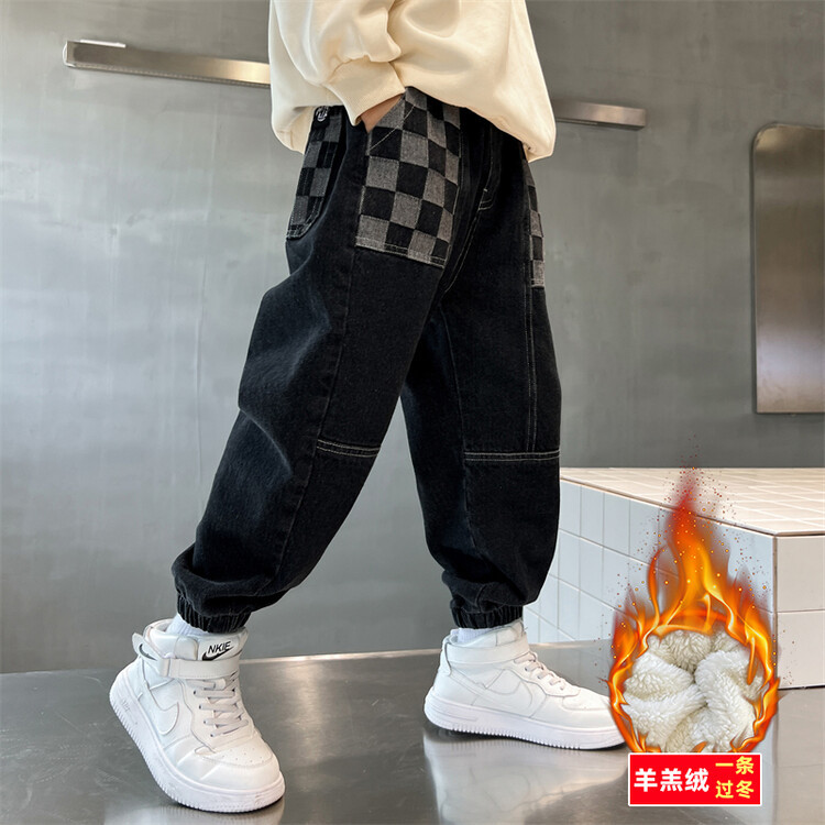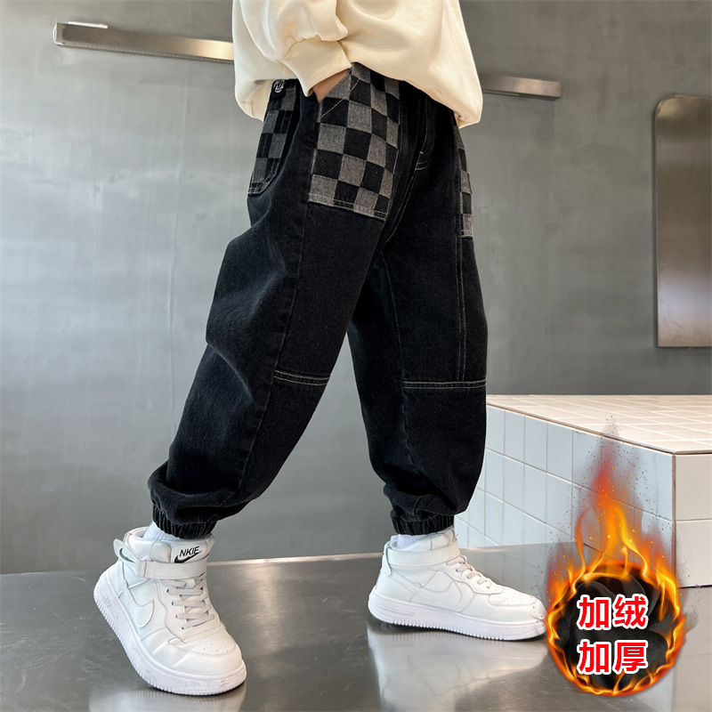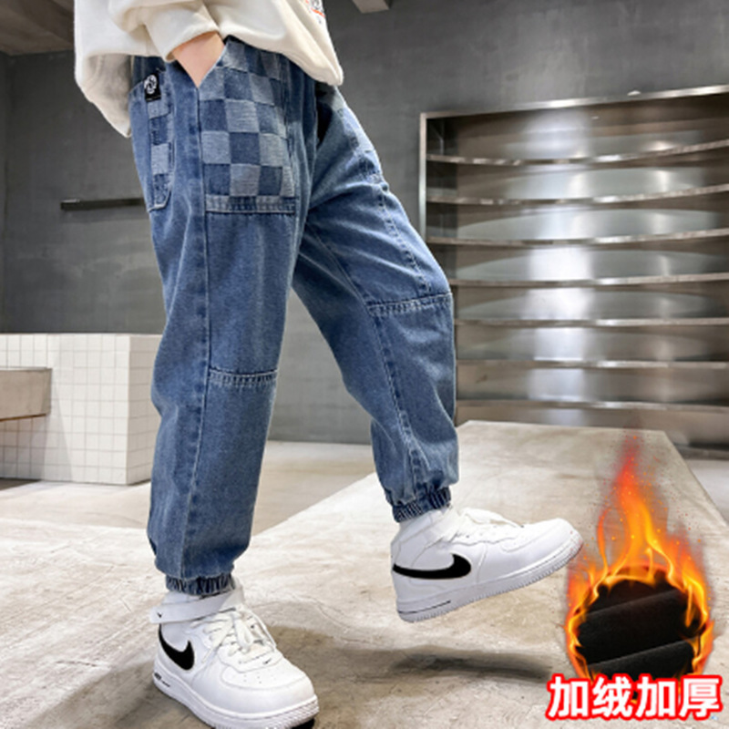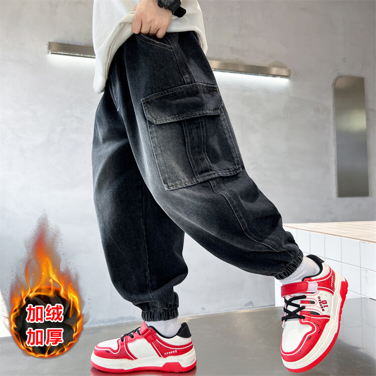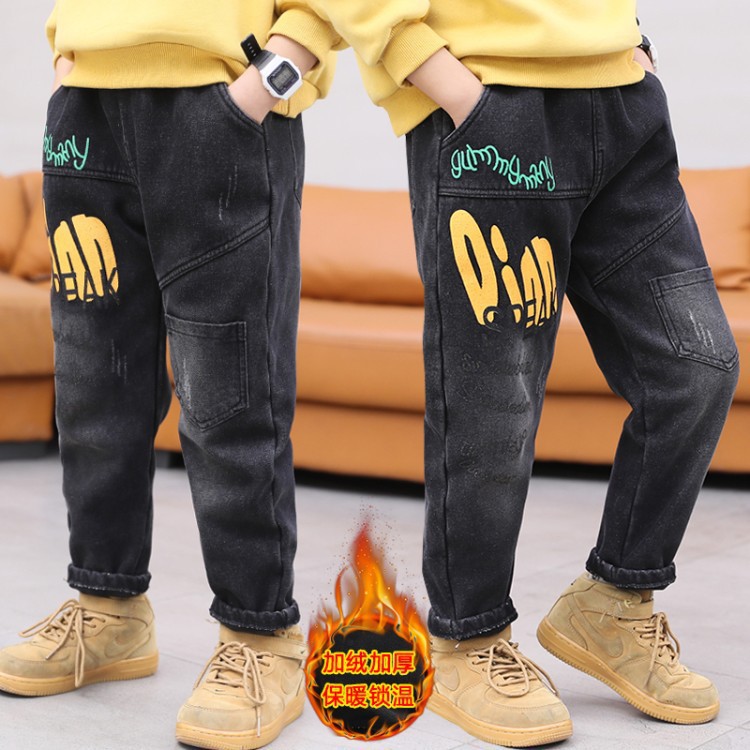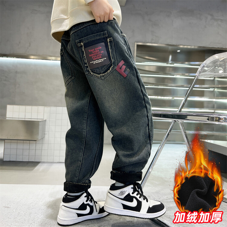 소년의 기모 청바지 2024 새로운 원피스 벨벳 바지 큰 아이들의 두꺼운 따뜻한 바지 느슨한 겨울 트렌디스토어 가기