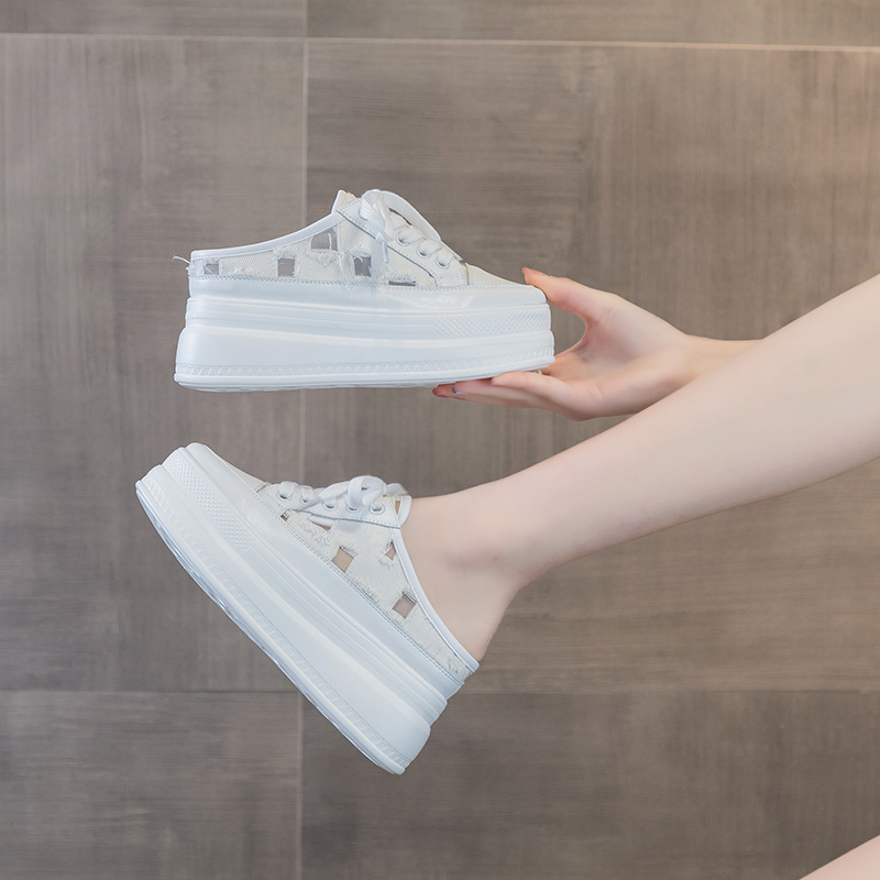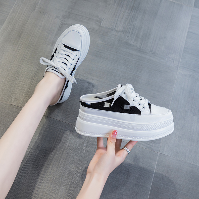 여성용 반슬리퍼 2025 여름 슬립온 앞코가 막힌 캔버스 화이트 슈즈 두꺼운 밑창 키높이 여성화 편안함