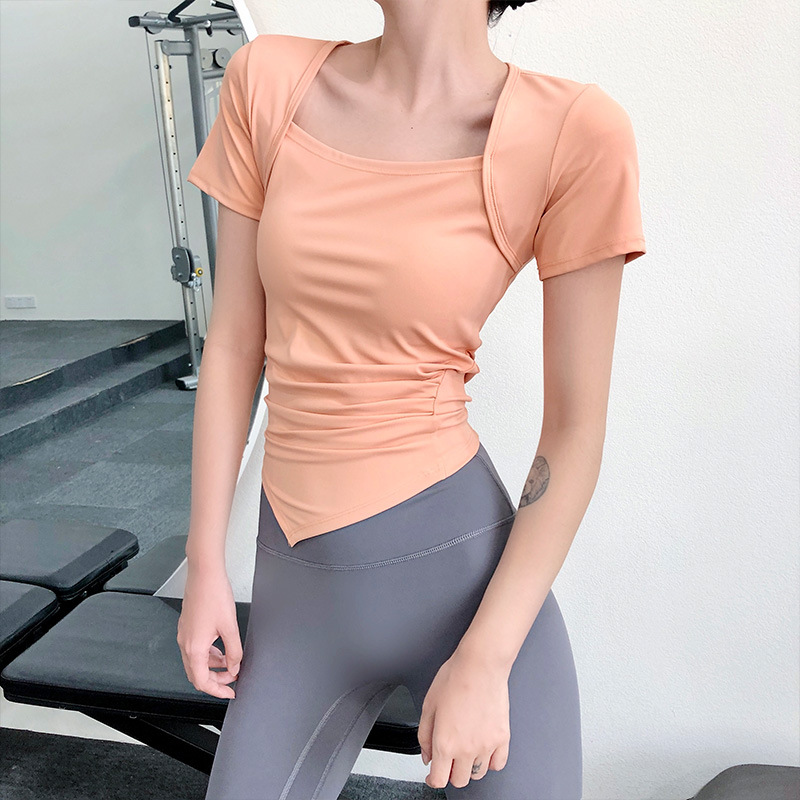 스퀘어 칼라 스포츠 반팔 여성의 꽉 피트니스 세트 속건 반팔 티셔츠 여름 얇은 불규칙한 요가 세트스토어 가기