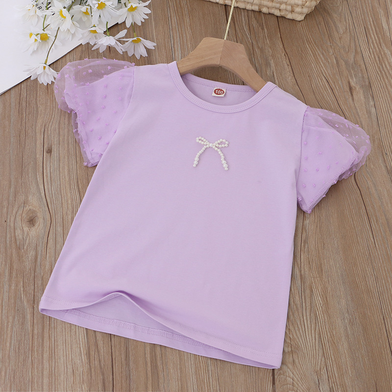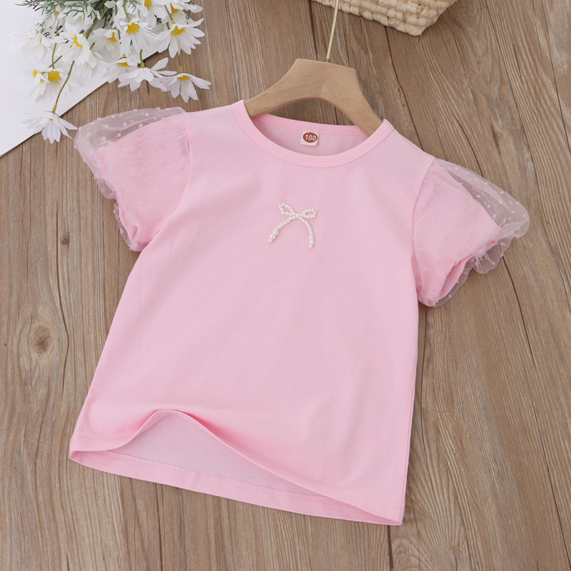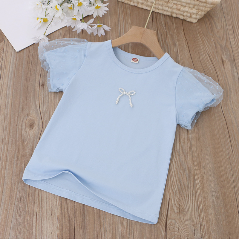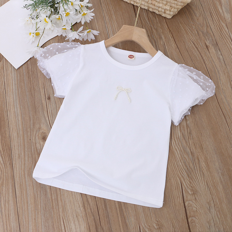 2025 여자 여름 반팔 탑 어린 소녀 티셔츠 중간 아동 반팔 티셔츠 퍼프 슬리브 진주 드롭 배송