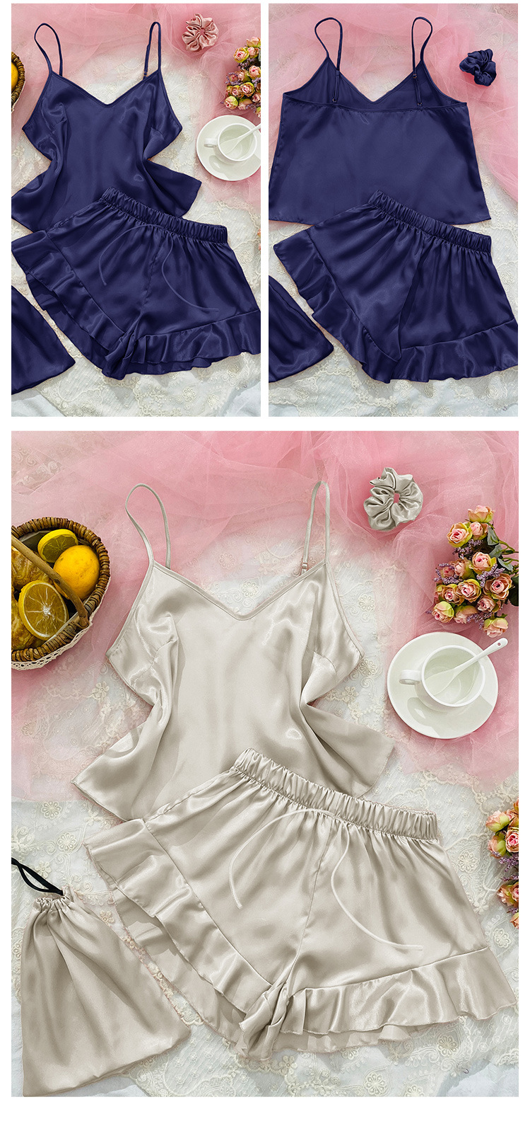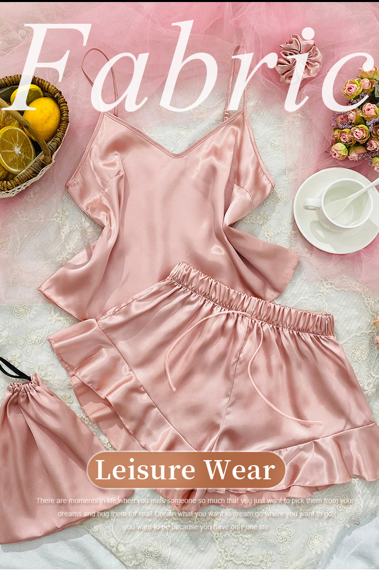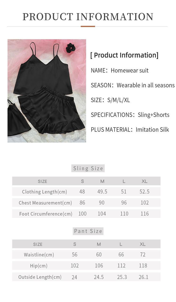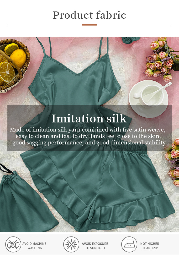 시뮬레이션 실크 서스펜더 홈웨어 3 피스 세트 심플 캐주얼 아이스 실크 백리스 서스펜더 반바지 세트 여성용 섹시한 잠옷