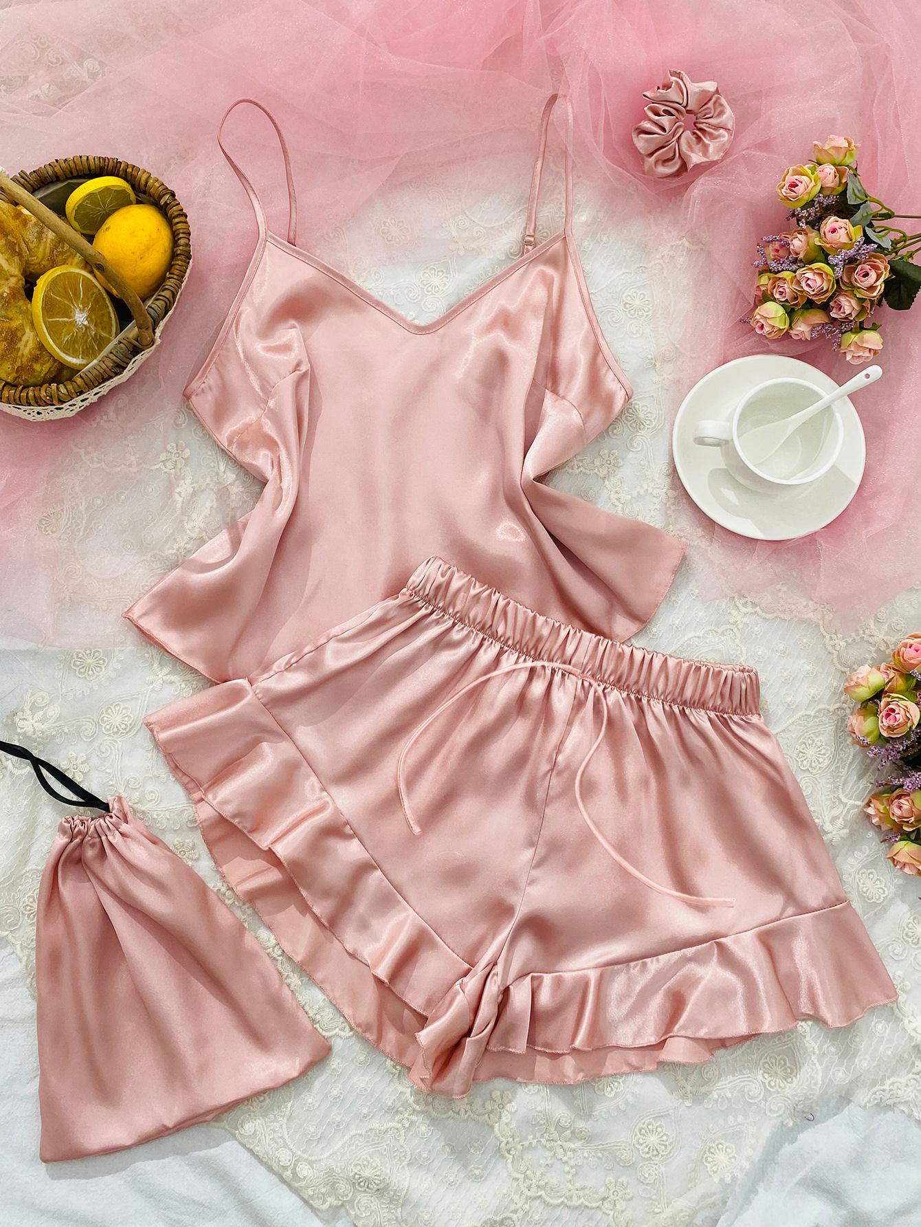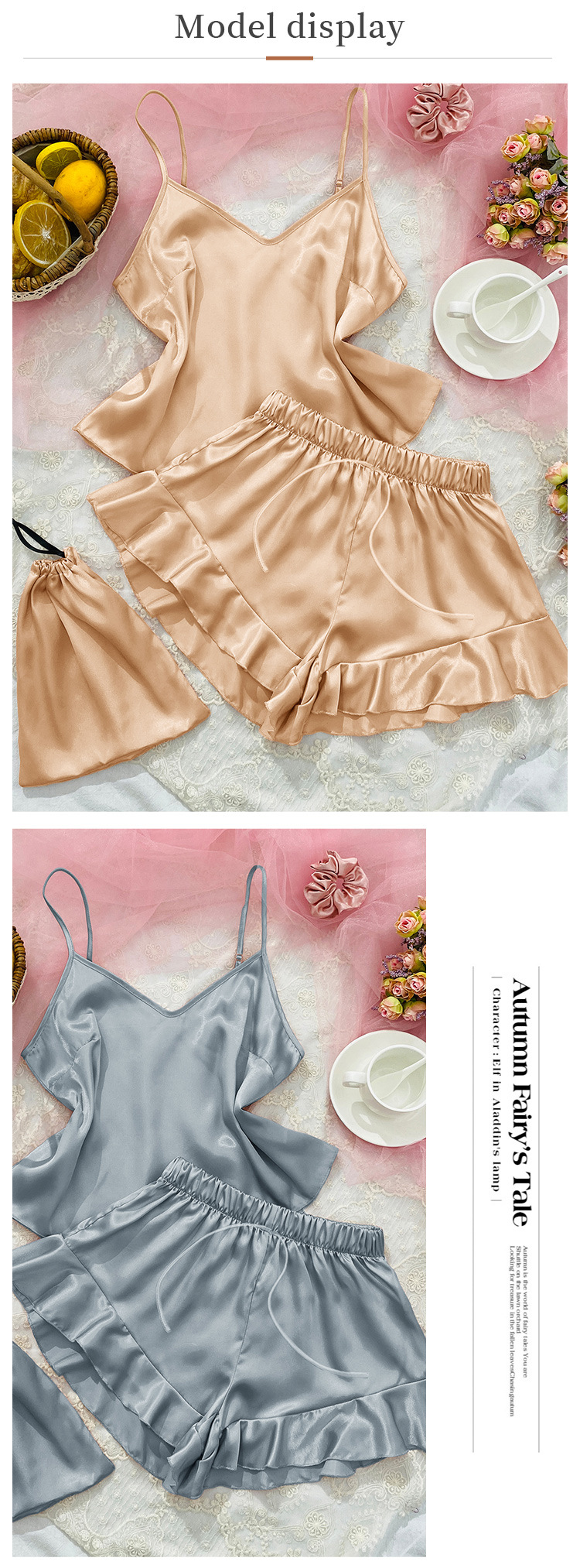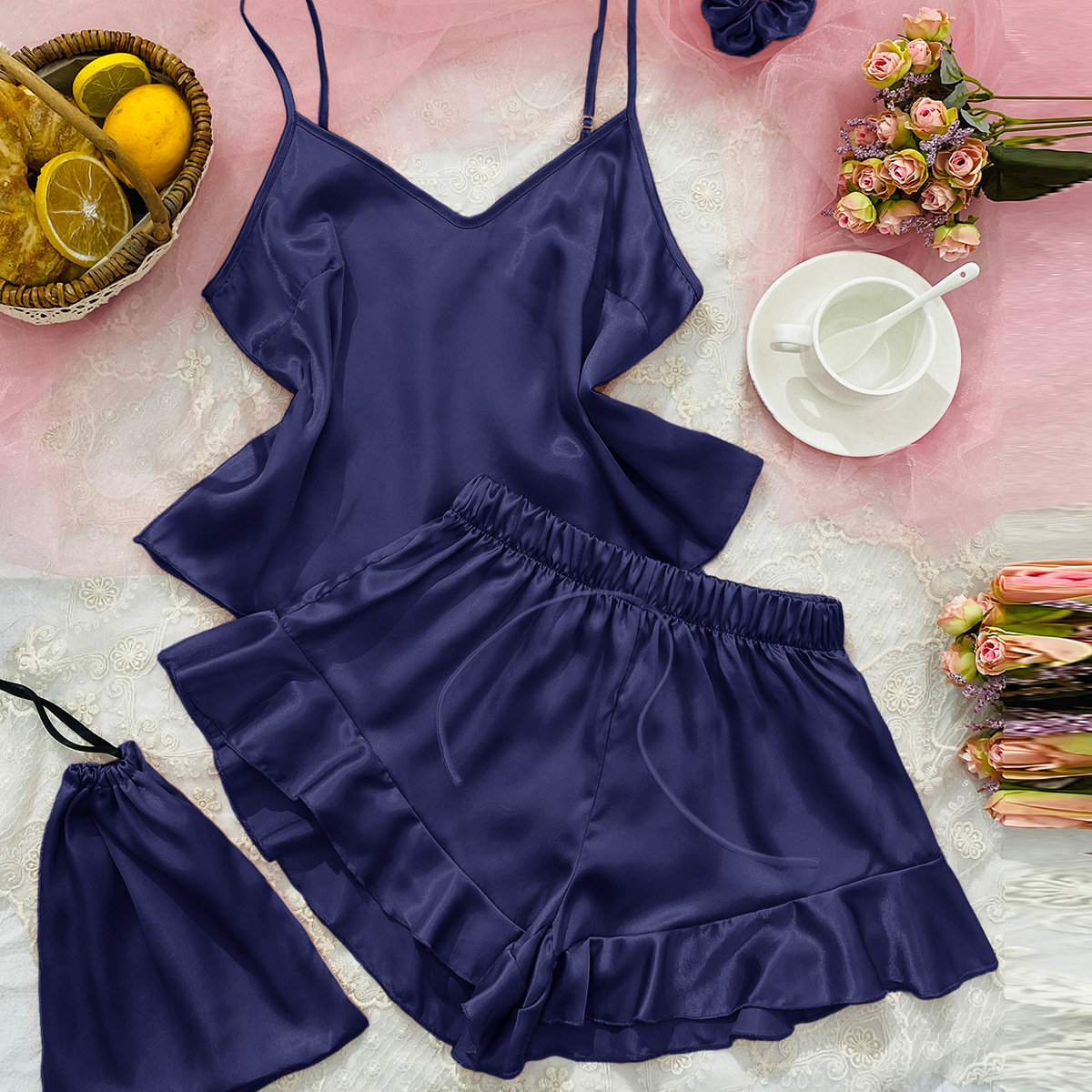 시뮬레이션 실크 서스펜더 홈웨어 3 피스 세트 심플 캐주얼 아이스 실크 백리스 서스펜더 반바지 세트 여성용 섹시한 잠옷