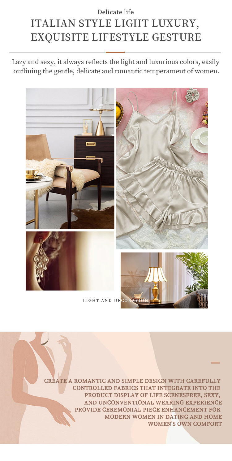 시뮬레이션 실크 서스펜더 홈웨어 3 피스 세트 심플 캐주얼 아이스 실크 백리스 서스펜더 반바지 세트 여성용 섹시한 잠옷스토어 가기
