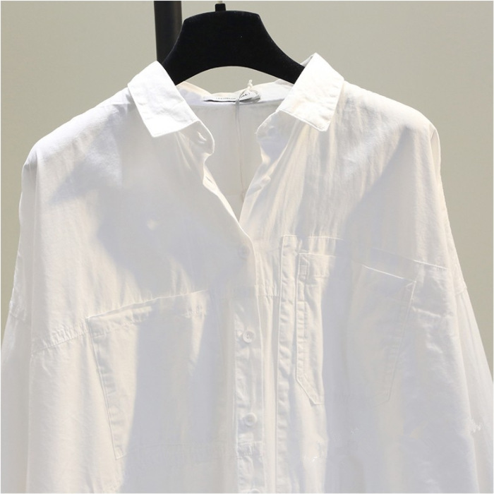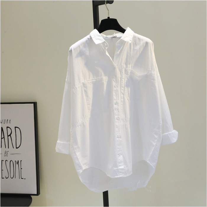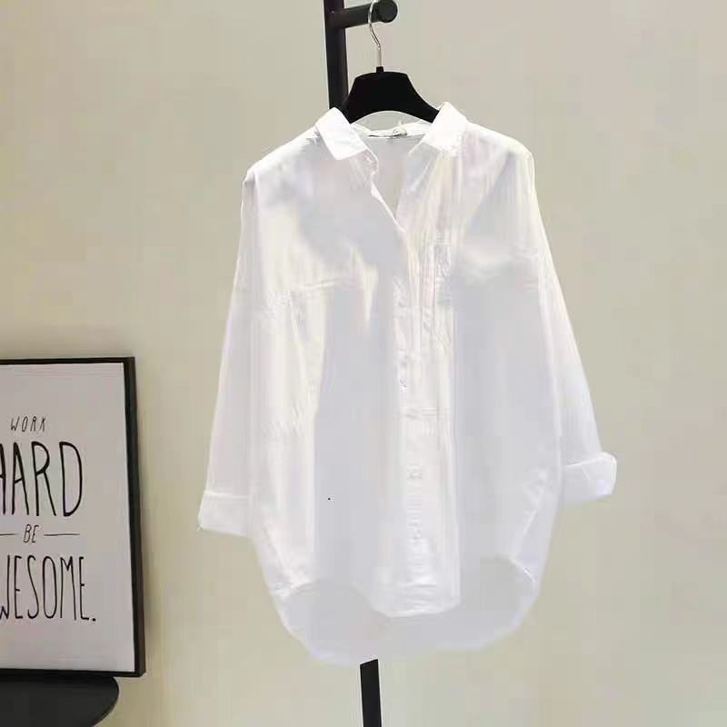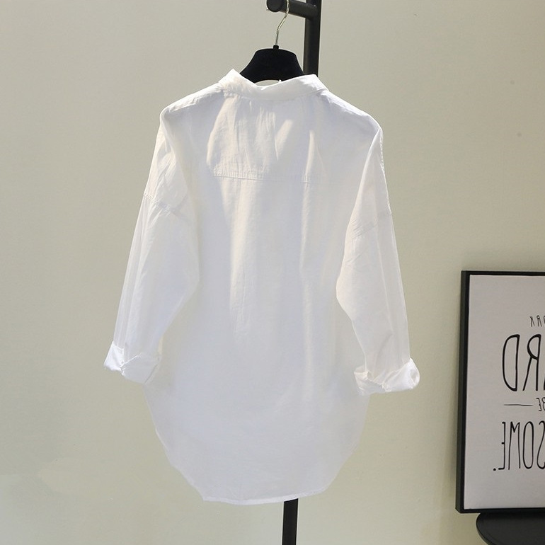 새로운 코튼 싱글 브레스트 라펠 솔리드 컬러 중간 길이 셔츠 가디건 화이트 루즈한 여성용 긴팔 셔츠스토어 가기