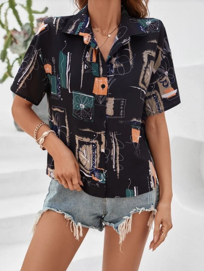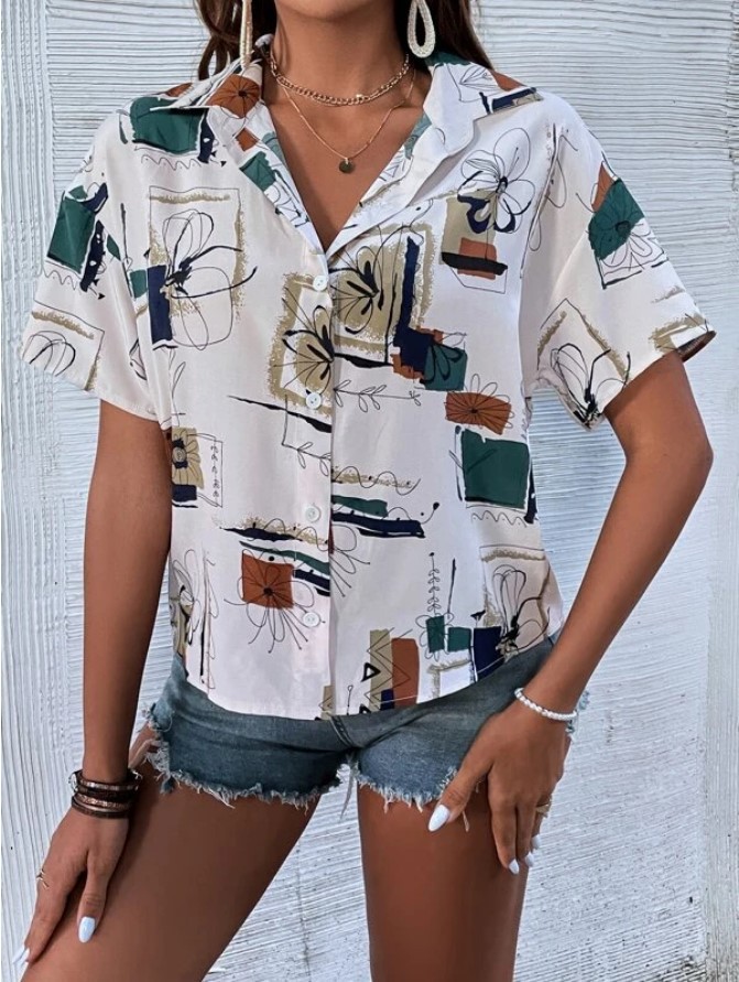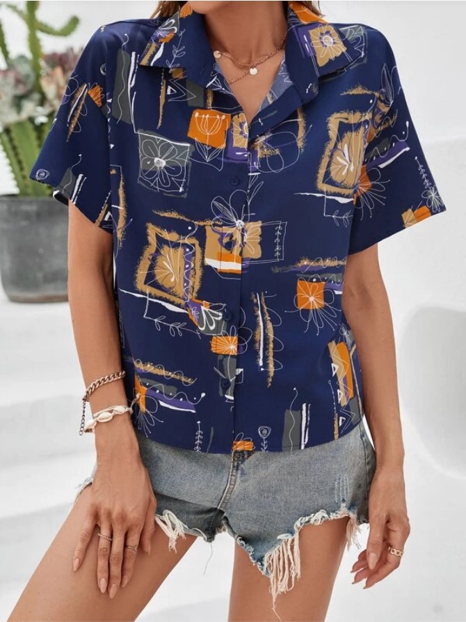 독립 스테이션 2022 유럽과 미국 여름 새로운 캐주얼 소원 싱글 브레스트 가디건 프로페셔널 라펠 프린트 반팔 셔츠