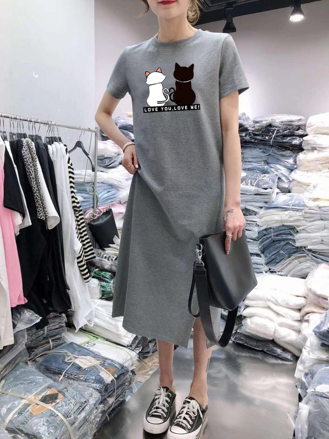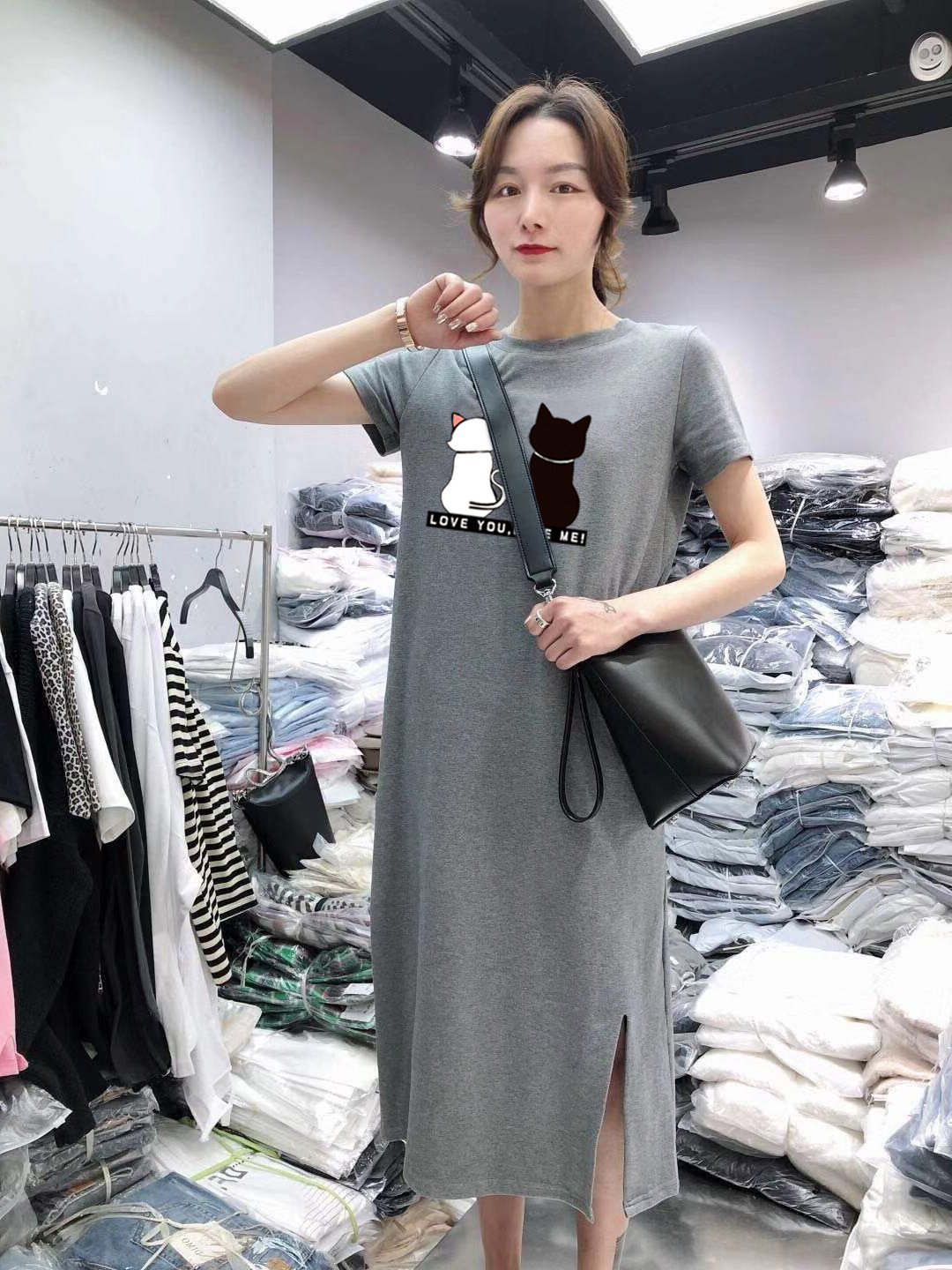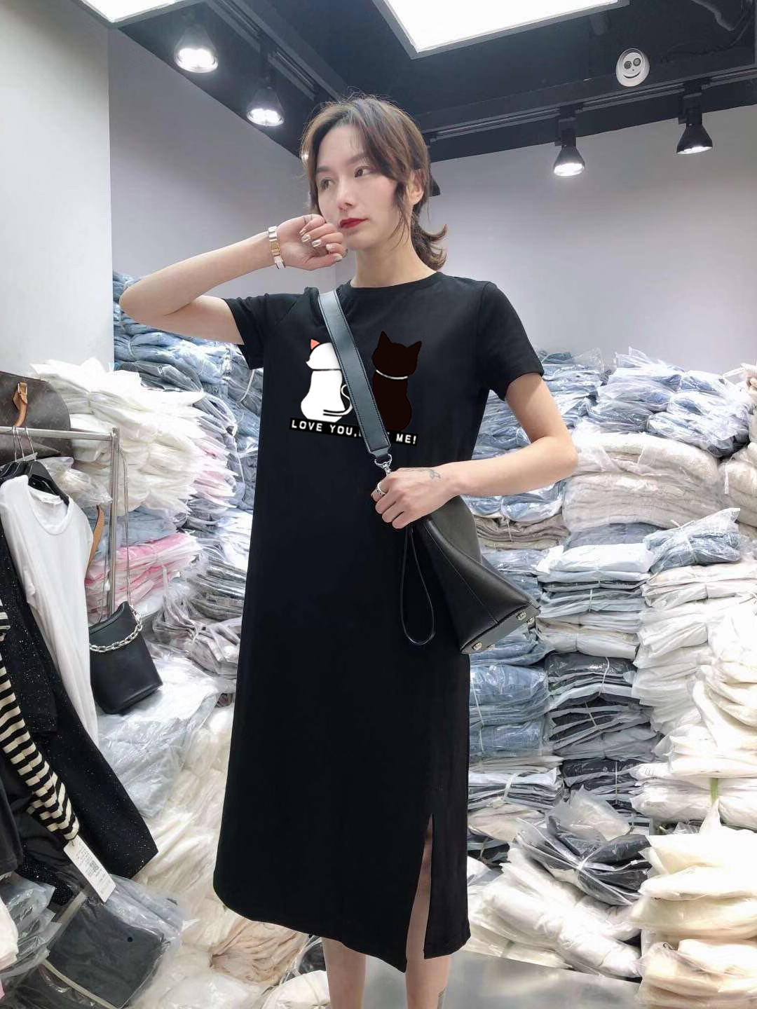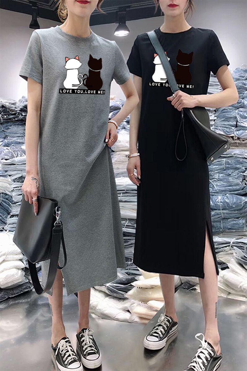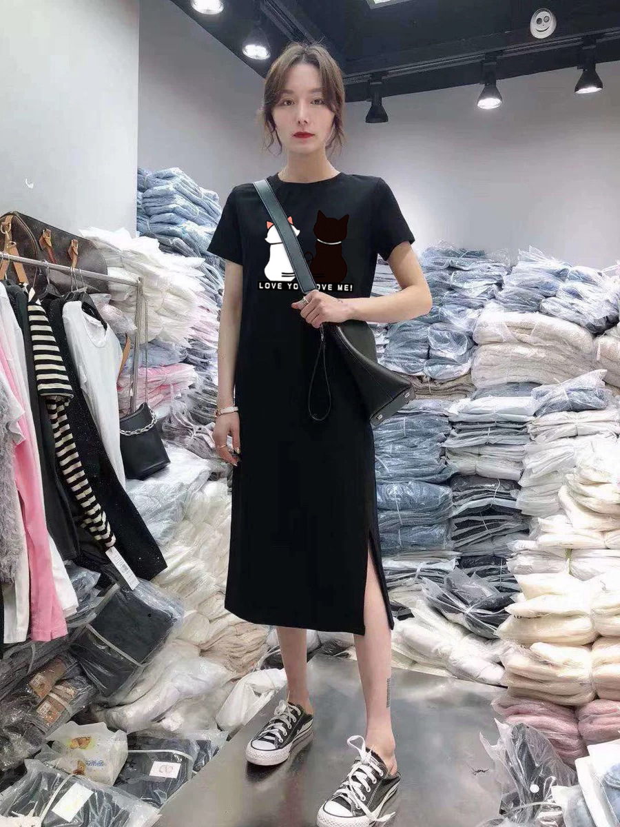새로운 스타일의 루즈핏 흑백 고양이 프린트 원피스, 패셔너블한 슬릿 디자인, 반팔 여성복, 우아한 스타일스토어 가기