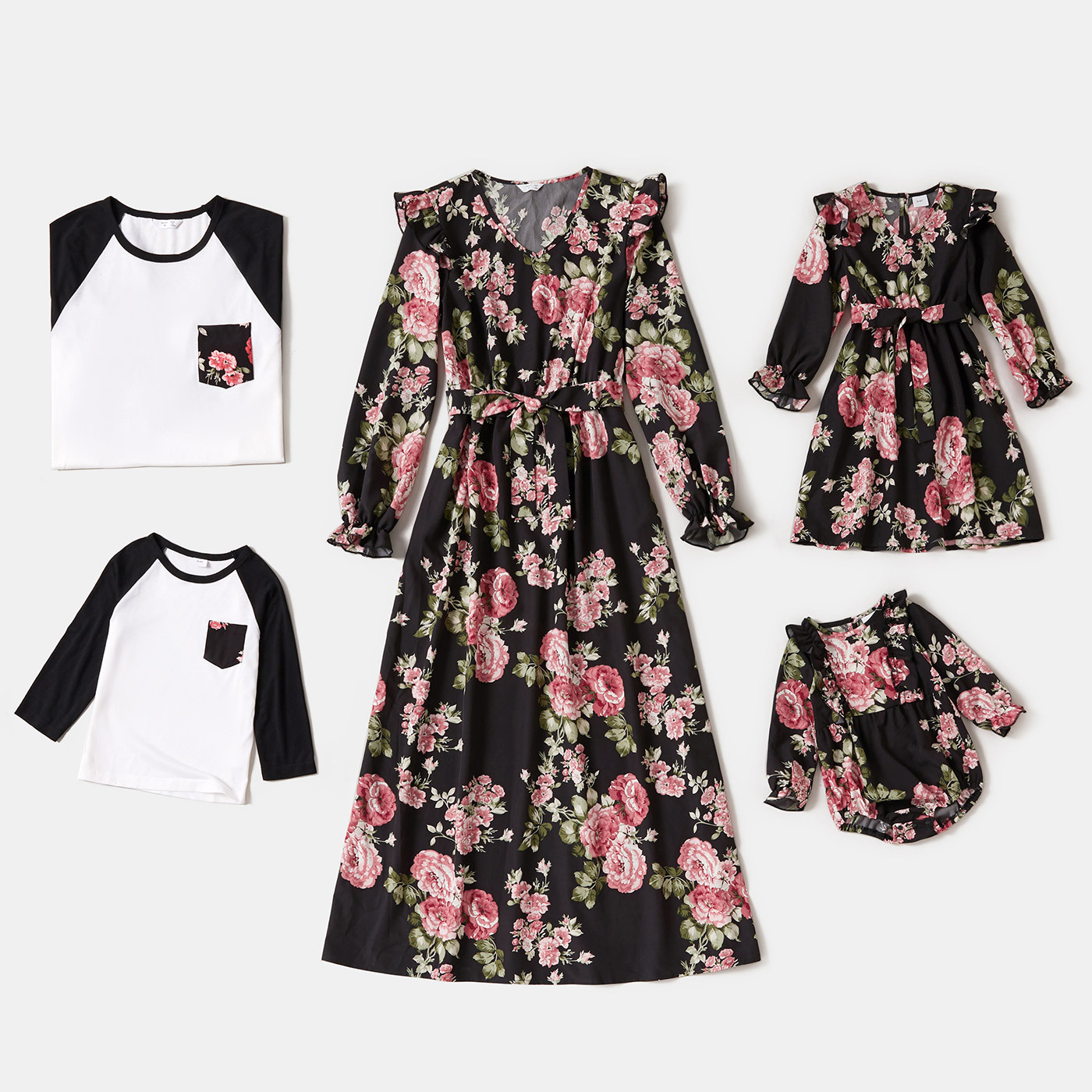 • 213104 검은 배경 핑크 꽃 긴 소매 원피스