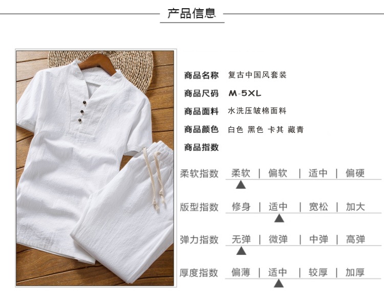 중국식 남성 여름 린넨 세트 남성면 및 린넨 느슨한 캐주얼 반팔 티셔츠 크롭 팬츠 투피스 세트 패션스토어 가기