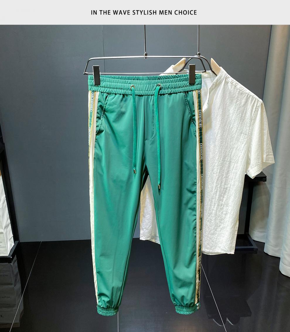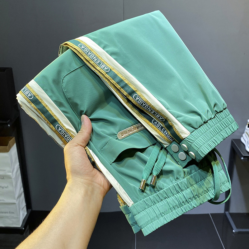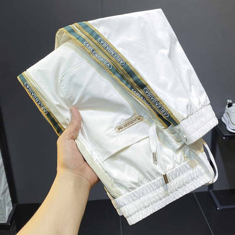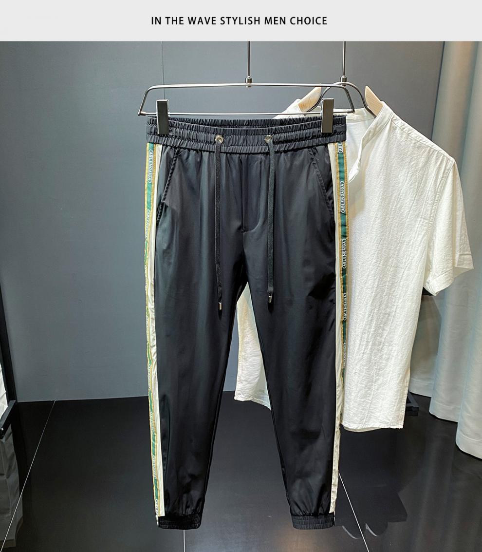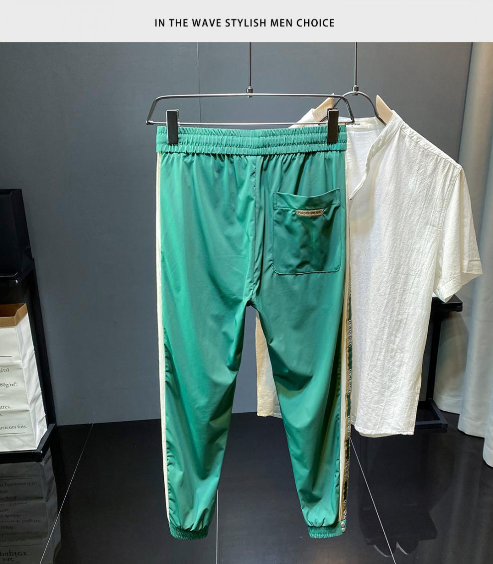 2022 여름 초박형 아이스 실크 사이드 스트라이프 레그 캐주얼 팬츠 남성용 트렌디 브랜드 슬림핏 드로스트링 나인포인트 스포츠 팬츠