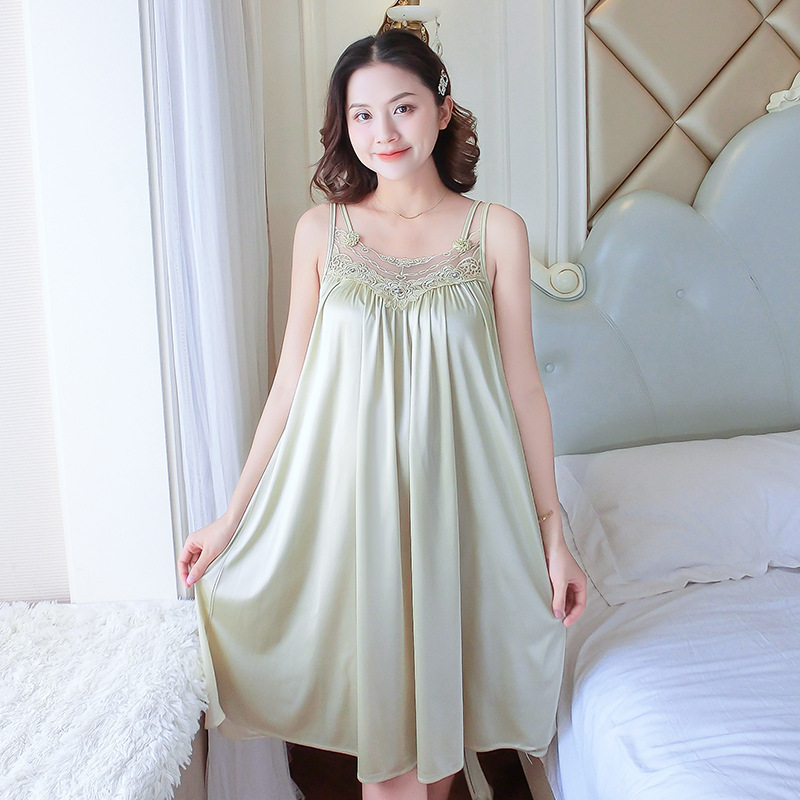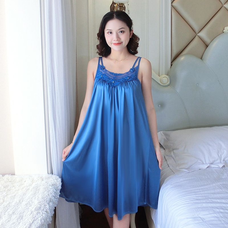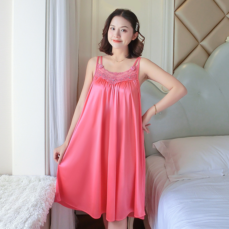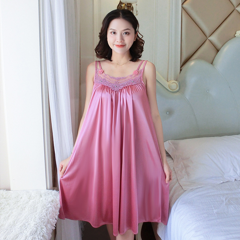 봄과 여름 실크 잠옷 여자의 섹시한 잠옷 여름 슬링 레이스 대형 원피스 싱글 느슨한 가정 옷