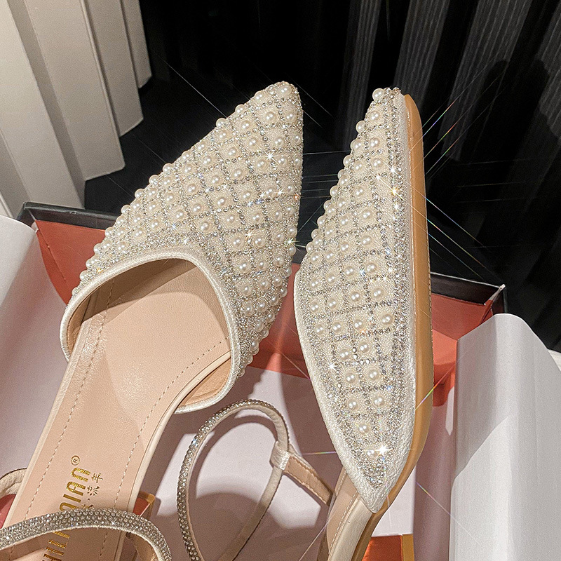 Baotou 청키 힐 샌들 여성용 2023 여름 새로운 요정 바람 뒤꿈치 다용도 뾰족한 모조 다이아몬드 스트랩 백 빈 싱글 레이어 신발스토어 가기