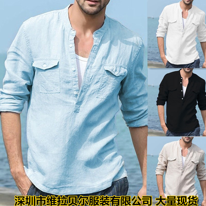 재고 독립 역 아마존 크로스 국경 대외 무역 새로운 남자의 면 린넨 캐주얼 긴 소매 셔츠 단색 스탠드 칼라 셔츠