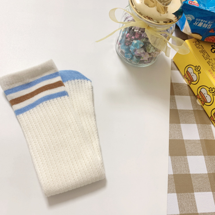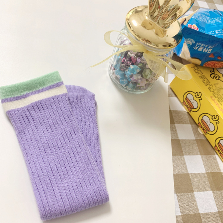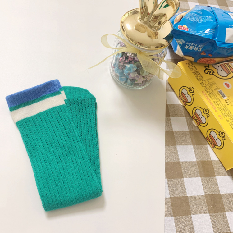 撞色横条镂空移圈男女儿童中筒直板袜