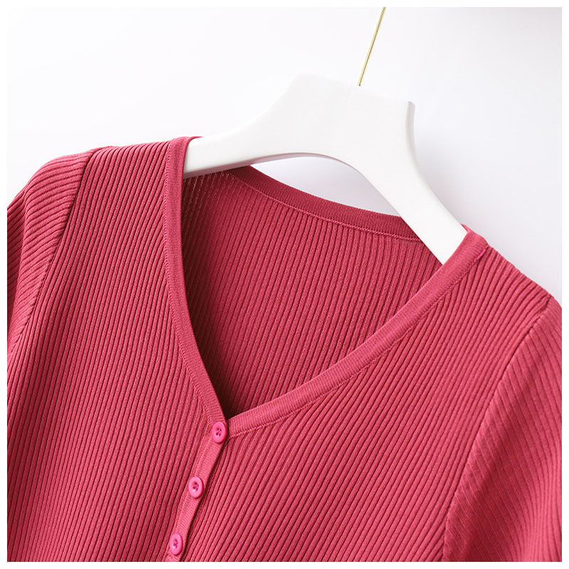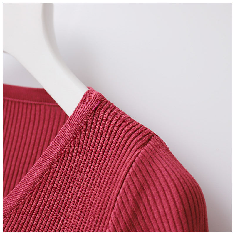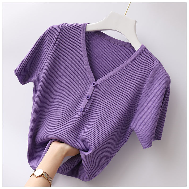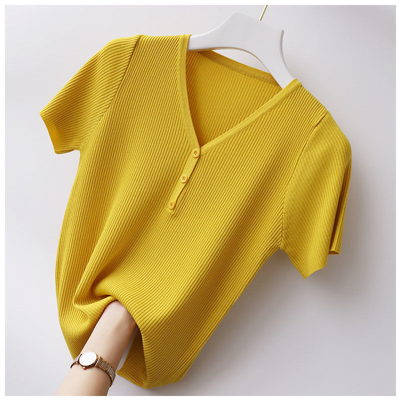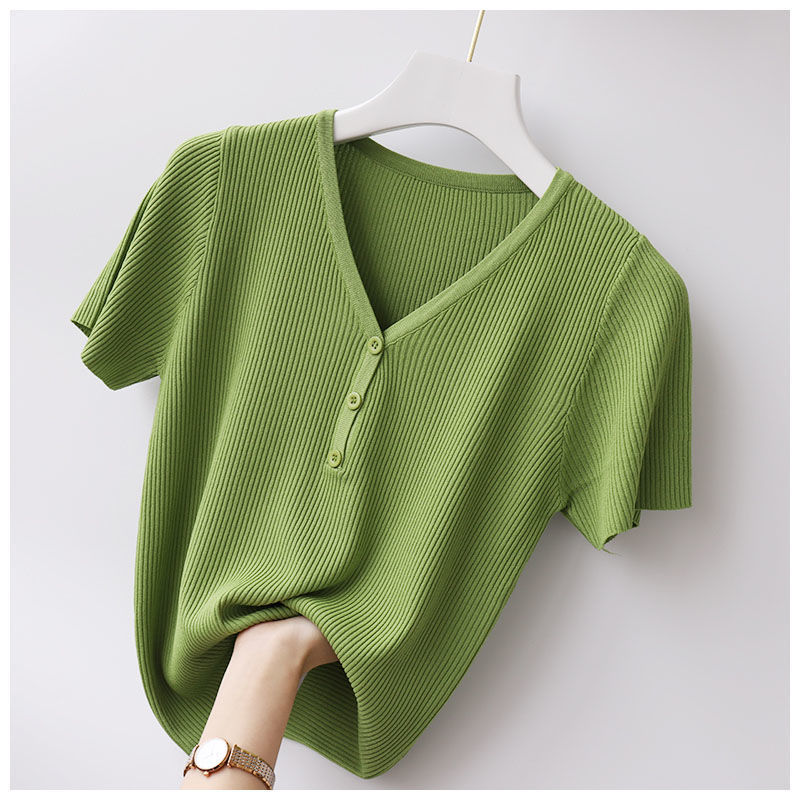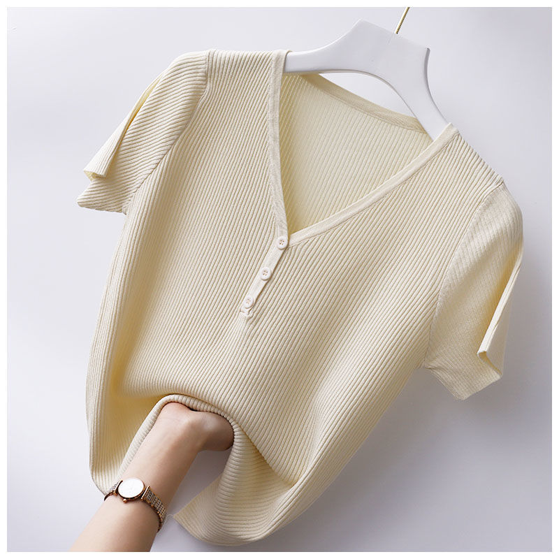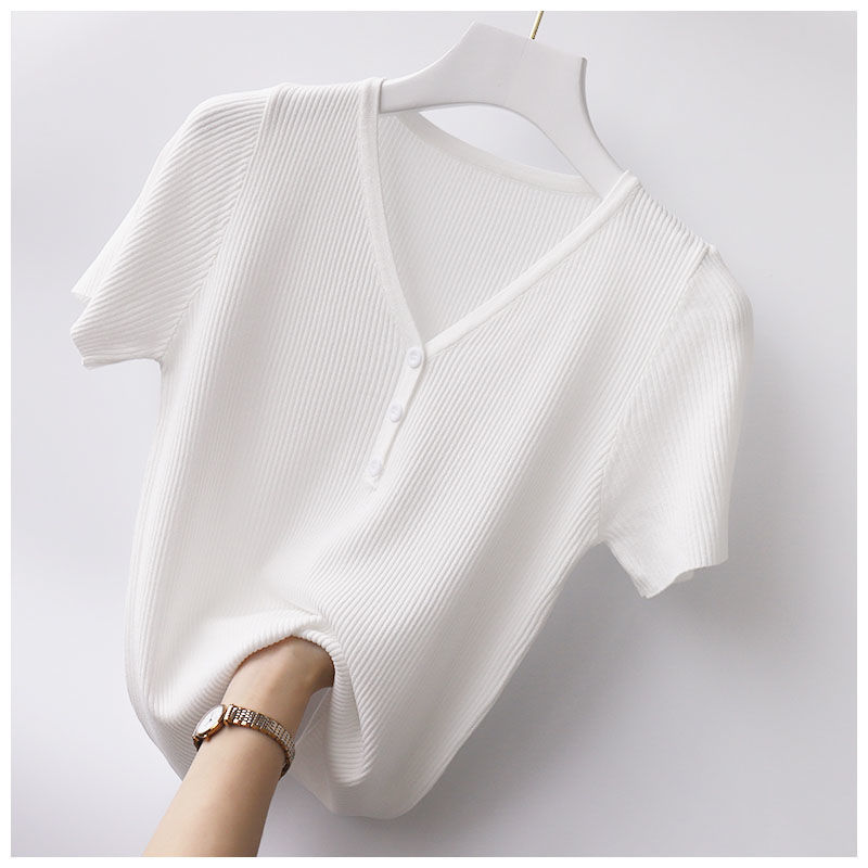 봄과 여름 새 티셔츠 여성용 반팔 한국식 짧은 브이넥 슬림핏 솔리드 컬러 패션 아이스 실크 베이스 니트 만능 슬리밍스토어 가기