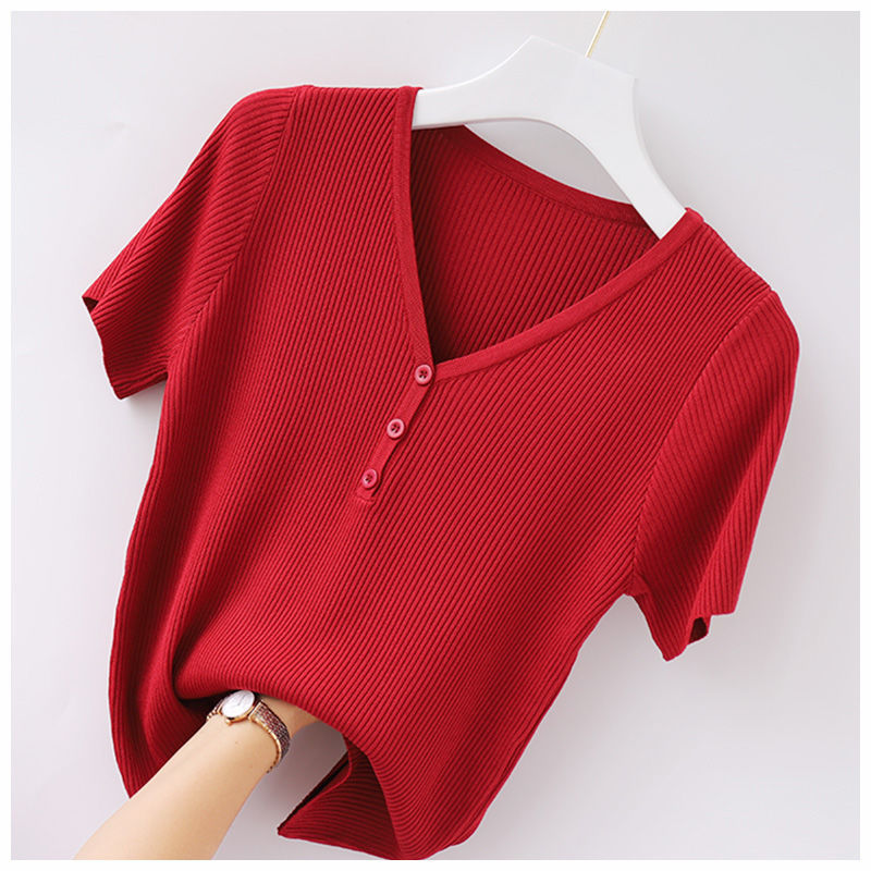 봄과 여름 새 티셔츠 여성용 반팔 한국식 짧은 브이넥 슬림핏 솔리드 컬러 패션 아이스 실크 베이스 니트 만능 슬리밍