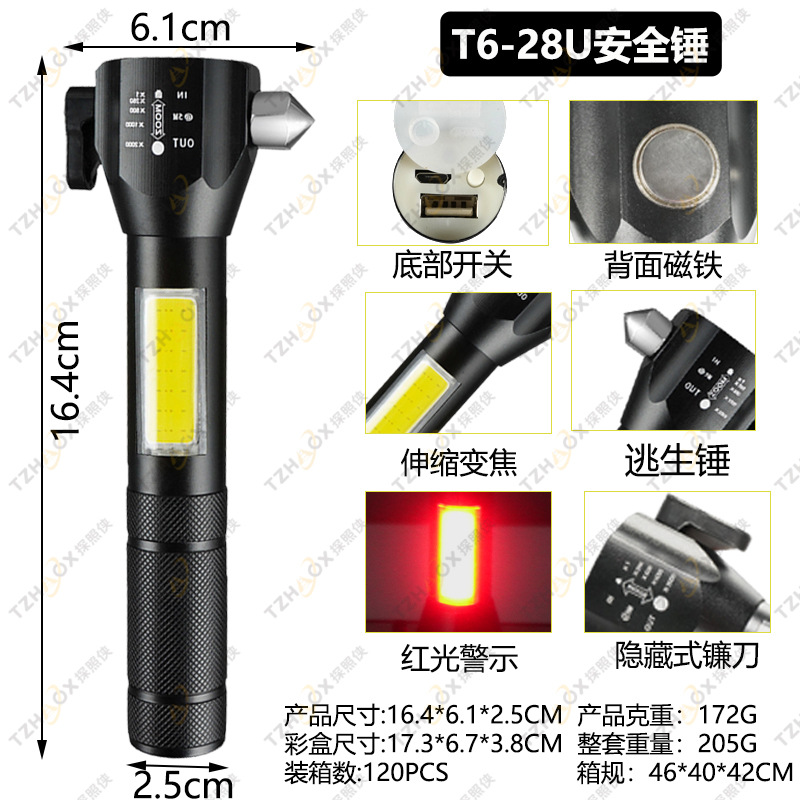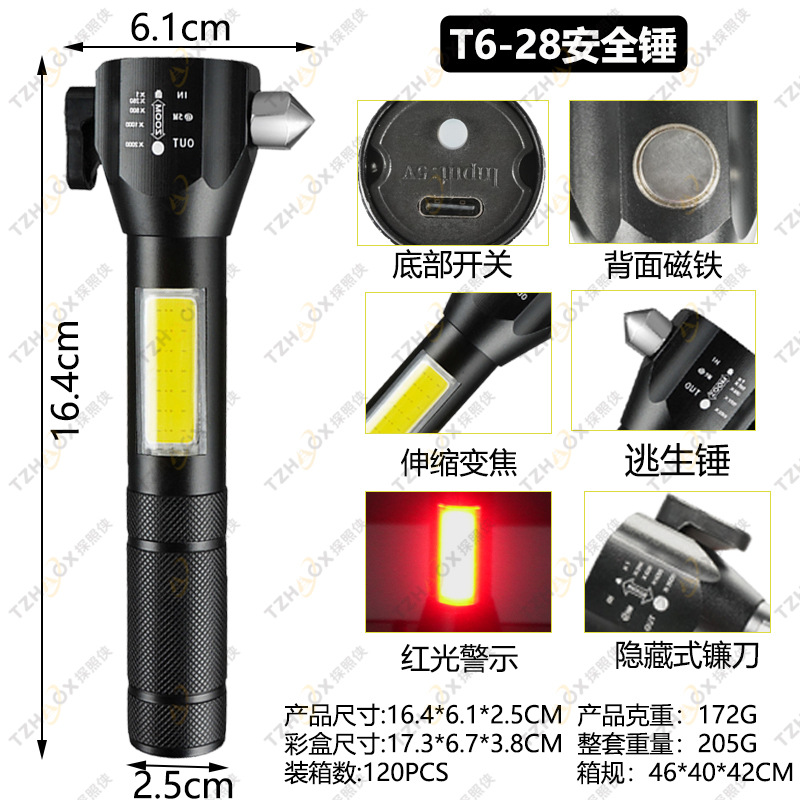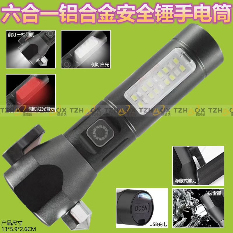 비상 탈출 다기능 차량용 손전등 LED 태양광 야외 비상등 COB 강광 창문 파괴 안전망치