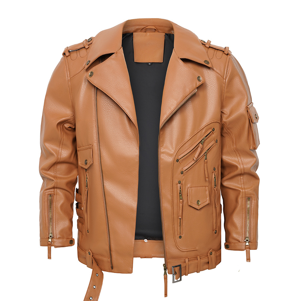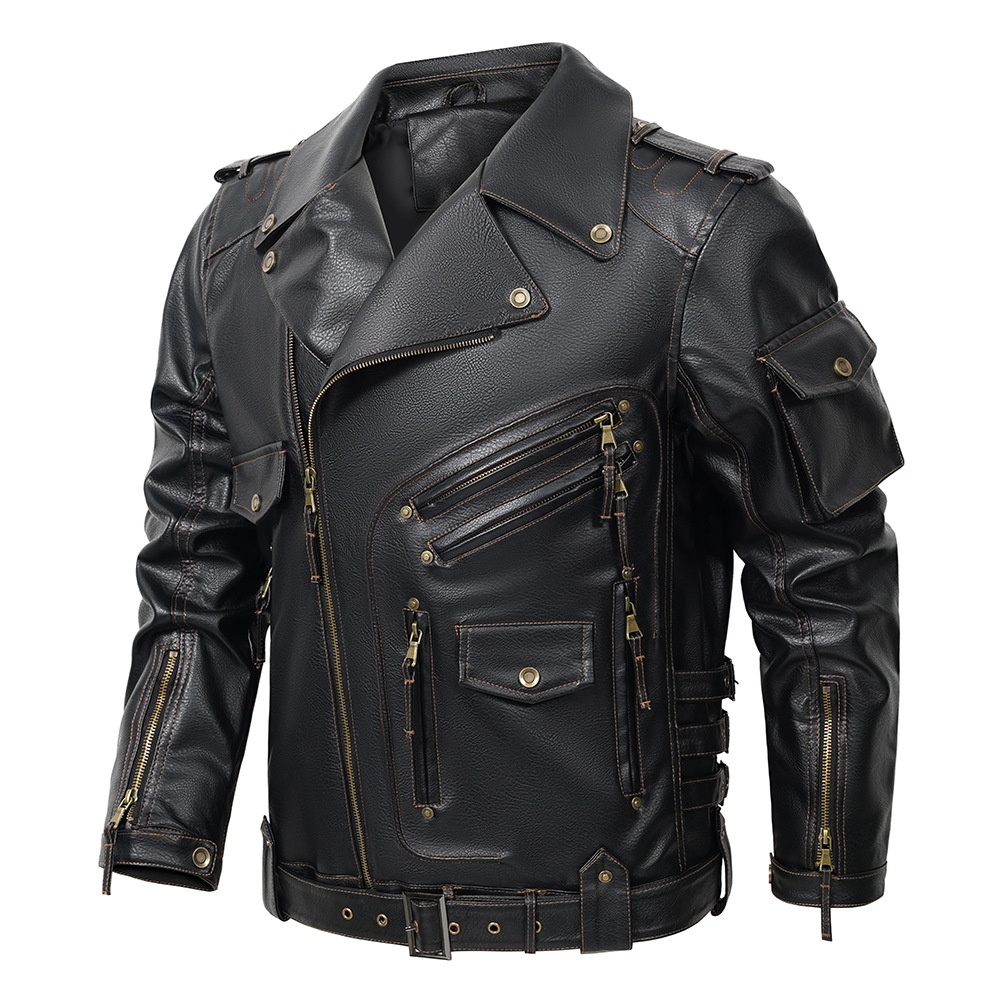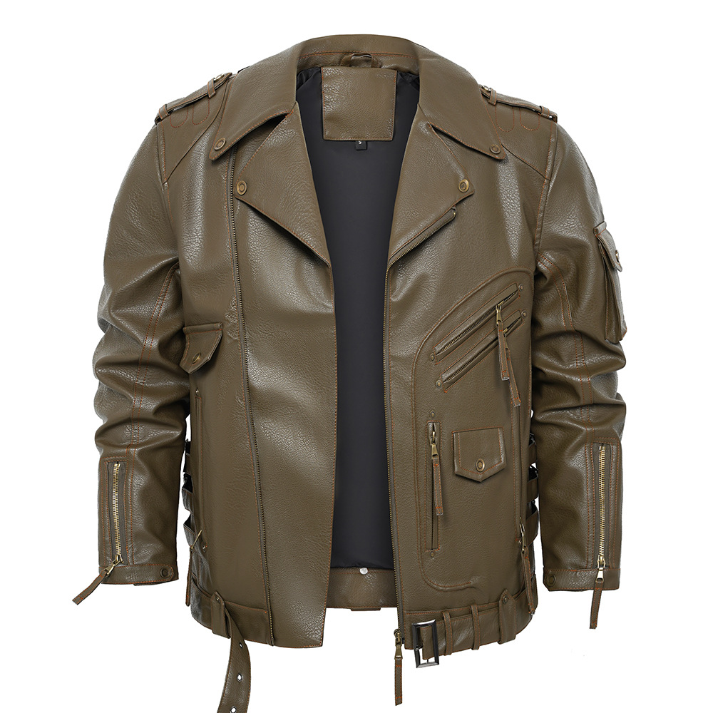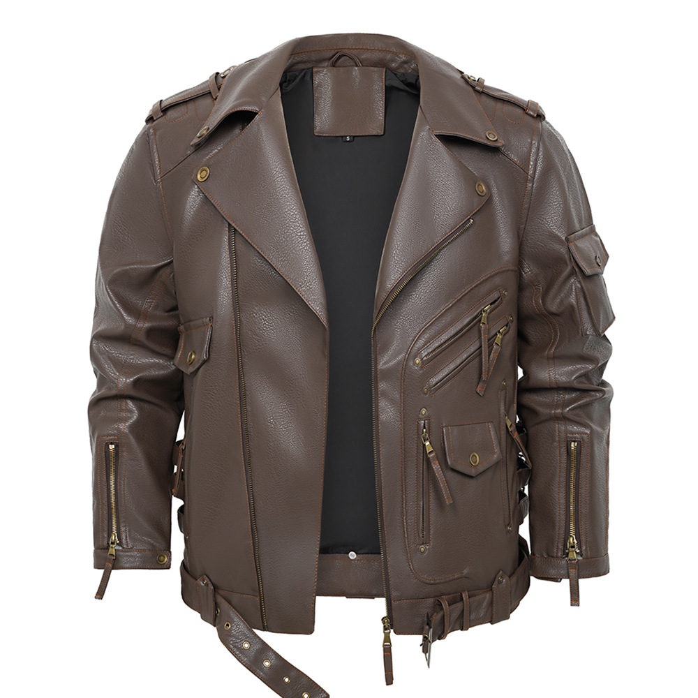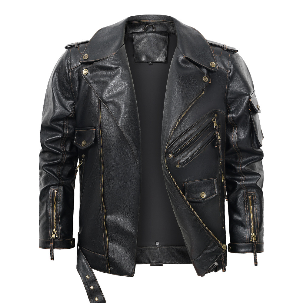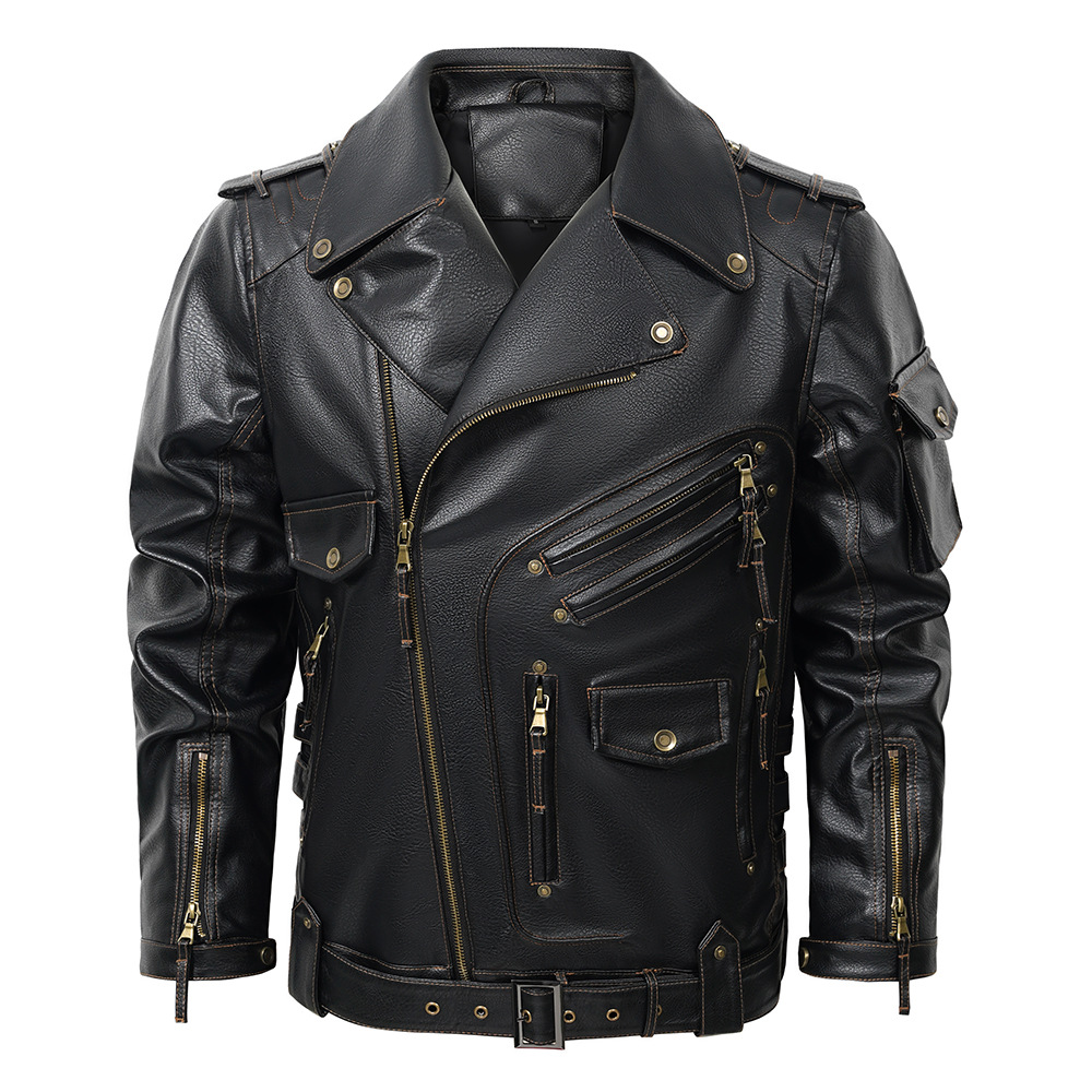 유럽과 미국 크로스 보더 오토바이 PU 가죽 자켓 아마존 멀티 포켓 지퍼 가죽 자켓 남성 가을과 겨울 펑크 자켓 유럽 사이즈