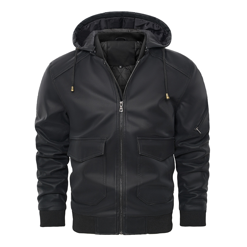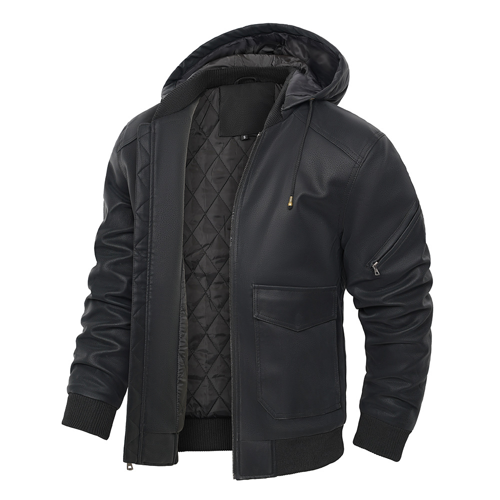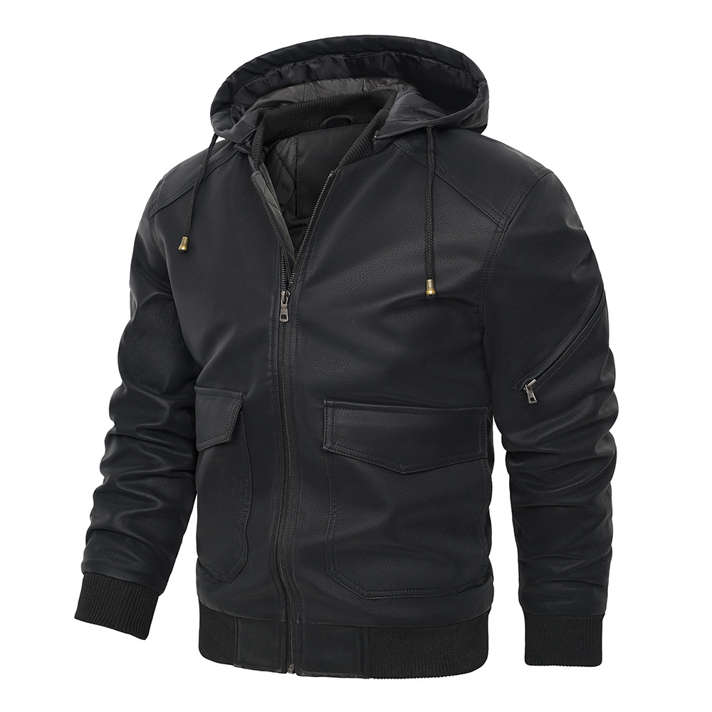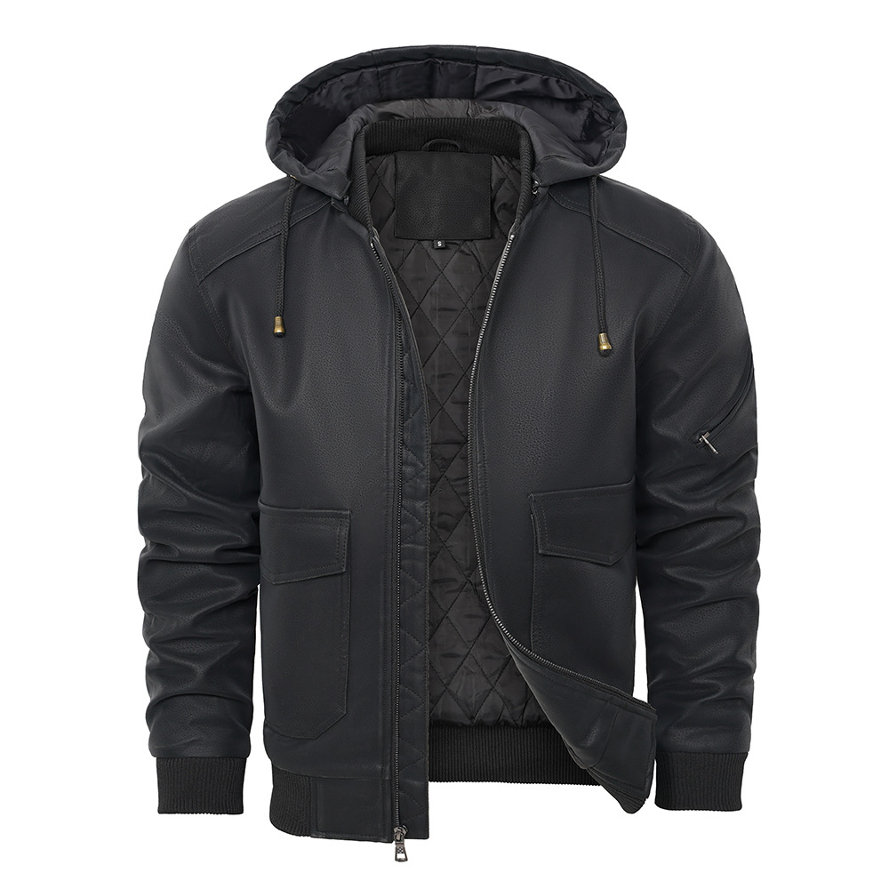 유럽과 미국 크로스 보더 후드 PU 가죽 자켓 아마존 두꺼운 가죽 남성 가을과 겨울 새로운 따뜻한 코트 유럽 사이즈