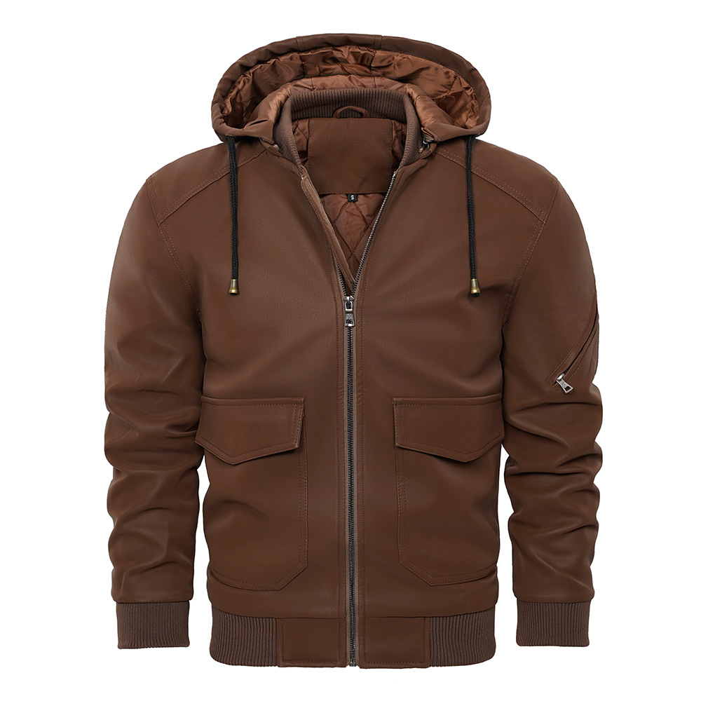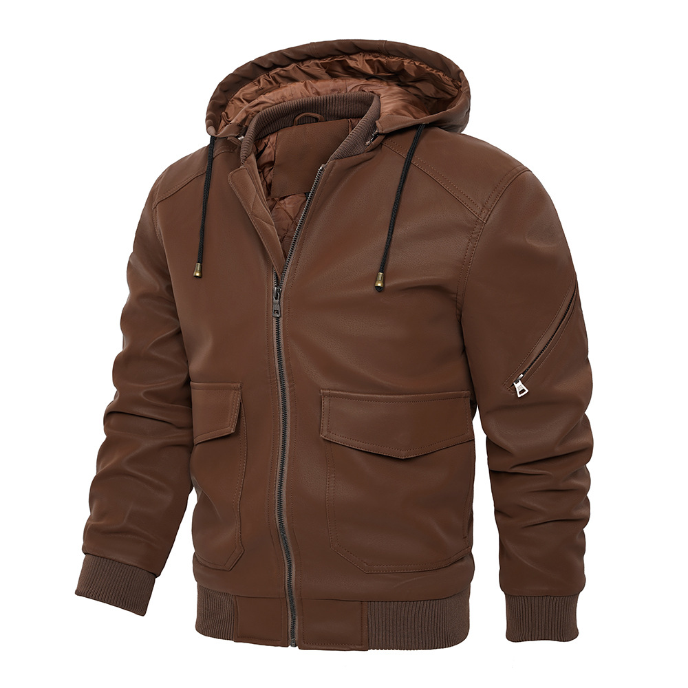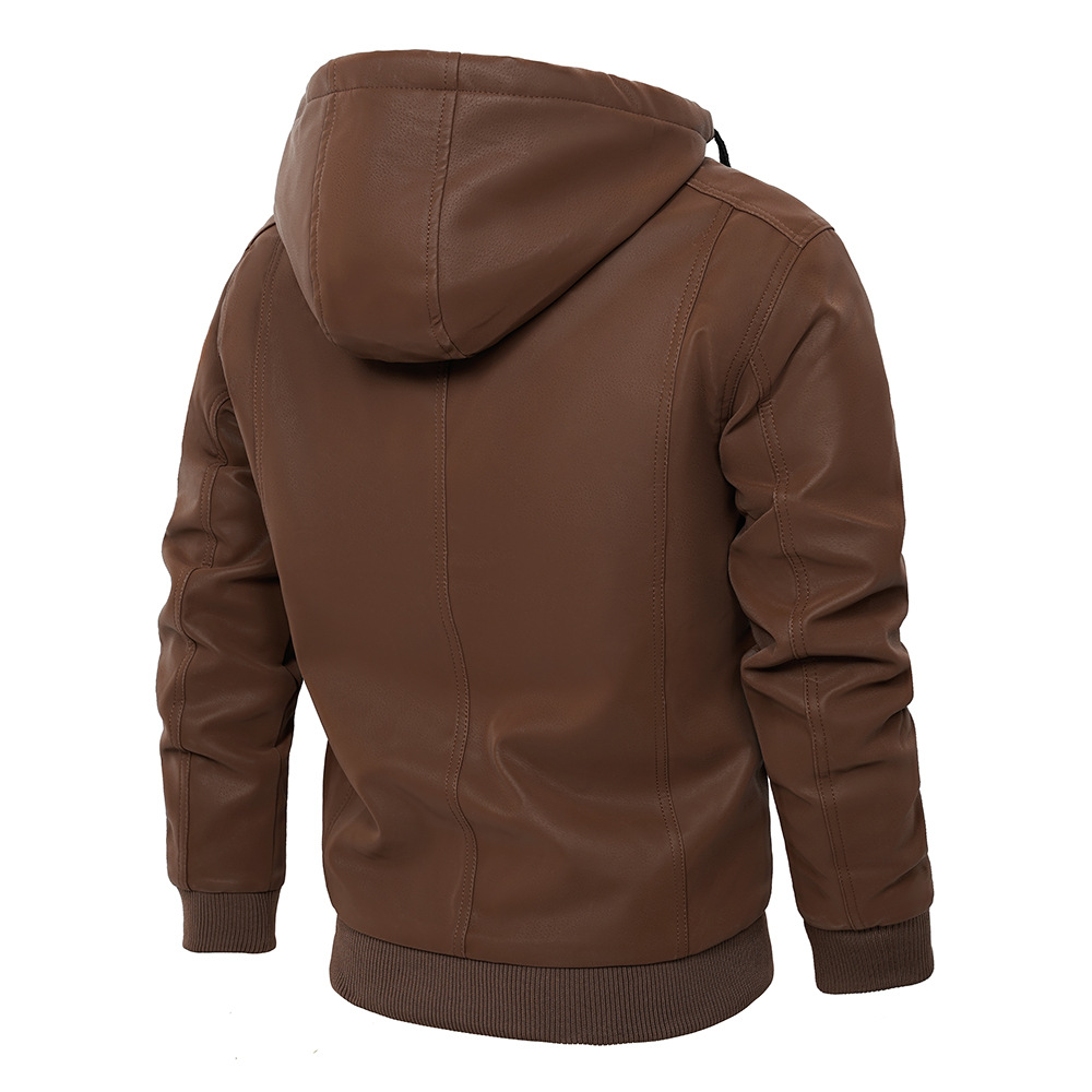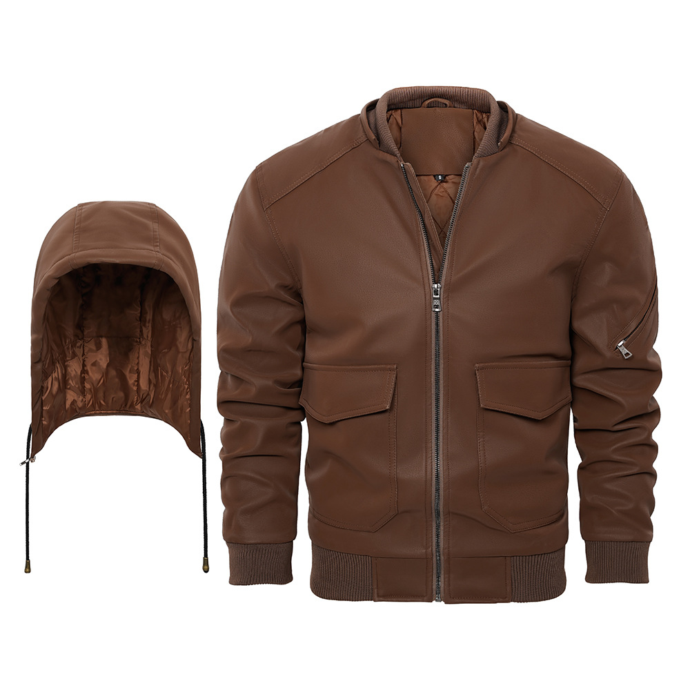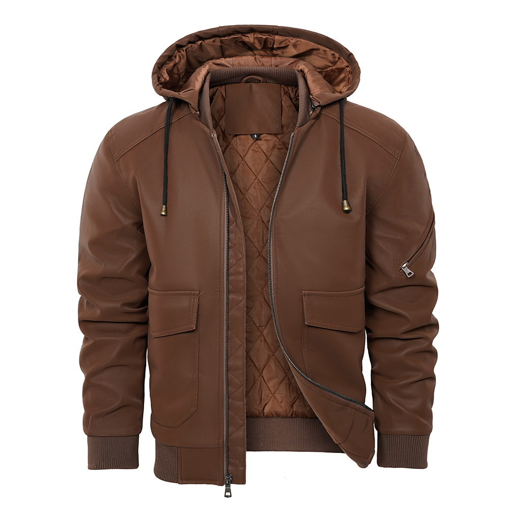 유럽과 미국 크로스 보더 후드 PU 가죽 자켓 아마존 두꺼운 가죽 남성 가을과 겨울 새로운 따뜻한 코트 유럽 사이즈