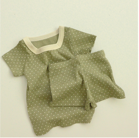 • 잔디 그린 도트 스퀘어 칼라 반팔 티셔츠/반바지