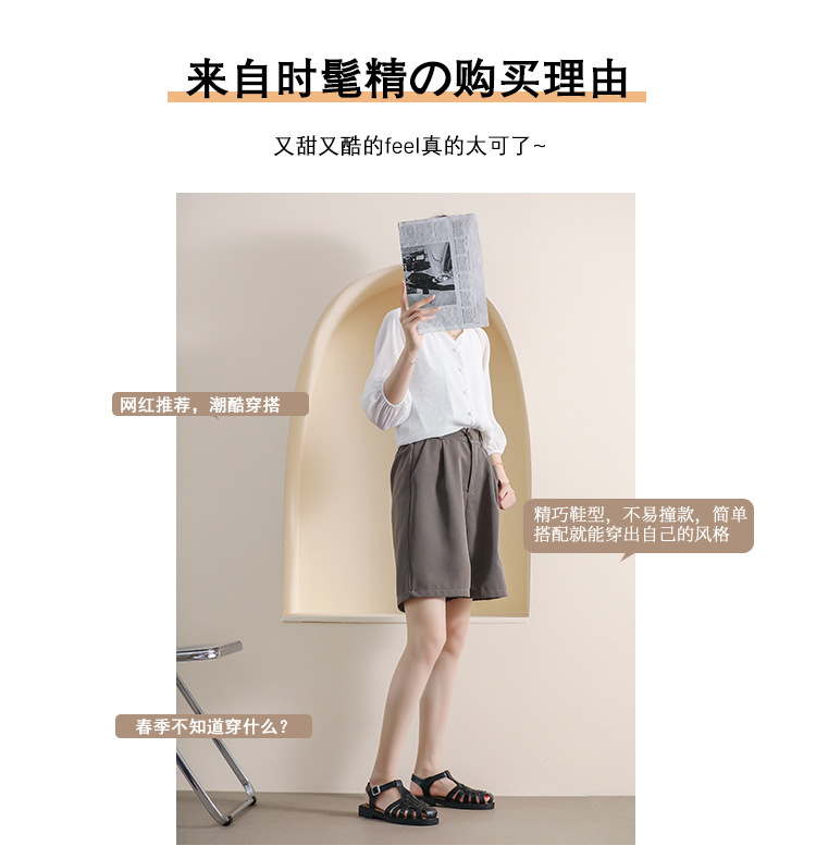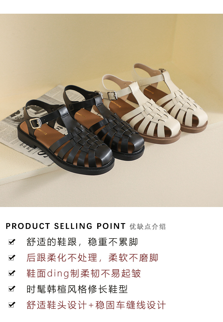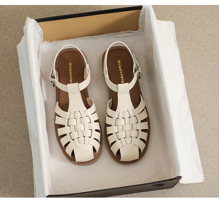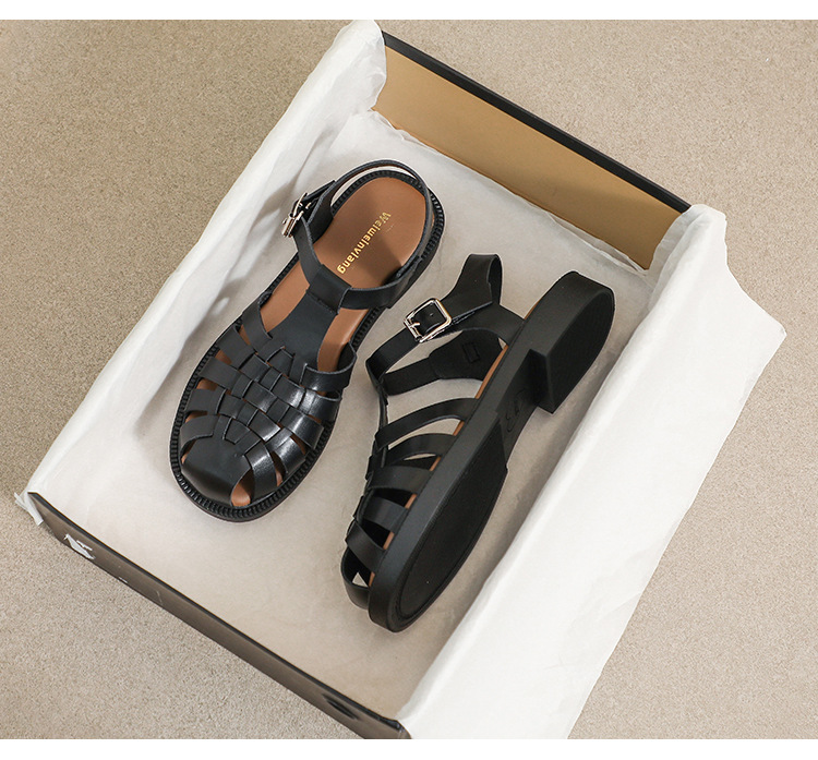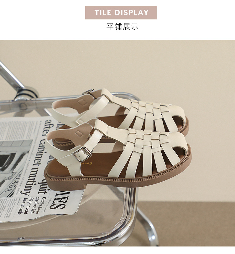 플랫 샌들 2023 새로운 여름 플러스 사이즈 복고풍 짠 로마 신발 두꺼운 바닥 발가락 빈 샌들 여성의 부드러운 바닥스토어 가기