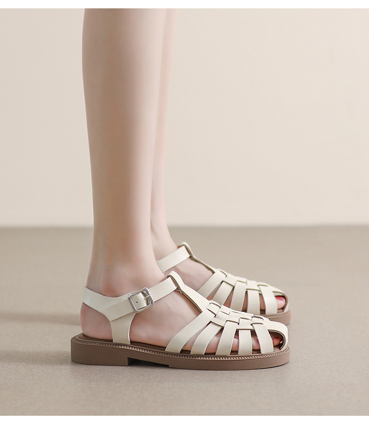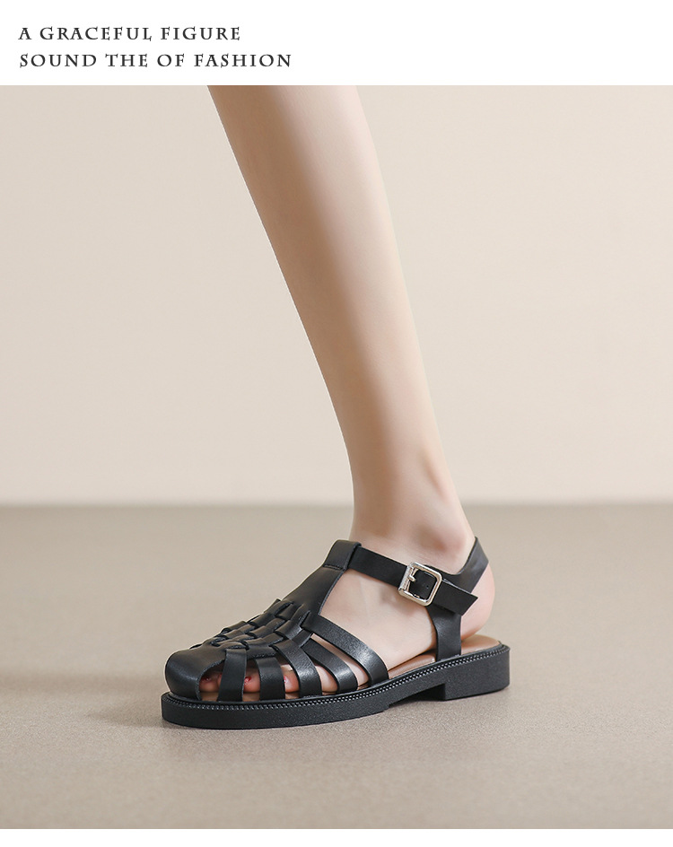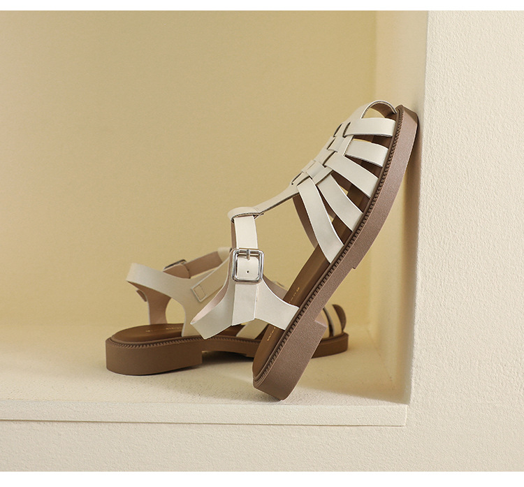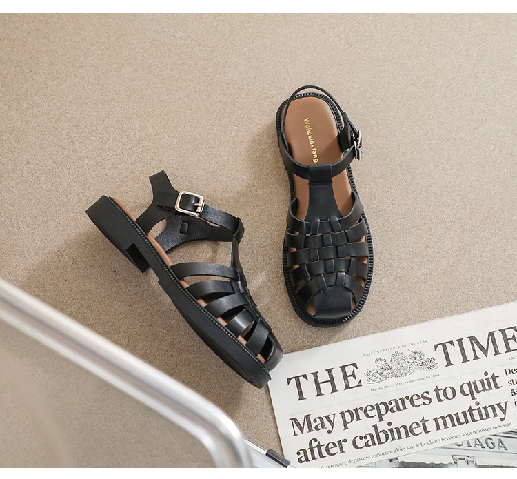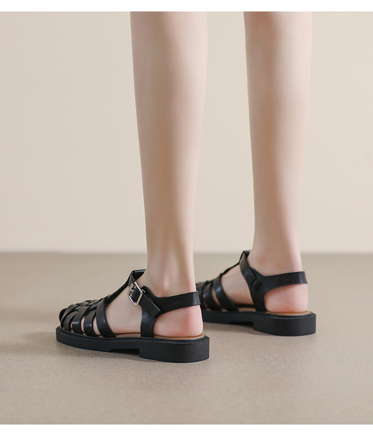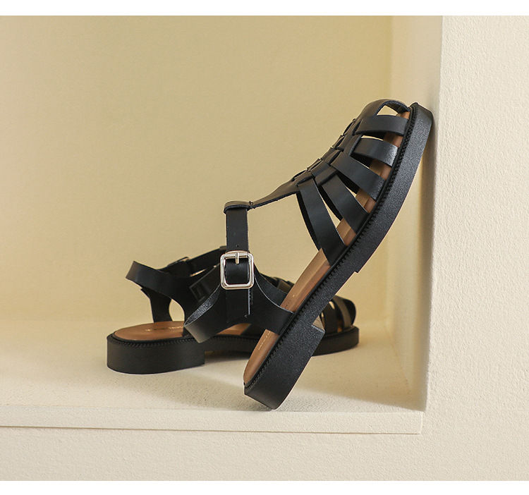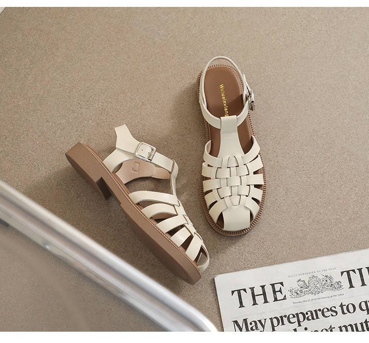플랫 샌들 2023 새로운 여름 플러스 사이즈 복고풍 짠 로마 신발 두꺼운 바닥 발가락 빈 샌들 여성의 부드러운 바닥