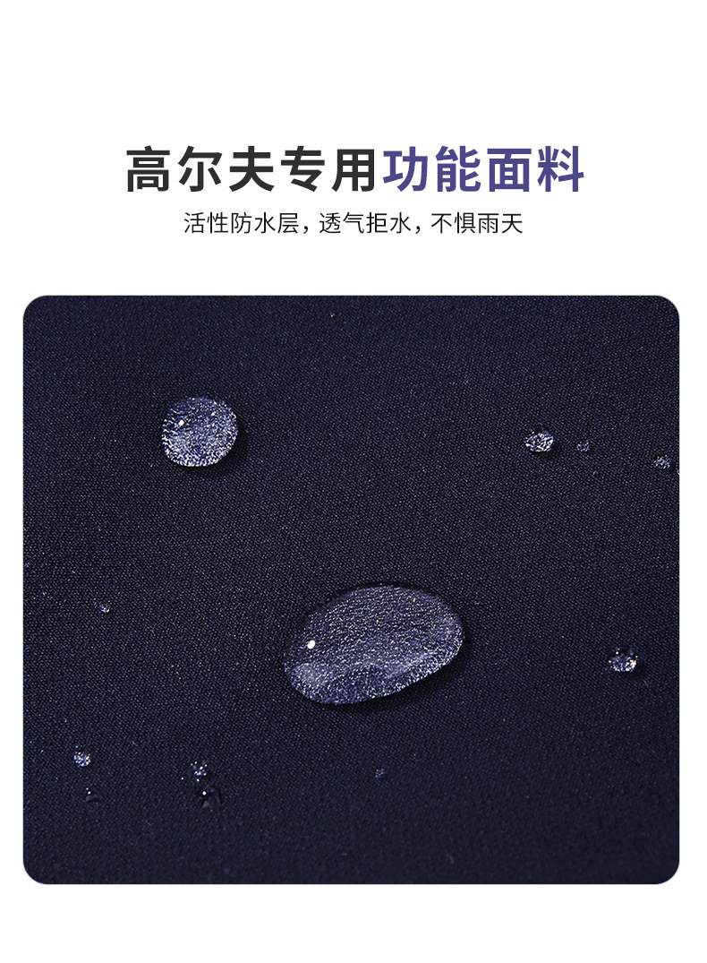 产品介绍1隐藏式拉链口袋,双向弹力;高尔夫专用功能面料,活性防水层,透气拒水