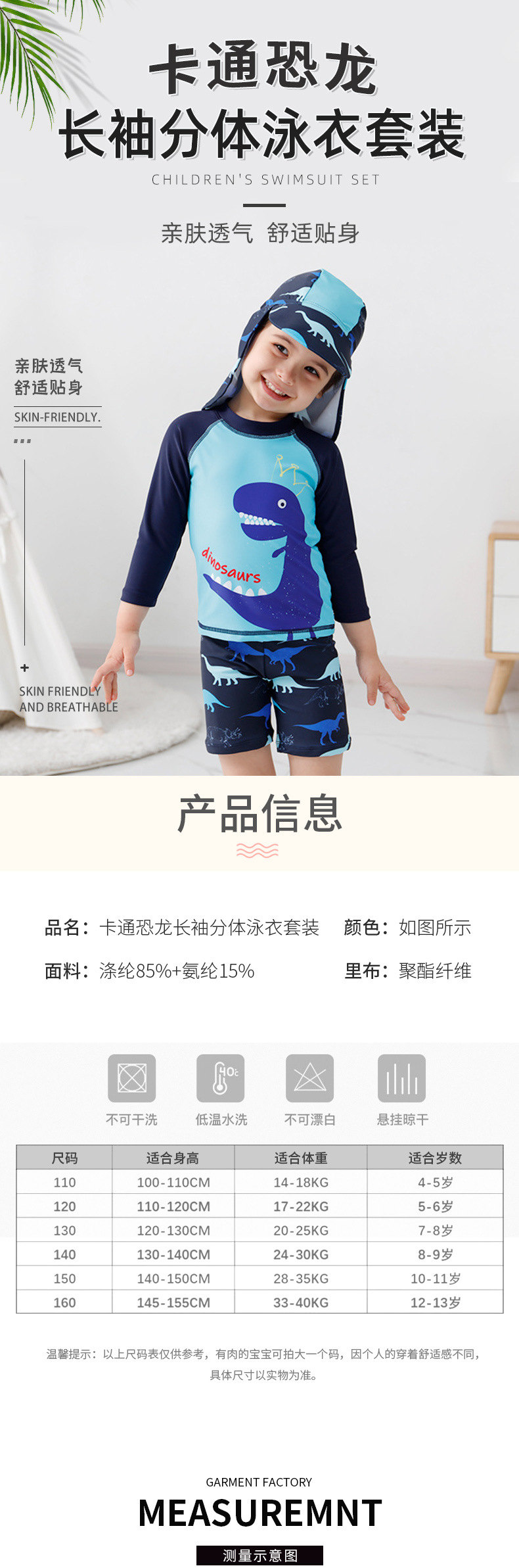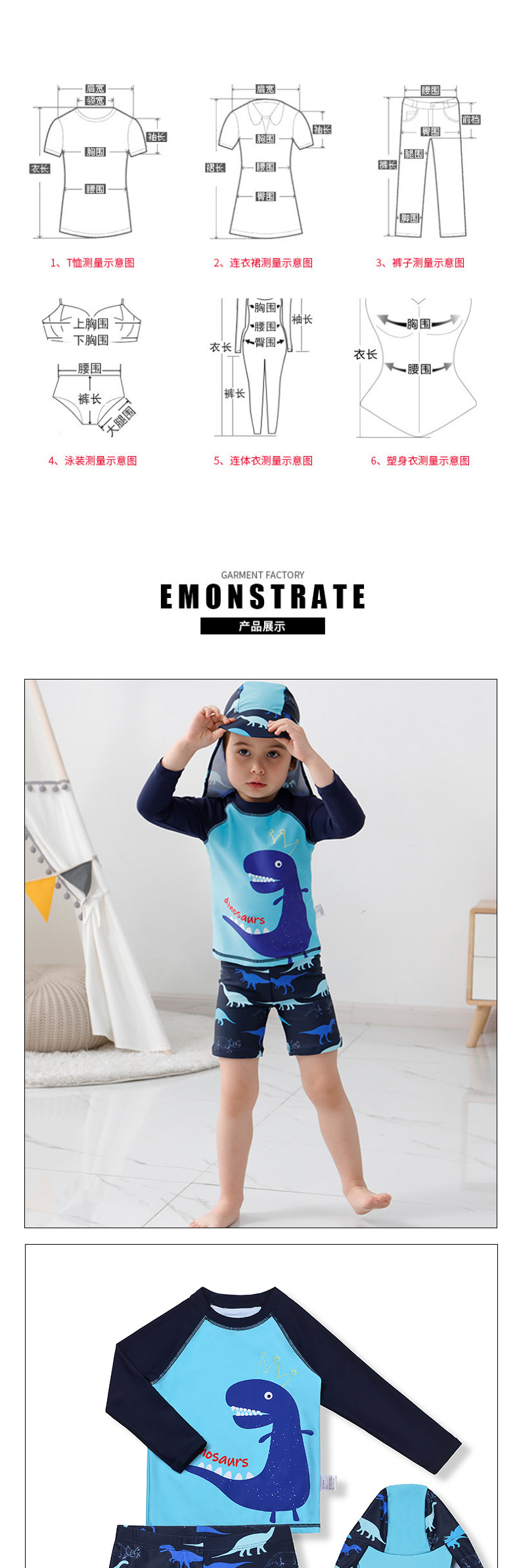 어린이 수영복 세트 남아용 분리형 한국 만화 공룡 빠른 건조 중대형 어린이 남아용 수영복 3피스 세트 수영 모자 포함스토어 가기